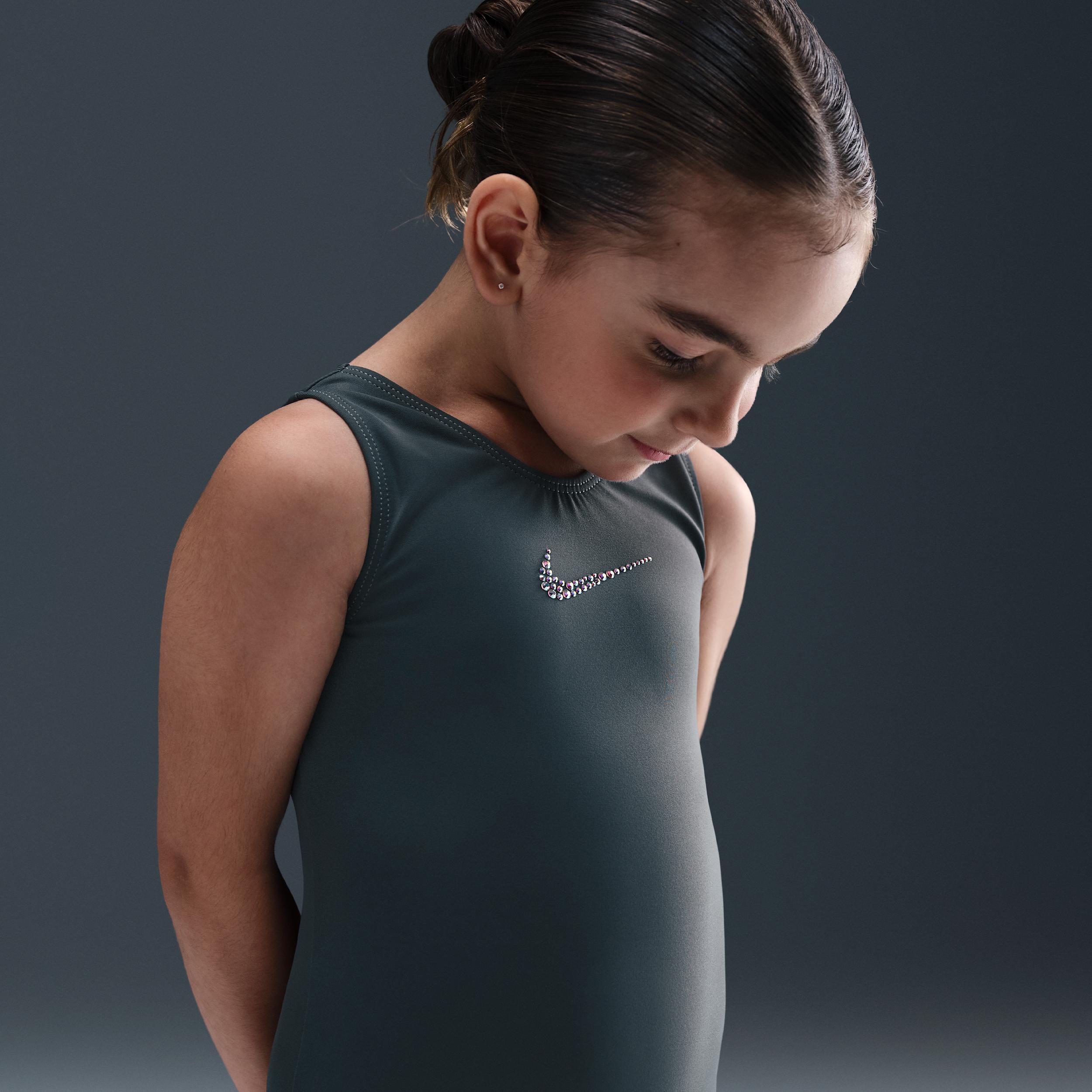 A timeless design for peak performance. This Nike leotard offers the perfect combination of classic style and essential support including a crystalized Swoosh logo on center front chest. Benefits:Premium leotard construction designed for unrestricted movement during practice. Tank leotard design for training and practice Soft fabric on front and back of leotard [] Product Details:80% Nylon / 20%Spandex. Brilliance Standard Crystals embellished Nike logo on center front chest. Imported. All garments must be washed separately. Use mild liquid detergent and gently hand wash in cold water, rinse immediately. Do NOT let garmets to soak. Hang to dry. Do NOT use fabric sofeners, dry clean, or iron. For more sizes see style NKA025. Style: NKY025; Color: Grey; Size: M; Gender: Female; Age Group: Kids | Nike Gymnastics Nike Basic Performance Leotard in Grey, Size: Medium | NKY025-076