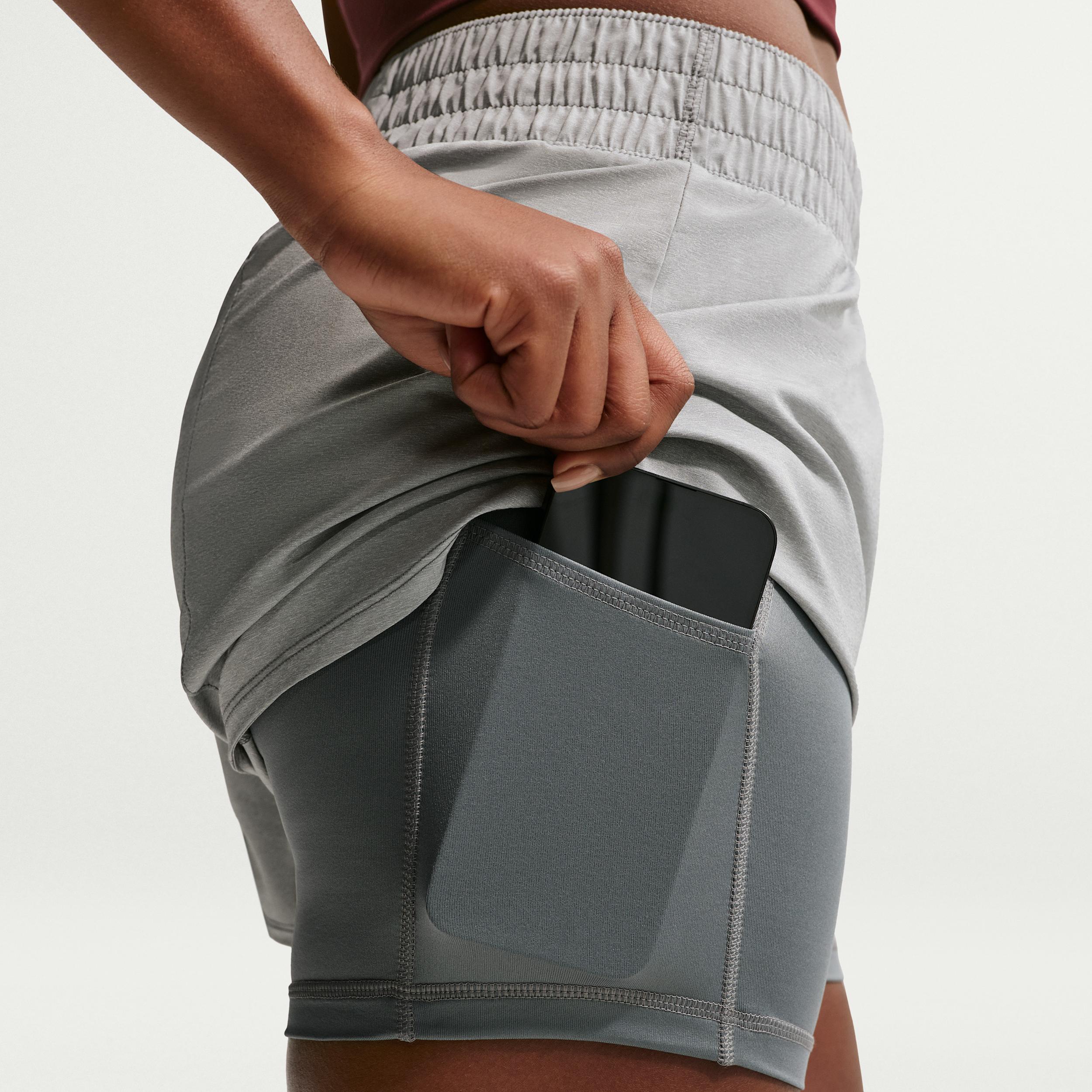 These shorts are the ones that are down for everything you doâfrom long walks to HIIT to running errands. Their silky-smooth, ultrasoft woven fabric is balanced with sweat-wicking tech so you have ultimate comfort while feeling dry as you work out. The snug inner layer helps prevent chaffing so you can push yourself with uncompromising coverage. Benefits:Nike Dri-FIT technology moves sweat away from your skin for quicker evaporation, helping you stay dry and comfortable. Waistband and interior lining pockets let you keep small items close. [] Product Details:Body:100% polyester. Tight:88% polyester/12% spandex. Gusset Lining:100% polyester. High-rise elastic waistband. Machine wash. Imported. Not intended for use as Personal Protective Equipment (PPE). Style: DX6016; Color: Smoke Grey/Heather/White; Size: XS; Gender: Female; Age Group: Adult | Nike One Women's Dri-FIT High-Waisted 3" 2-in-1 Shorts in Grey, Size: XS | DX6016-085