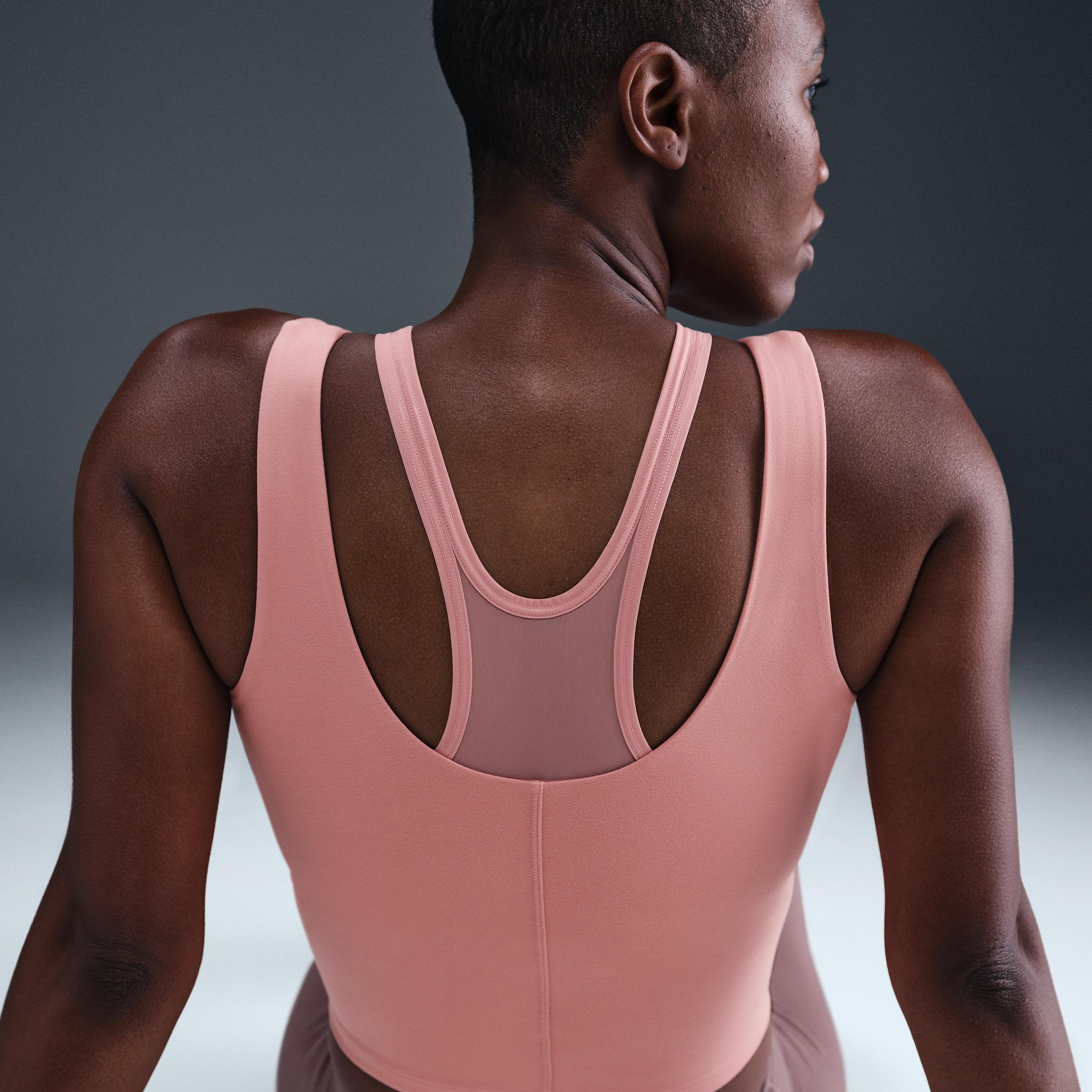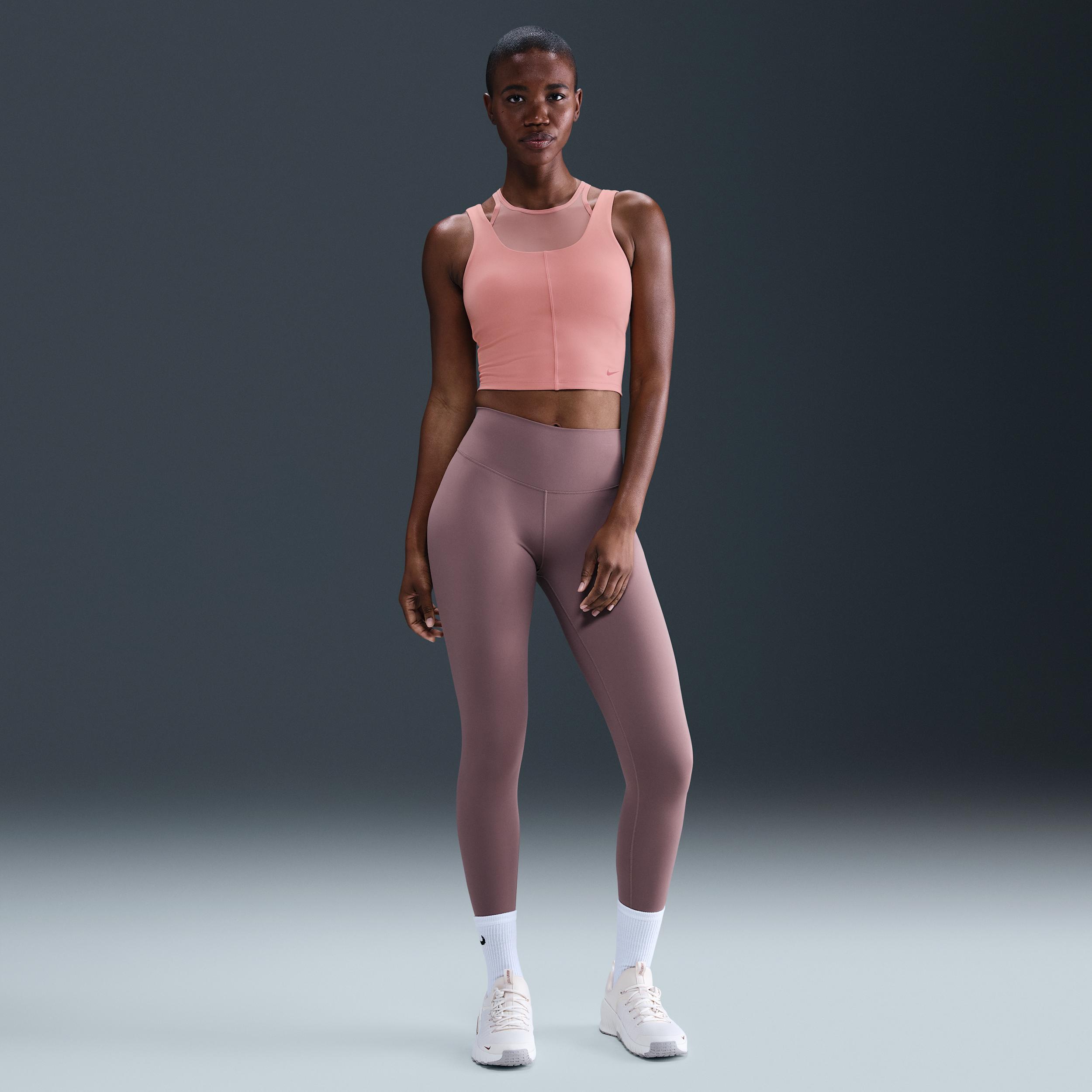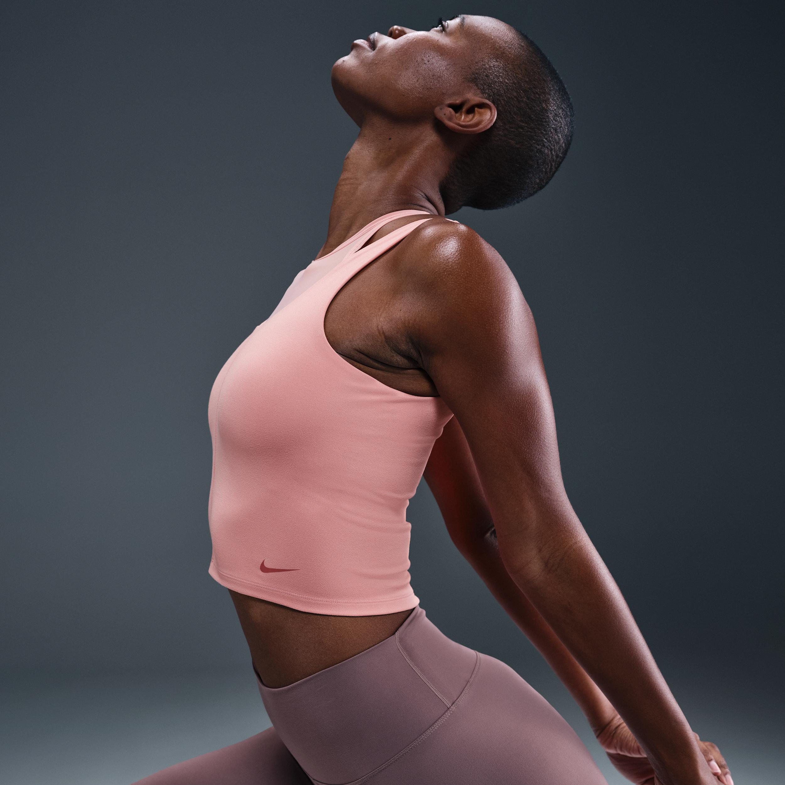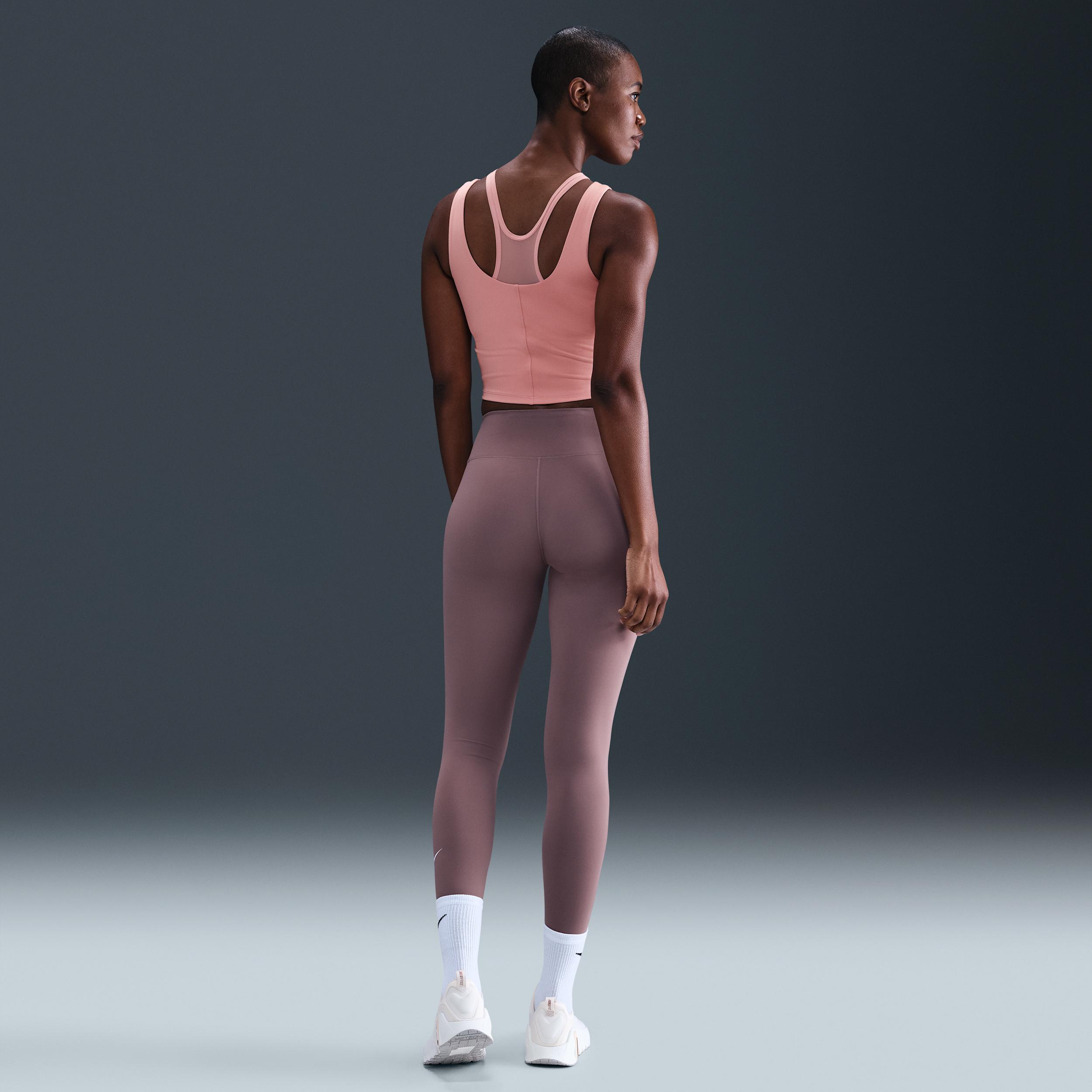 Nike One works for it all. This top's midweight, peachy-soft fabric stretches with you while it wicks sweat, helping you stay comfortable in any activity. Nike One for All:Cropped and fitted not your thing? Try a Nike One Classic top for an easier fit that's still sleek, available in multiple lengths. Wanna lean into the comfort of your favorite tee but still work up a sweat? Try a Nike One Relaxed top. Stay Comfortable:Nike Dri-FIT technology moves sweat away from your skin for quicker evaporation, helping you stay dry and comfortable. A sheer panel on the chest offers breathability with a bit of subtle coverage. [] Product Details:Body:80% polyester/20% spandex. Panels:72% polyester/28% spandex. Panels lining:88% polyester/12% spandex. Shelf bra liner. Printed Swoosh logo. Machine wash. Imported. Style: HV3653; Color: Rust Pink/Canyon Rust; Size: M; Gender: Female; Age Group: Adult | Nike One Fitted Women's Dri-FIT Cropped Tank Top in Pink, Size: Medium | HV3653-685