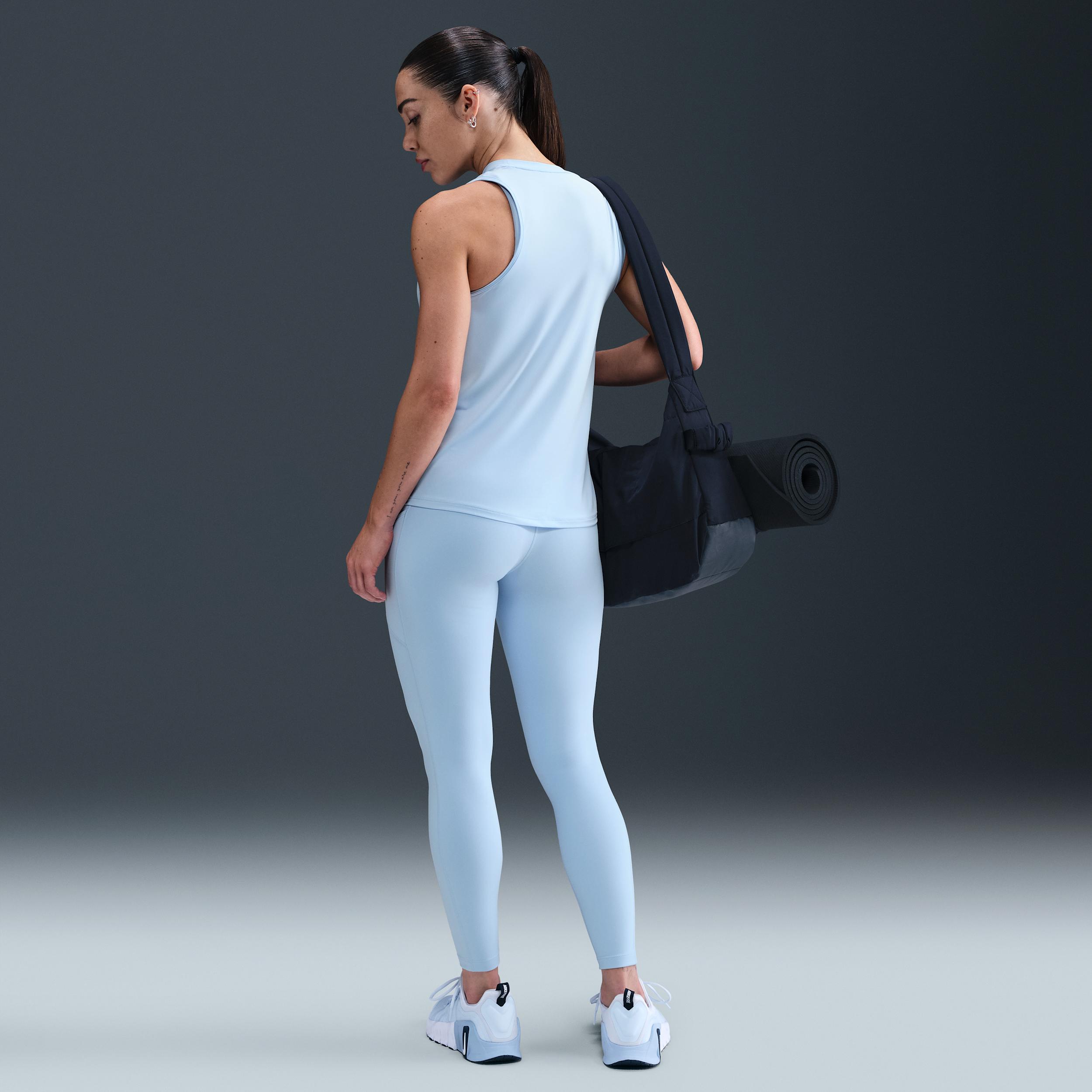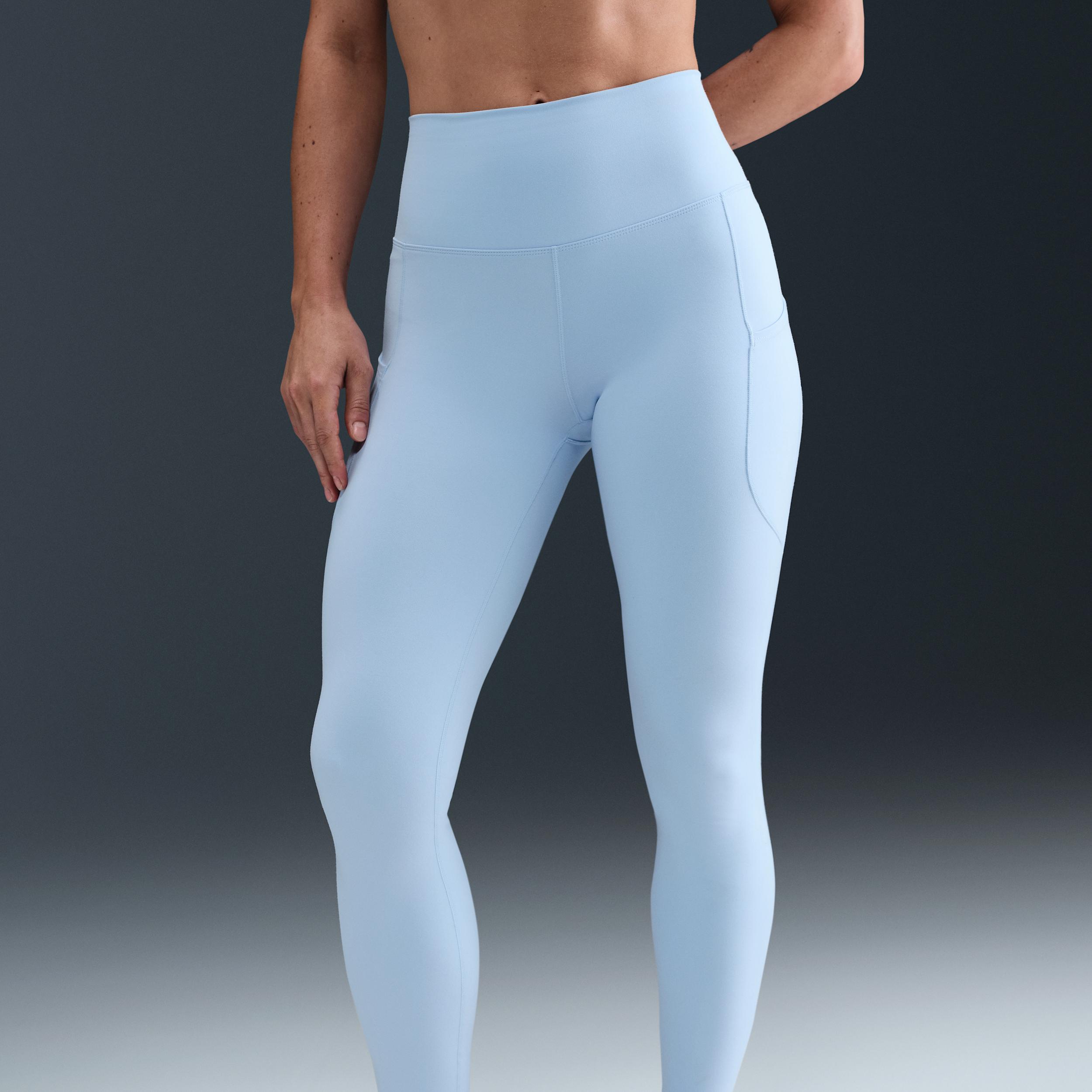 Up for a workout or down to chill, these leggings are the Ones that are ready for whatever you are. Their midweight, peachy-soft fabric stretches with your every move and dries quickly. Plus, a high waist is designed to meet your favorite cropped tops for a head-to-toe look that you can feel confident and comfortable in all day long. Confident Coverage:Non-sheer fabric and a high waist help keep your butt covered no matter how deep you bend and stretch. Fewer seams make for a smooth, flattering fit. Bonus:The waistband is lined with mesh for a stay-put design that's extra supportive. Ready for it All:A drop-in pocket in the back of the waistband is large enough to hold your smartphone. External thigh pockets let you keep more essentials close. Stay Dry:Nike Dri-FIT technology moves sweat away from your skin for quicker evaporation, helping you stay dry and comfortable. Something for Every One:No One works for everything, and that's why we're offering these leggings in multiple lengths for every activity and every mood. Plus, they pair perfectly with any of our Nike One tops and bras, available in several colors to complete your look. [] Product Details:Body:80% polyester/20% spandex. Gusset lining:100% polyester. Machine wash. Imported. Not intended for use as Personal Protective Equipment (PPE). Style: FN3241; Color: Celestine Blue; Size: XS; Gender: Female; Age Group: Adult | Nike One Women's High-Waisted 7/8 Leggings with Pockets in Blue, Size: XS | FN3241-441