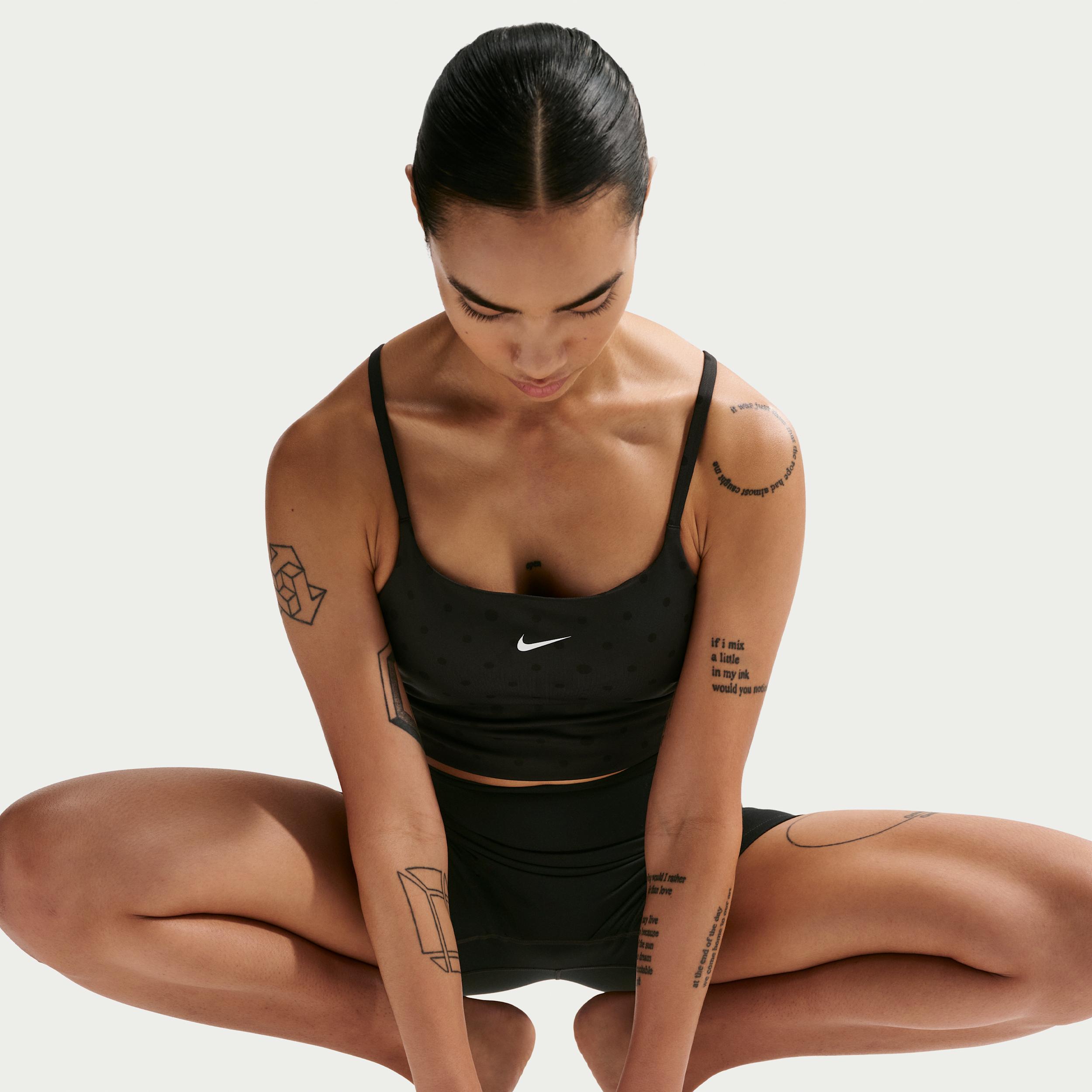 All-day comfort or low-impact workouts, this bra is the One. Its light support gives you a gentle hold with plenty of freedom and midweight, peachy-soft fabric stretches with you and dries quickly. Benefits:Nike Dri-FIT technology moves sweat away from your skin for quicker evaporation, helping you stay dry and comfortable. Light support gives you a gentle hold with plenty of freedom that's great for low-impact workouts or all-day comfort. Midweight, peachy-soft fabric stretches with your every move and dries quickly. Convertible, adjustable straps let you switch up your look. Removable pads let you choose your coverage. [] Product Details:Body/Panels lining:80% polyester/20% spandex. Upper front lining/Interlining:84% polyester/16% spandex. Pad back/top fabric:100% polyester. Pad:100% polyurethane. Machine wash. Imported. Style: IQ0162; Color: Black/Black/White; Size: XL; Gender: Female; Age Group: Adult | Nike One Women's Light-Support Padded Printed Sports Bra in Black, Size: XL | IQ0162-010