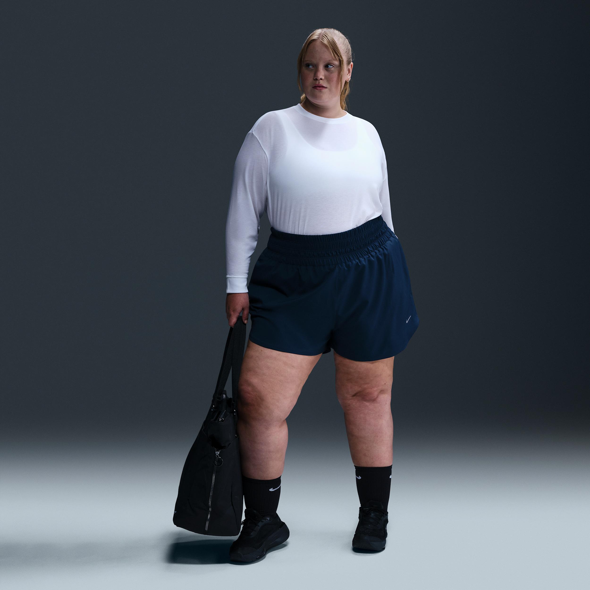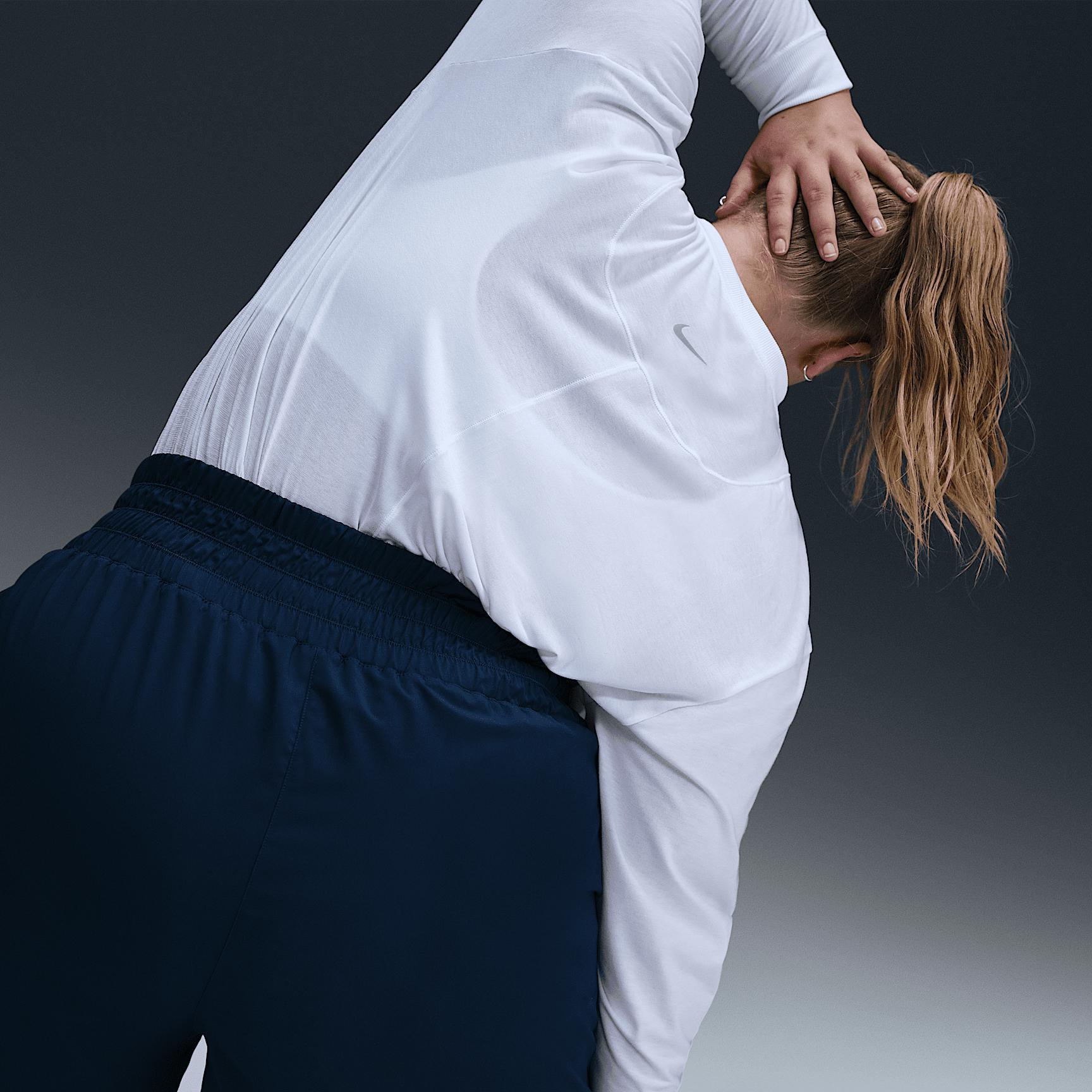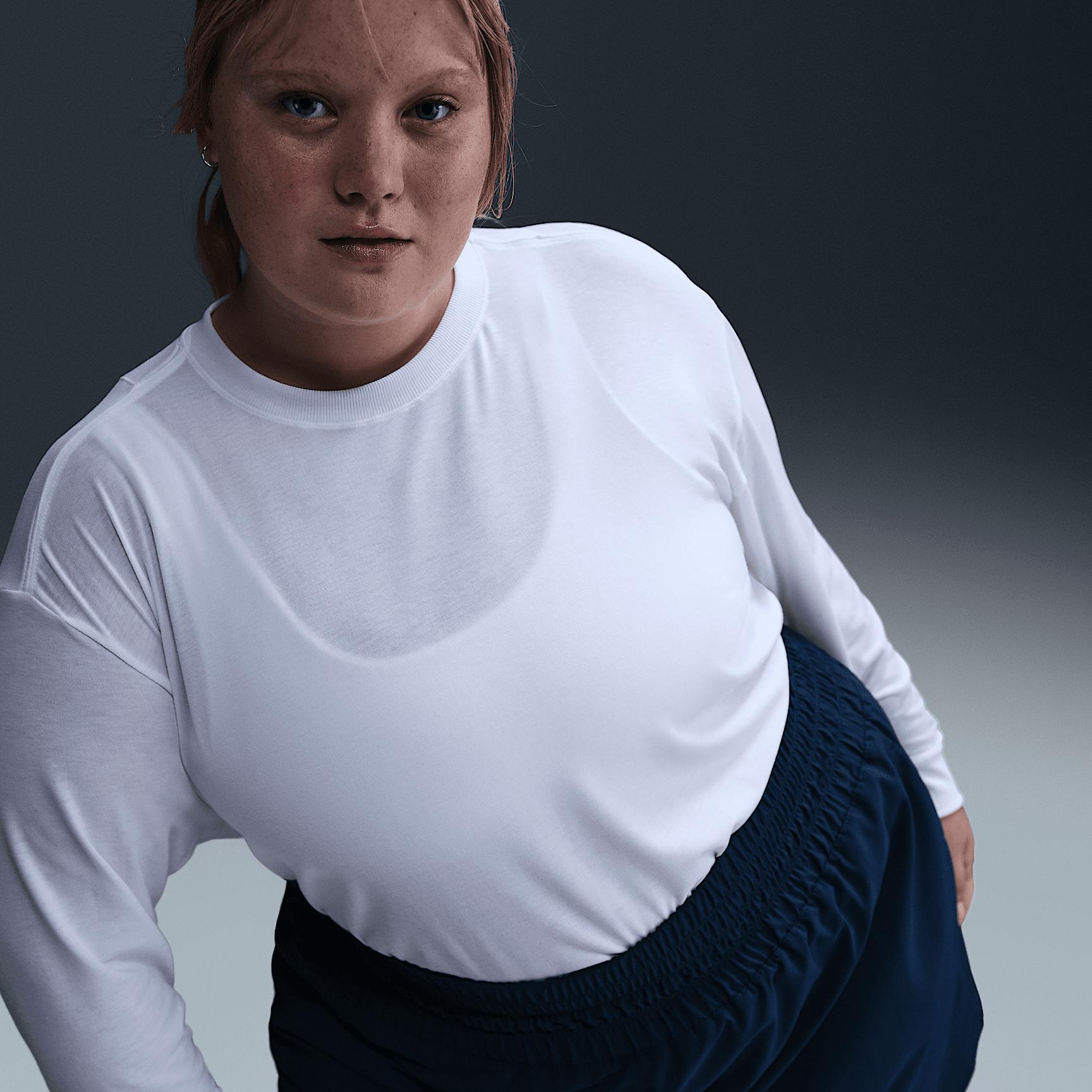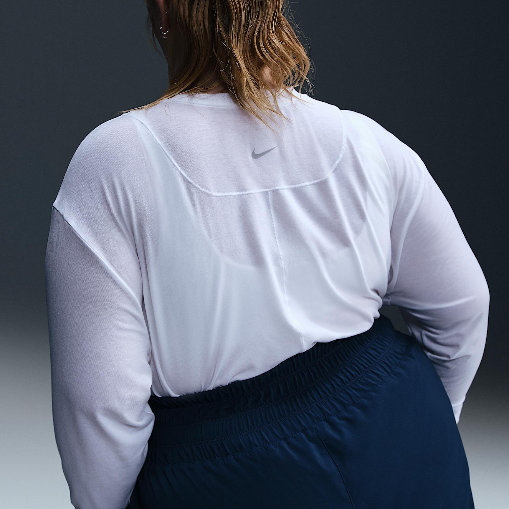 Up for a workout or down to chill, this Nike One Relaxed top is ready for whatever you are. Slightly textured, incredibly lightweight jersey fabric dries quickly and drapes you in comfort that goes with any activity. A loose, roomy fit and extended length help keep you covered and cozy from your morning stroll to your evening wind-downand at all the stops in between. Nike One for All:For years, Nike One has been a partner to you on your fitness journey, but we recognize that fitness doesnt lookor feelthe same for everyone. Looking for something more tailored and polished? Check out Nike One Fitted cropped tops. Or try a Nike One Classic top for an easy fit thats still sleek, available in a variety of lengths to meet your needs. All-Day Comfort and Versatility:A ribbed neckline and cuffs enhance the favorite-tee feeling and help keep the top in place while you move. A longer length is easy to tie up and customize for looks that go with everything you do in a day. More Benefits:Nike Dri-FIT technology moves sweat away from your skin for quicker evaporation, helping you stay dry and comfortable. Curved hem helps keep you covered as you move. Product Details:81% polyester/13% cotton/6% spandex. Machine wash. Imported. Reflective logo at center back. Not intended for use as Personal Protective Equipment (PPE). Style: FN2819; Color: White/Black; Size: 2X; Gender: Female; Age Group: Adult | Nike One Relaxed Womens Dri-FIT Long-Sleeve Top (Plus Size) in White, Size: 2X | FN2819-100