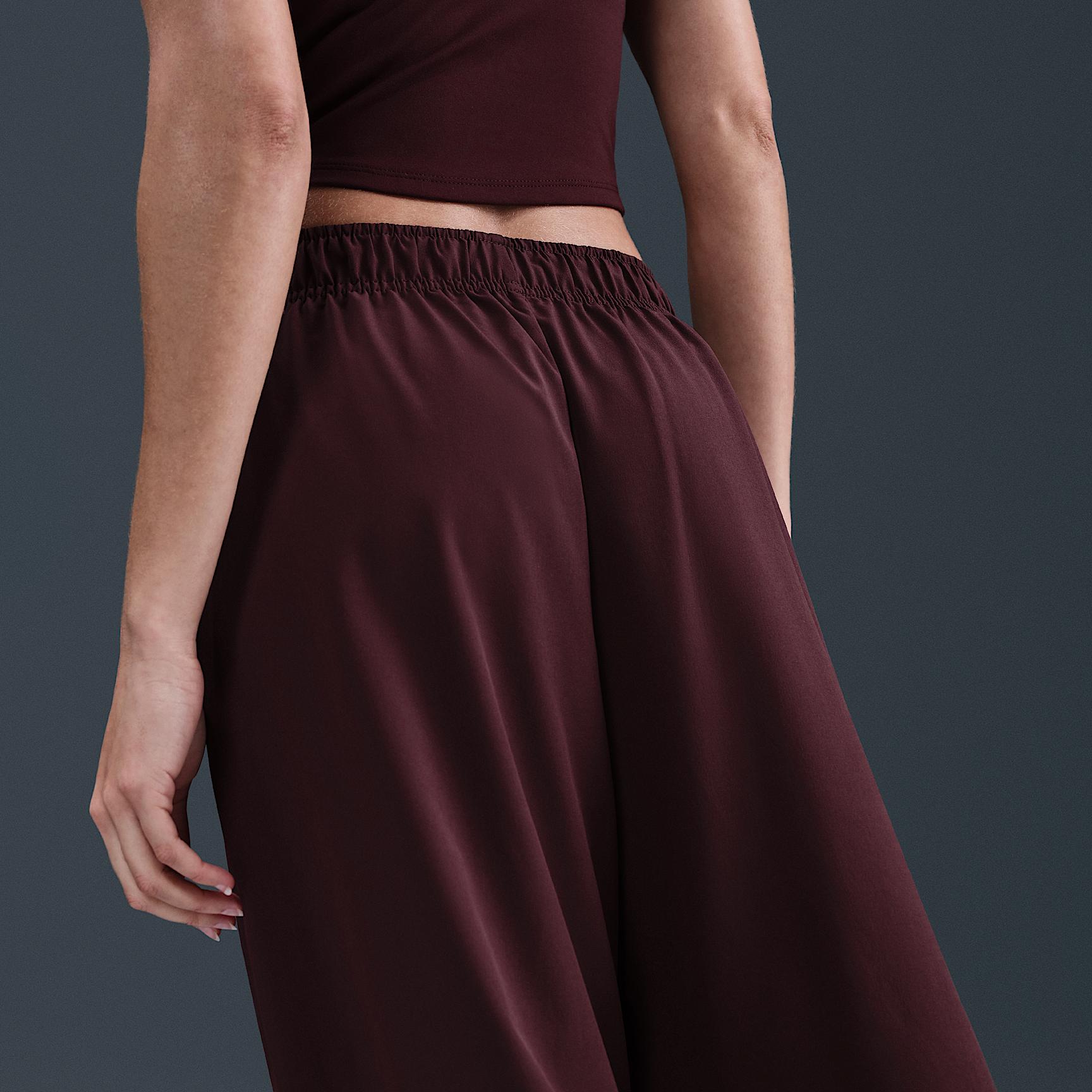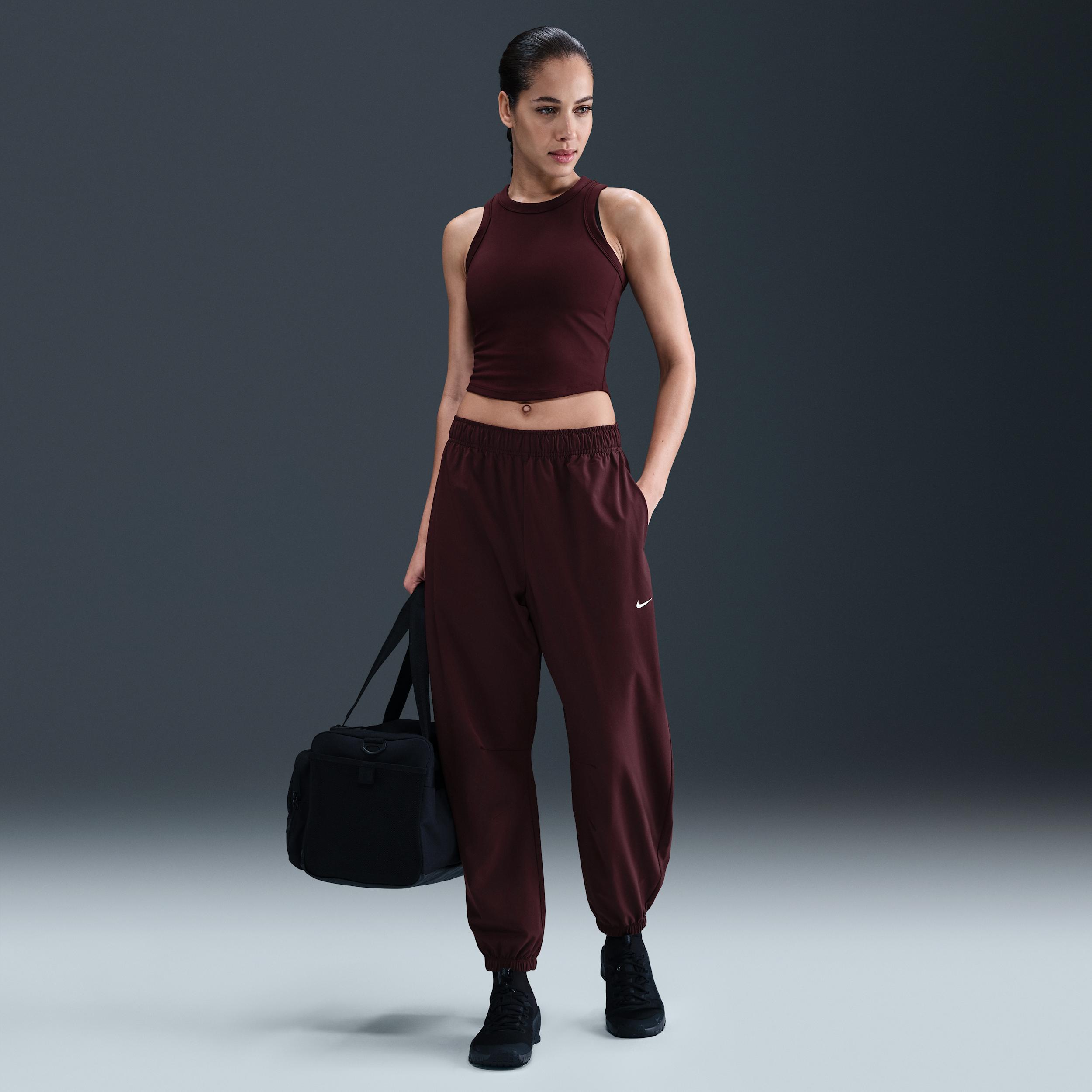Nike One works for it all. Lightweight and water-repellent, these roomy woven pants stretch with you through every move. Benefits:Water-repellent finish helps keep you dry in wet weather. Side pockets are lined with sweat-wicking mesh to help keep your essentials dry [] Product Details:Encased elastic waistband with drawcord. Elastic cuffs. Printed Swoosh logo on left thigh. Body:85% polyester/15% spandex. Mesh:100% polyester. Machine wash. Imported. Style: IH8611; Color: Burgundy Crush/White; Size: XL; Gender: Female; Age Group: Adult | Nike One Women's Repel High-Waisted Woven Pants in Red, Size: XL | IH8611-652