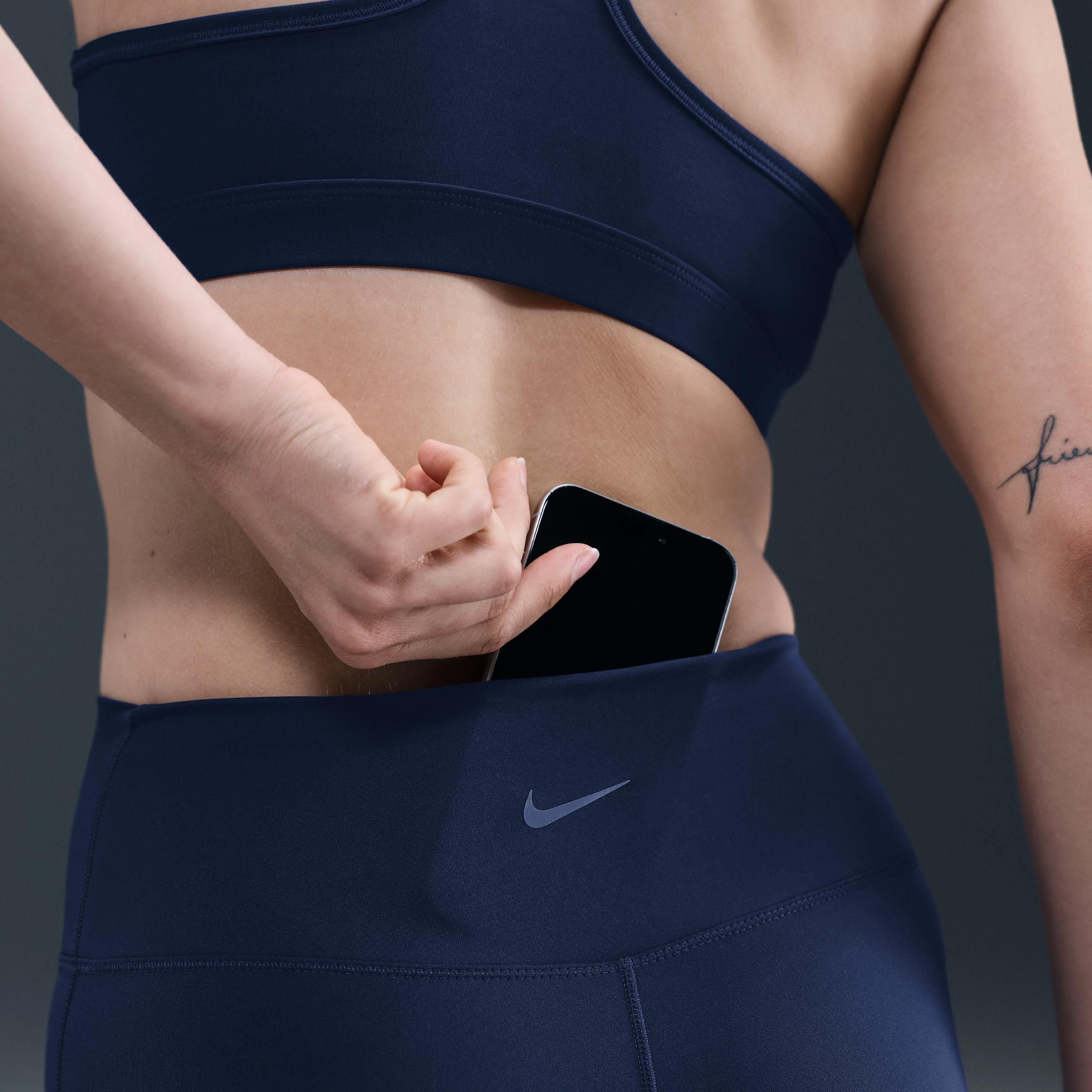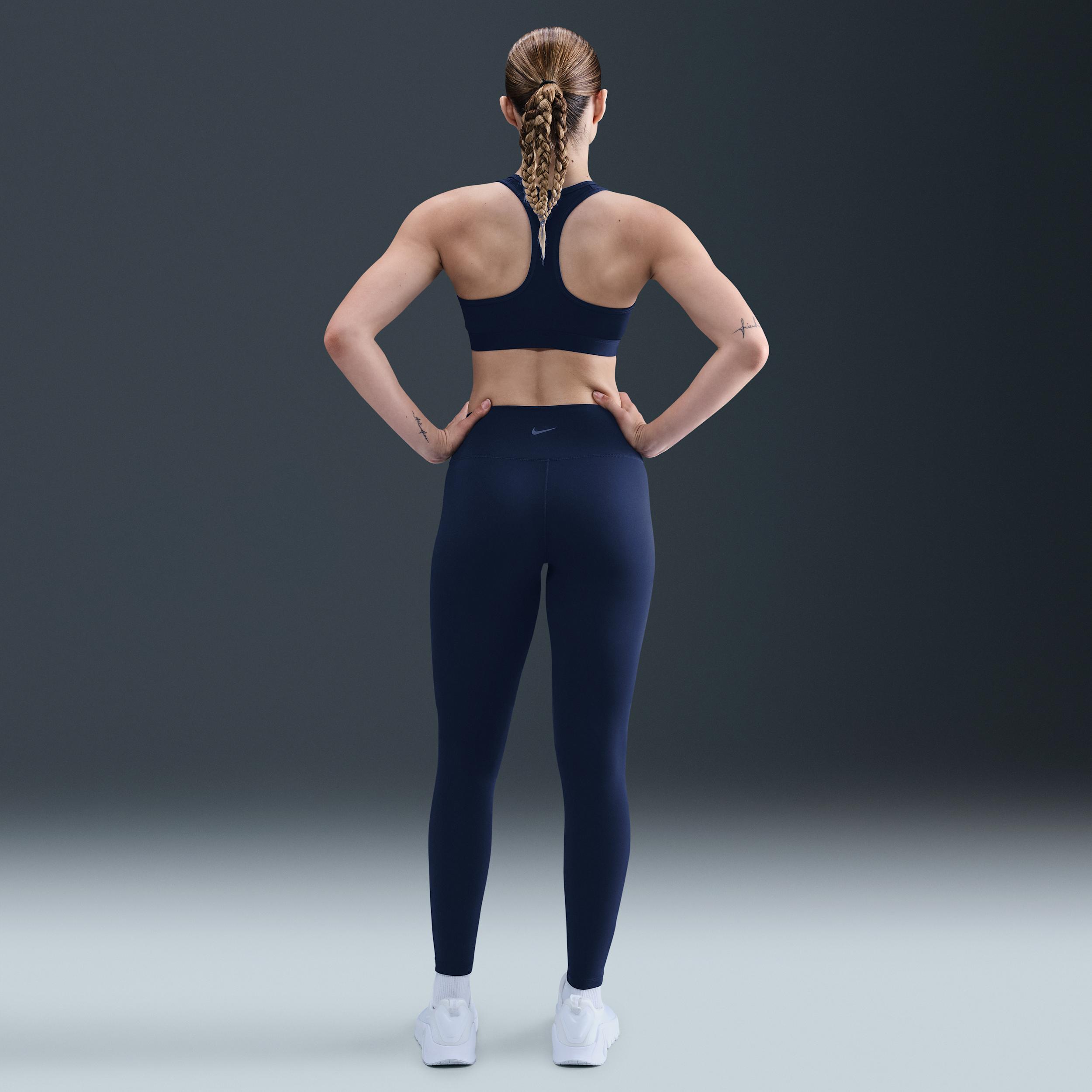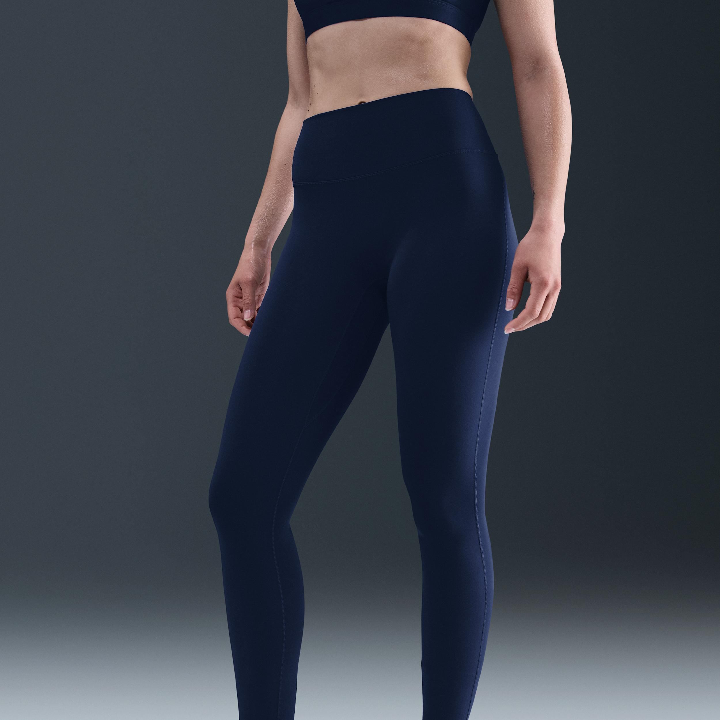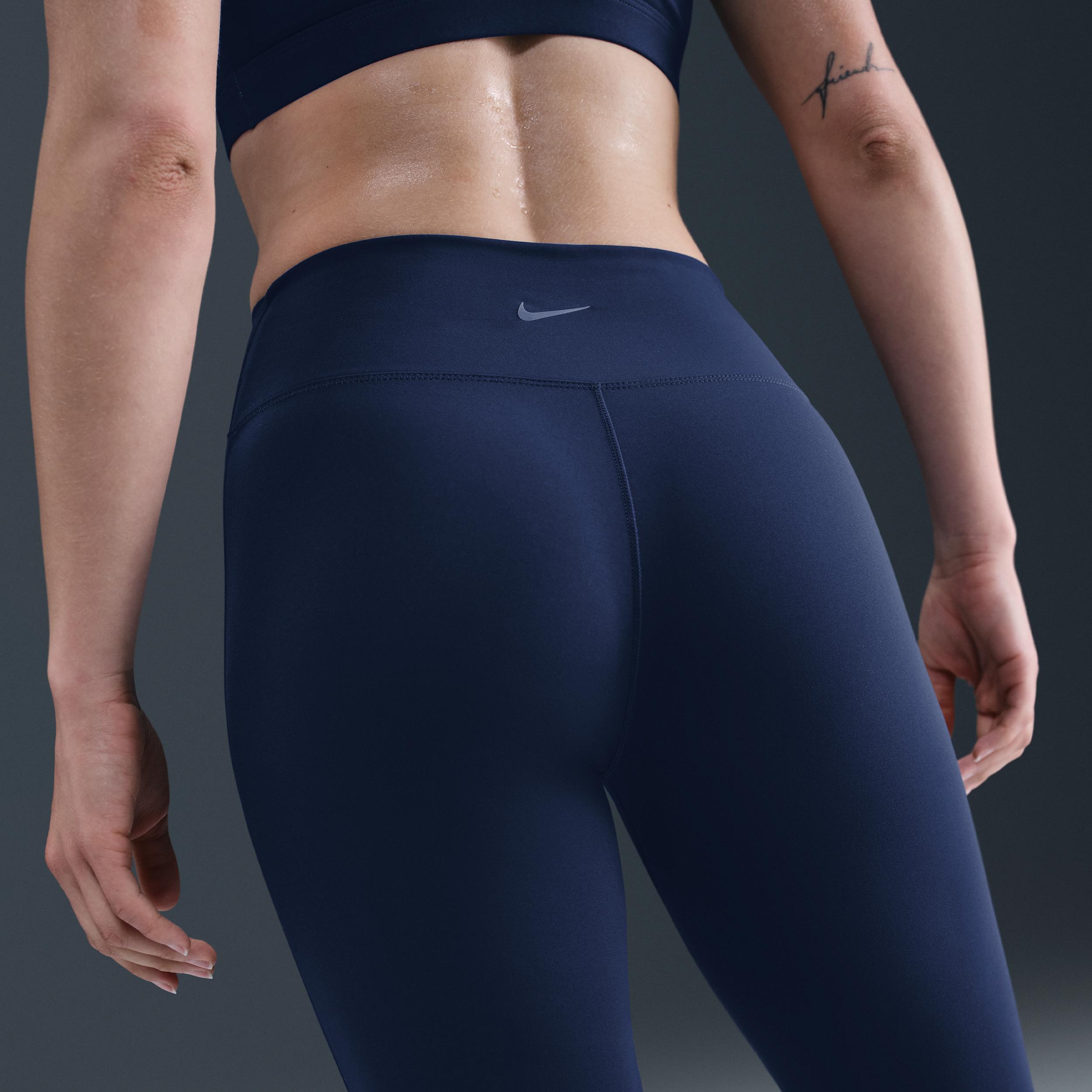 Up for a workout or down to chill, these leggings are the Ones that are ready for whatever you are. Their midweight, peachy-soft fabric stretches with your every move and dries quickly. The absence of a front seam helps keep the fabric from riding up for a smooth fit. Something for Every One:No One works for everything, and that's why we're offering these leggings in multiple lengths for every activity and every mood. Plus, they pair perfectly with any of our Nike One tops and bras, available in several colors to complete your look. Confident Coverage:Non-sheer fabric and a high waist help keep your butt covered no matter how deep you bend and stretch. Fewer seams make for a smooth, flattering fit. More Benefits: Nike Dri-FIT technology moves sweat away from your skin for quicker evaporation, helping you stay dry and comfortable. Back pocket fits most phones. Product Details:Body/Waist lining:80% polyester/20% spandex. Gusset lining:100% polyester. Machine wash. Imported. Not intended for use as Personal Protective Equipment (PPE). Style: HJ9195; Color: Midnight Navy/White; Size: 2XL; Gender: Female; Age Group: Adult | Nike One Seamless Front Women's High-Waisted Full-Length Leggings in Blue, Size: 2XL | HJ9195-410