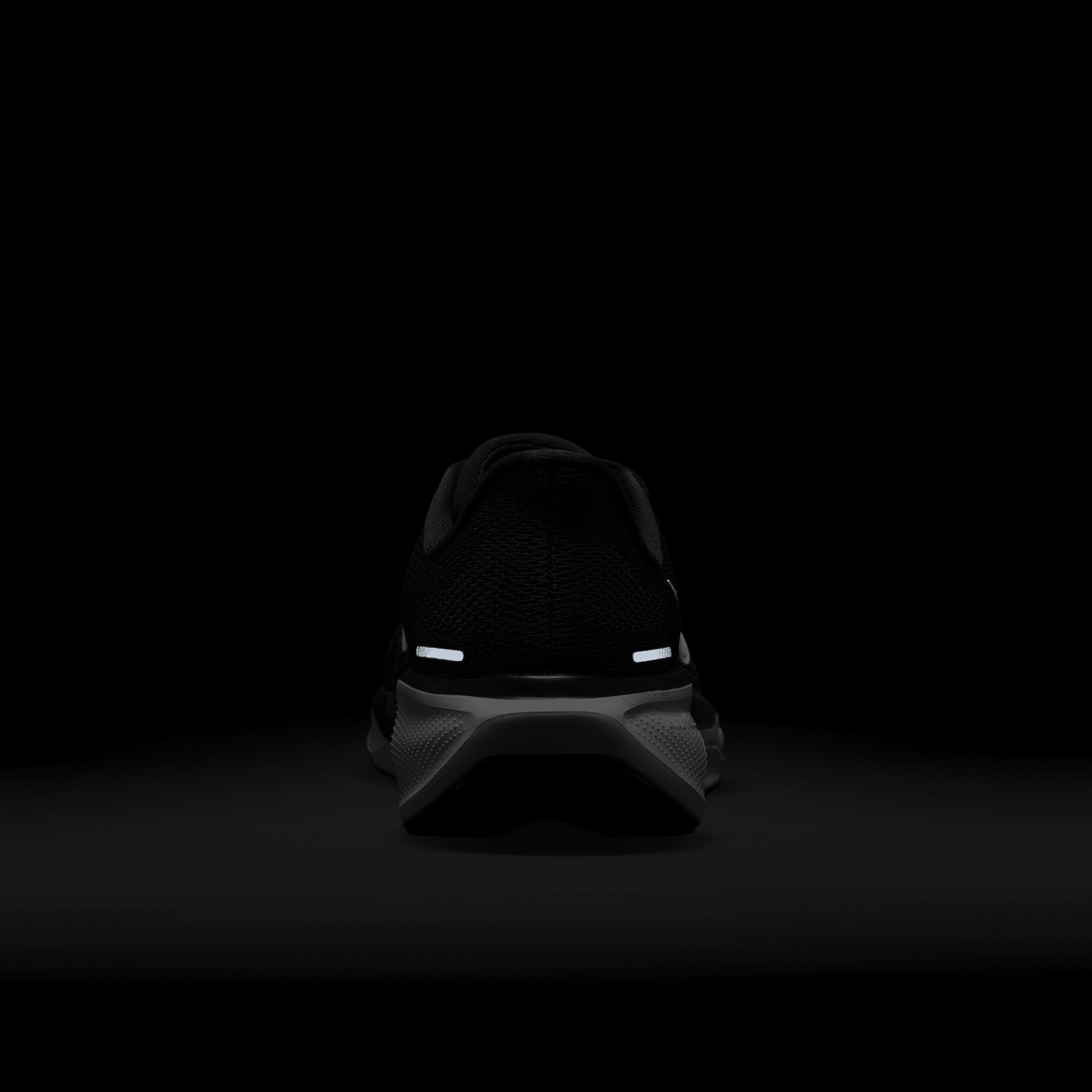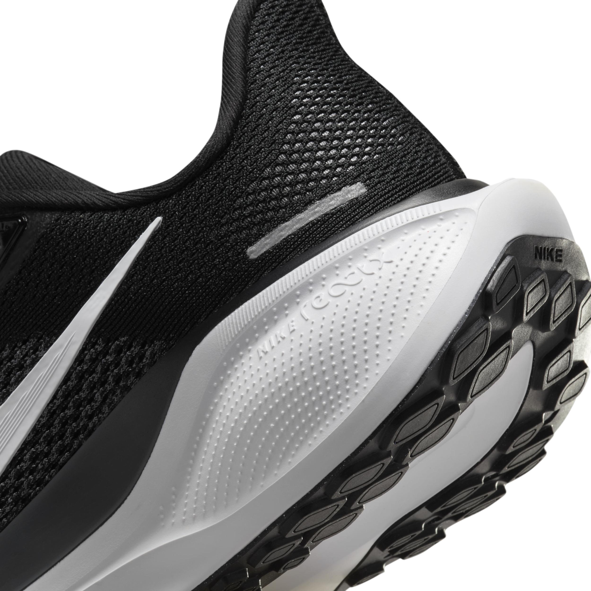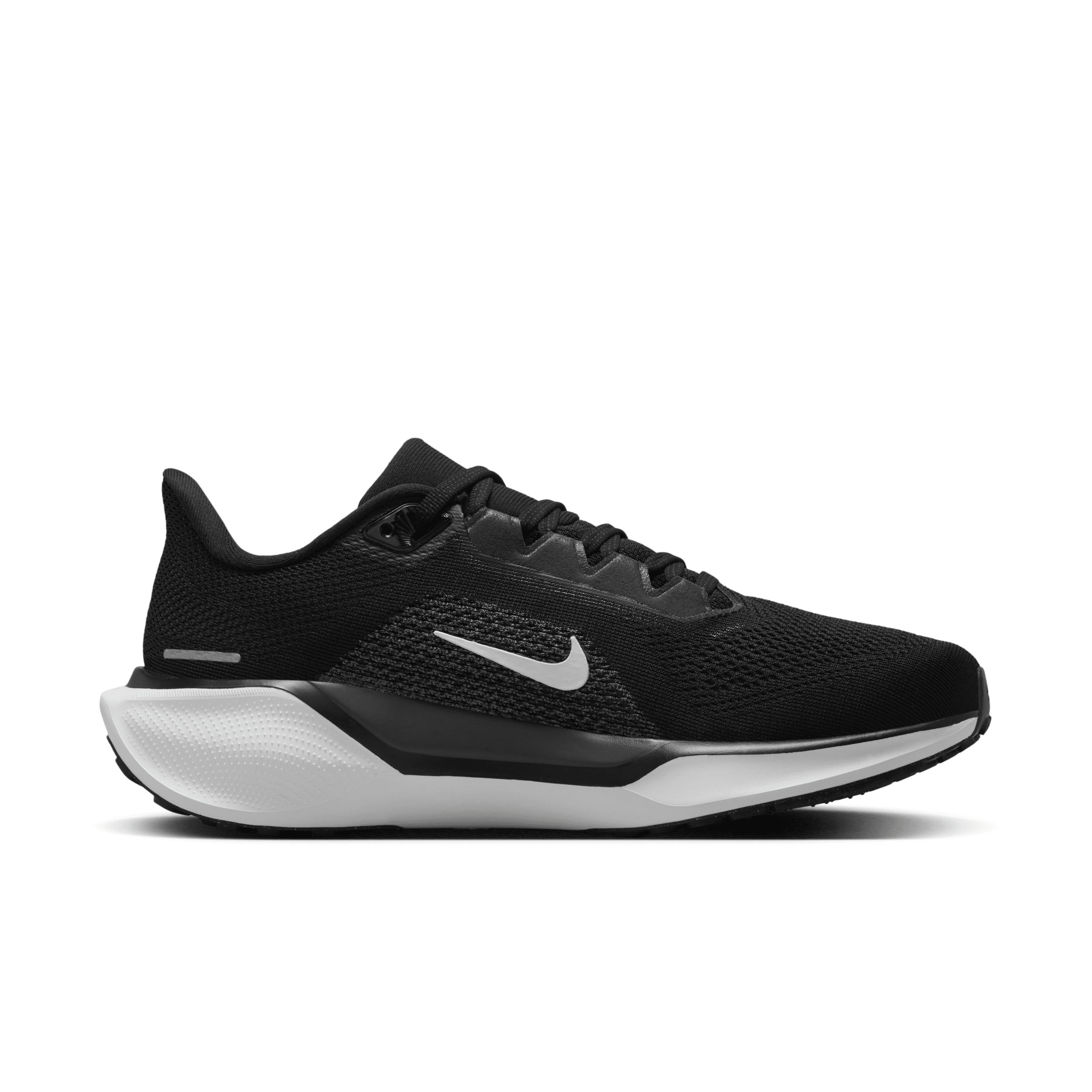 Responsive cushioning in the Pegasus provides an energized ride for everyday road running. Experience lighter-weight energy return with dual Air Zoom units and a ReactX foam midsole. Plus, improved engineered mesh on the upper decreases weight and increases breathability. Benefits:Upgraded breathable engineered mesh upper ReactX foam midsole surrounds forefoot and heel Air Zoom units for an energized ride. Signature waffle-inspired rubber outsole for traction and flexibility Plush collar, tongue and sockliner for a secure and comfortable fit What's new? All-new ReactX foam midsole is 13% more responsive than previous React technology. Crafted for performance and planet, ReactX foam is engineered to reduce its carbon footprint by at least 43% in a pair of midsoles due to reduced manufacturing process energy compared to prior React foam. The carbon footprint of ReactX is based on cradle-to-gate assessment reviewed by PRé Sustainability B.V and Intertek China. Other midsole components such as airbags, plates or other foam formulations were not considered. Product Details:Weight: Approx. 251 g/8.8 oz (Women's US 8). Heel-to-toe drop: 10 mm. MR-10 Last - Our best, most consistent fit (same as Pegasus 40). Not intended for use as Personal Protective Equipment (PPE). Style: FQ0965; Color: Black/Anthracite/White; Size: 9; Gender: Female; Age Group: Adult | Nike Pegasus 41 Women's Road Running Shoes (Extra Wide) in Black, Size: 9 | FQ0965-002