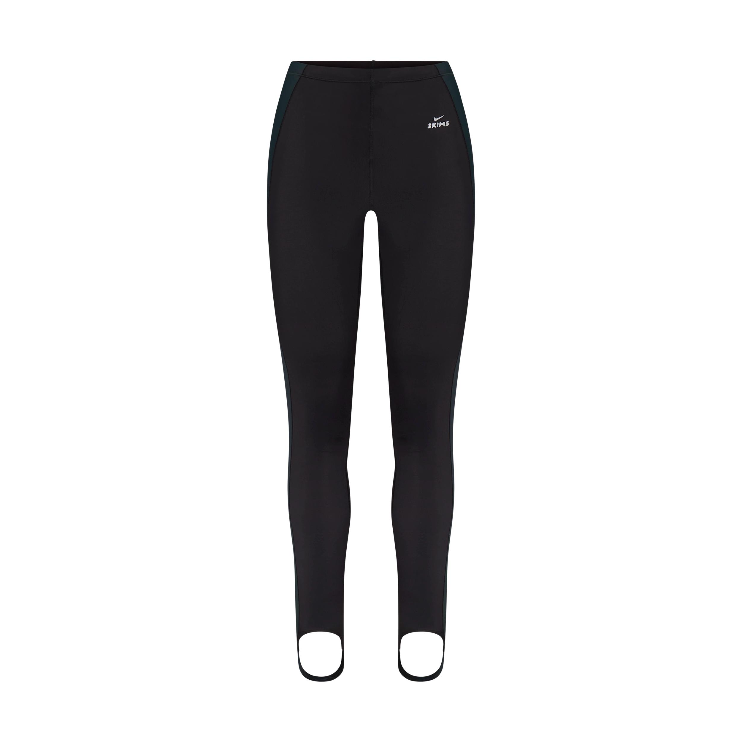Designed to stay in place however you move, these stirrup leggings are made from our quick-drying Shine fabric for a luxuriously light feel. Benefits:Our sleek Shine fabric is lightweight and breathable with a smoothing fit and subtle sheen. Stirrup design helps provide a secure workout experience. Waistband features an internal drawcord for a secure, adjustable fit. [] Product Details:26 inseam. Four-way stretch. Contrast logo at wearer's left hip. Cotton gusset. 78% nylon/22% spandex. Machine wash. Imported. Style: LEGLEG9632W; Color: NSKM OBSIDIAN/NSKM DARK TEAL; Size: 2X; Gender: Female; Age Group: Adult | Nike SKIMS Shine Women's High-Waisted 26" Stirrup Leggings with Drawcord in Black, Size: 2X | LEGLEG9632W-OBT