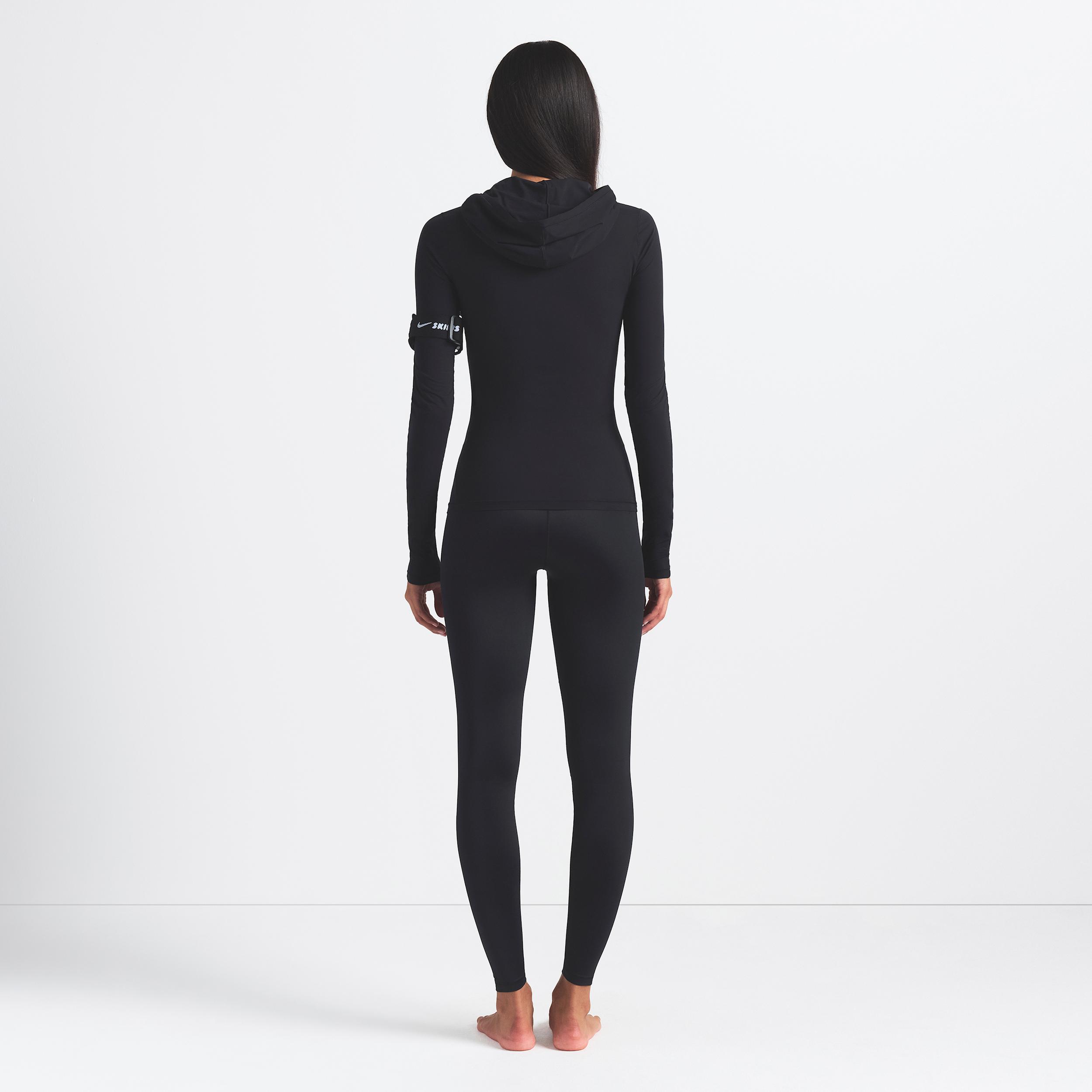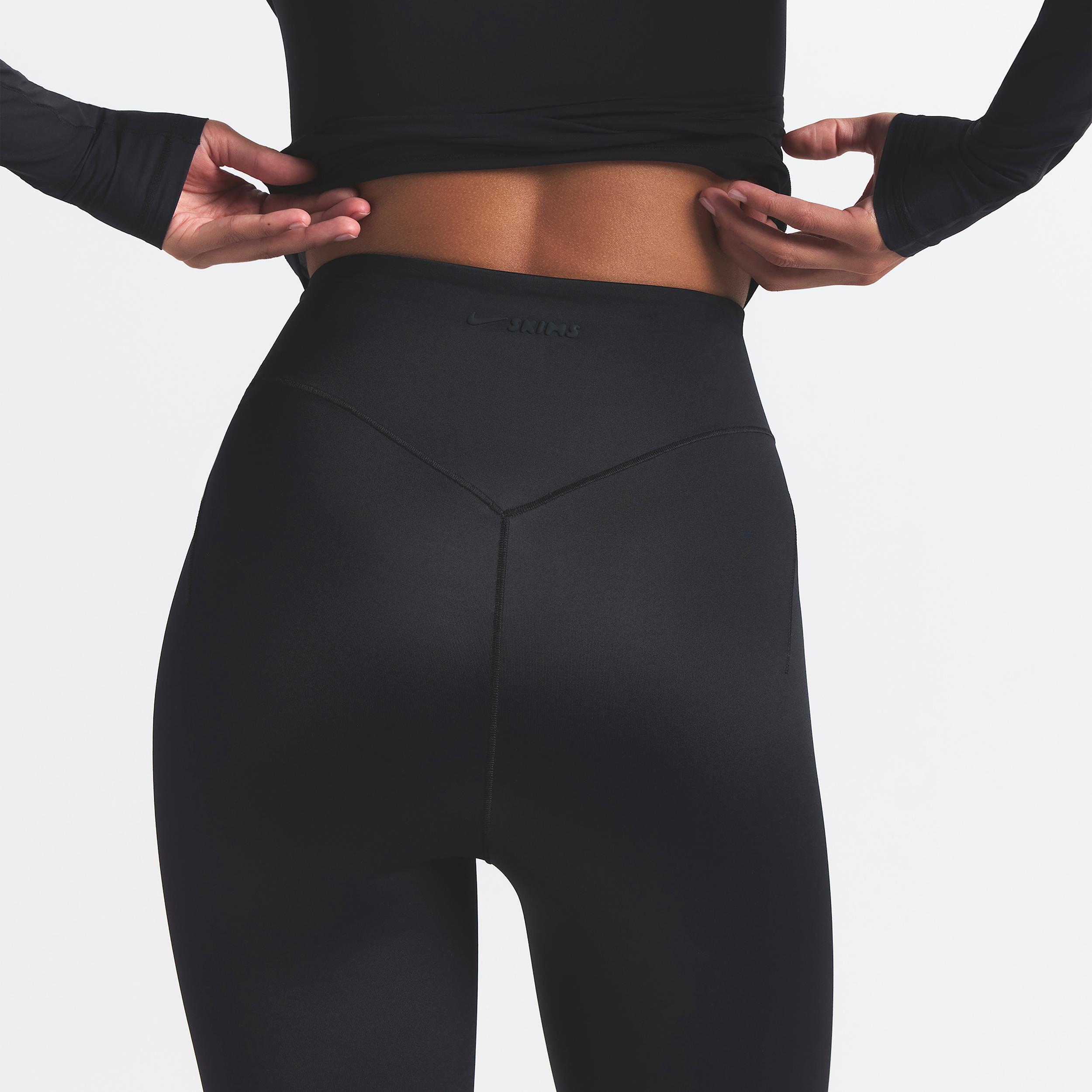 Designed to feel luxuriously light and hug your curves, our quick-drying Shine fabric gives these leggings a sleek look with a subtle sheen. A bonded waistband provides extra comfort while side-dart details accentuate your shape. Benefits:Our sleek Shine fabric is lightweight and breathable with a smoothing fit and subtle sheen. Stretchy waistband features an internal drawcord for a secure, adjustable fit. Darts at the side contour your curves. [] Product Details:26 inseam. Four-way stretch. Cotton gusset. Silicone matte logo at center front. 78% polyamide/22% Lycra® spandex. Machine wash. Imported. Style: BOLEG8352W; Color: NSKM OBSIDIAN; Size: S; Gender: Female; Age Group: Adult | Nike SKIMS Shine Women's High-Waisted Bonded 26" Leggings in Black, Size: Small | BOLEG8352W-OBD
