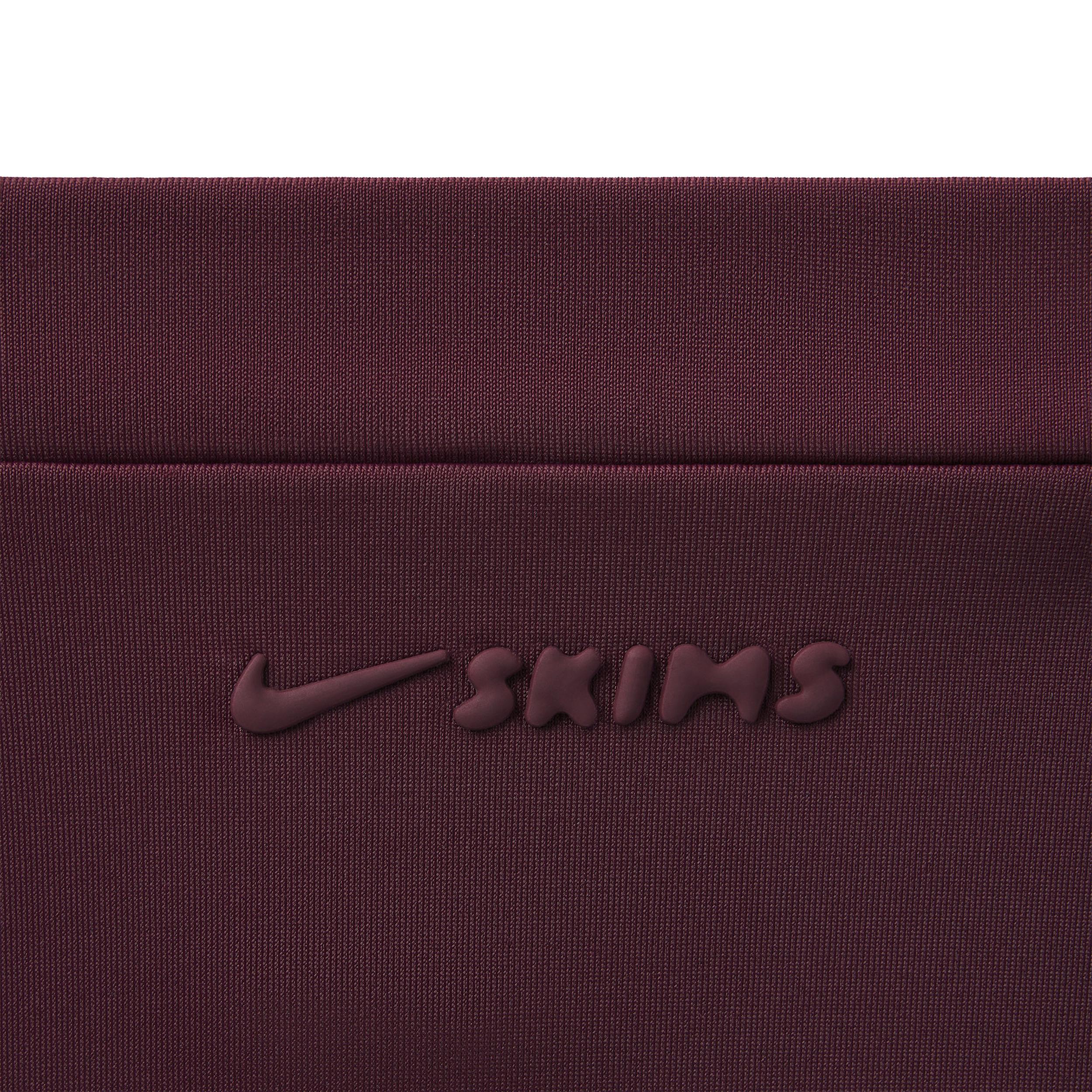 Designed to feel luxuriously light and hug your curves, our quick-drying Shine fabric gives these cropped leggings a sleek look with a subtle sheen. Bold design lines and a side-dart details accentuate your shape. Benefits:Our sleek Shine fabric is lightweight and breathable with a smoothing fit and subtle sheen. Stretchy waistband features an internal drawcord for a secure, adjustable fit. Darts at the side contour your curves. [] Product Details:17 inseam. Four-way stretch. Cotton gusset. Silicone matte logo at center back. 78% polyamide/22% spandex. Machine wash. Imported. Style: BOLEG7887W; Color: NSKM CURRANT; Size: M; Gender: Female; Age Group: Adult | Nike SKIMS Shine Women's High-Waisted 17" Leggings with Drawcord in Red, Size: Medium | BOLEG7887W-CUR