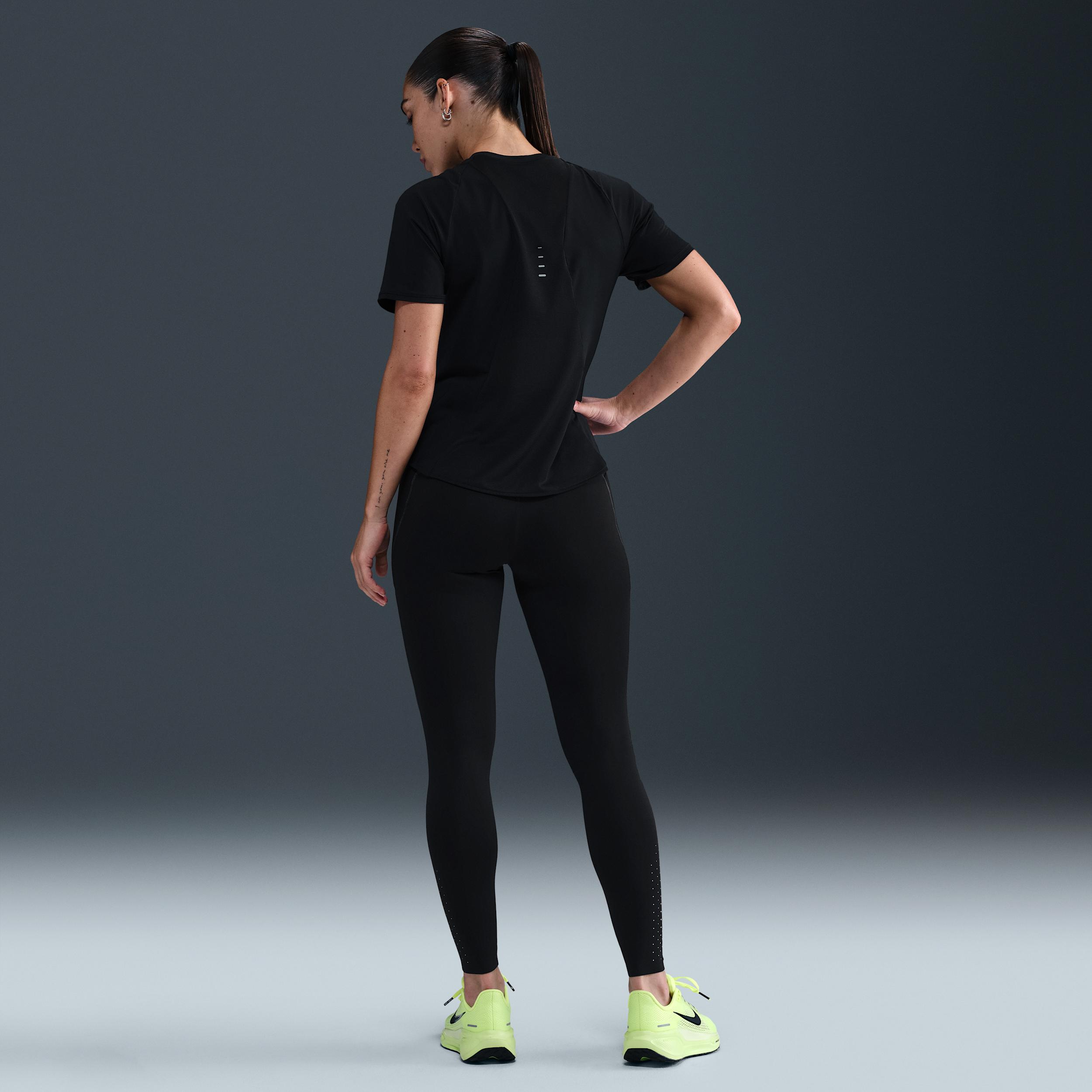 Stay ready for chilly temps day or night. These heat-regulating Swift leggings are made with incredibly soft fabric and have reflective details to add a pop to your path. Three pockets stow your essentials while a drawcord on the waistband helps secure your fit mile after mile. Benefits:Nike Therma-FIT ADV technology combines heat-regulating fabric with advanced features to help keep you warm in cold-weather conditions. Elastic waistband with a drawcord gives you a secure, distraction-free fit. Two drop-in side pockets plus one discreet back zip pocket fit most phones (helping reduce bouncing). [] Product Details:Reflective detailing on front, back and sides. Not intended for use as Personal Protective Equipment (PPE). Body:80% polyester/20% spandex. Gusset Lining:100% polyester. Machine wash. Imported. Style: HV2287; Color: Black/Dark Smoke Grey; Size: XS; Gender: Female; Age Group: Adult | Nike Swift Women's High-Waisted 7/8 Running Leggings with Reflective Accents in Black, Size: XS | HV2287-010