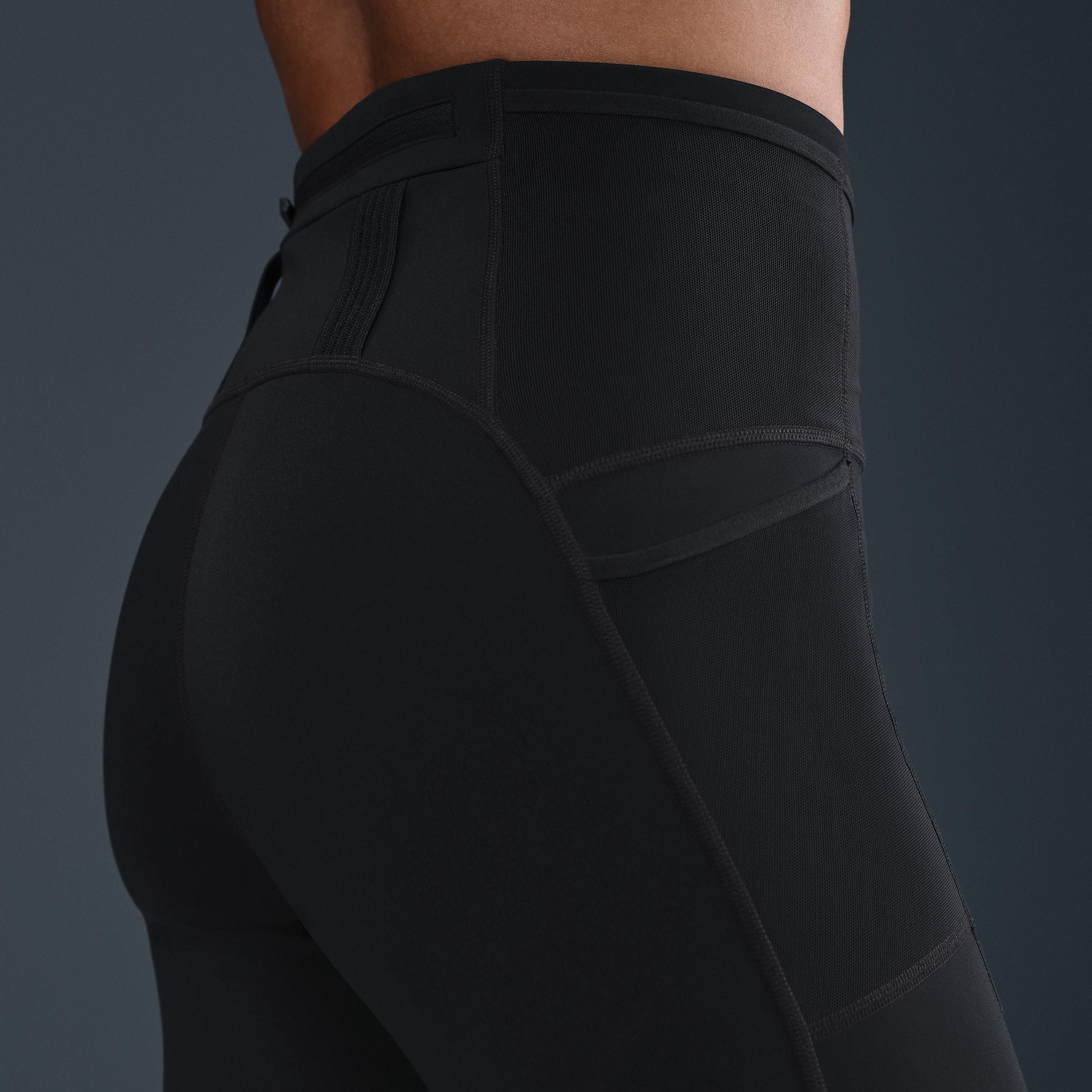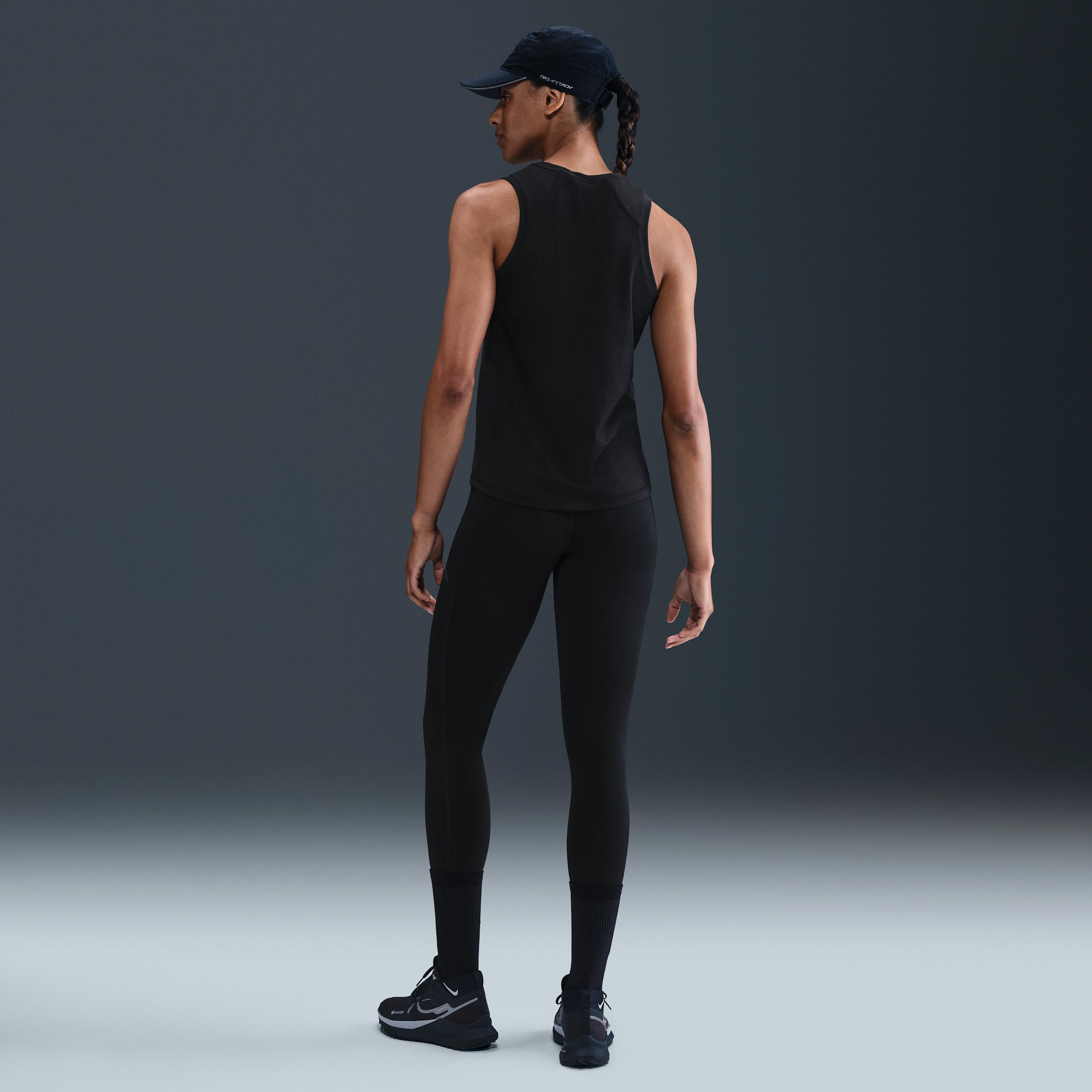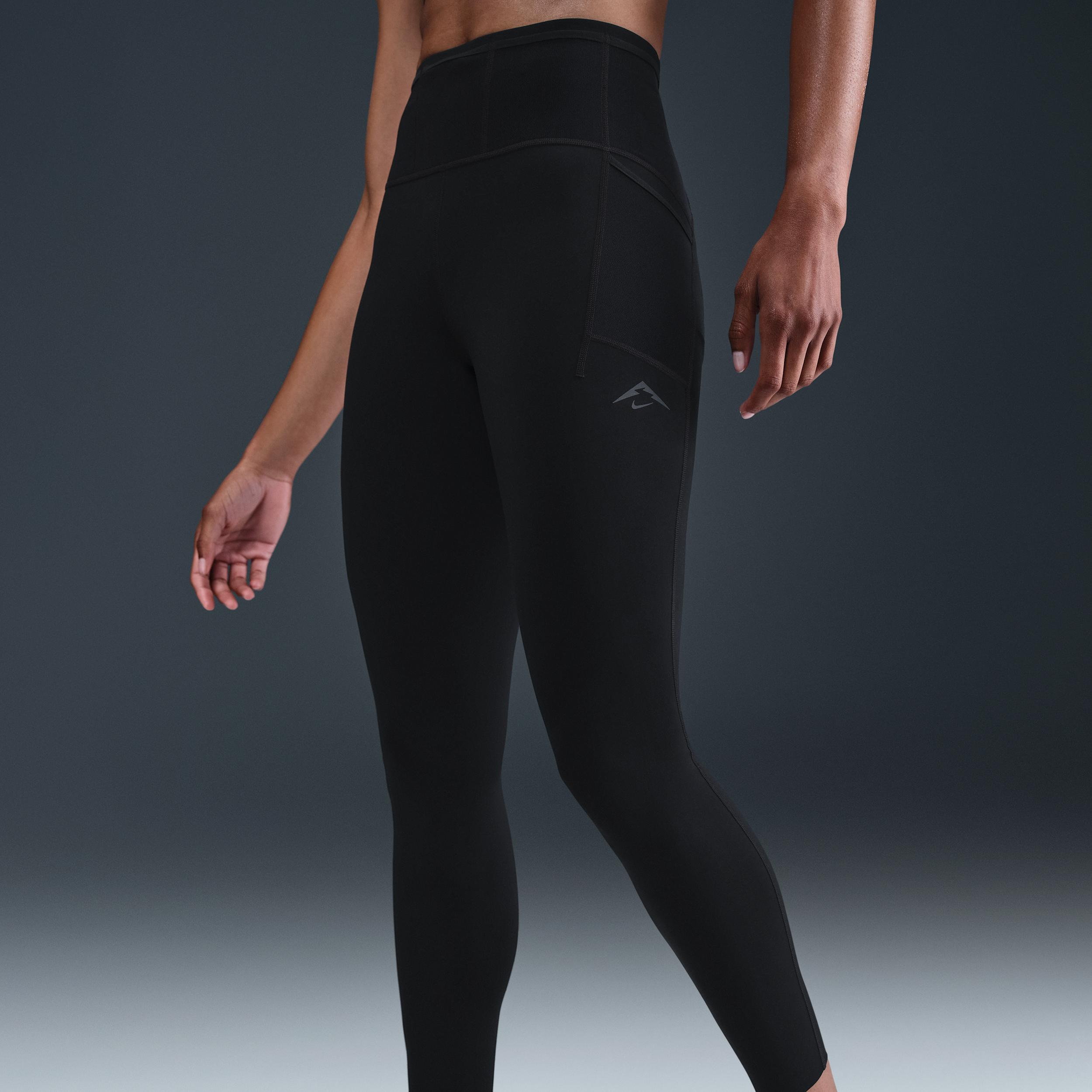 Tackle the terrain with everything you need. These smooth, midweight leggings wick sweat and keep you prepared to go the distance with eight (yes, eight) pockets to store your essentials. Stay Dry:Smooth and stretchy fabric has Nike Dri-FIT technology that moves sweat away from your skin for quicker evaporation, helping you stay dry and comfortable. Stay Prepared:Storage options include two mesh drop-in side pockets and one back zip pocket that's roomy enough to fit most phones. Plus, five mesh waistband pockets let you store trail essentials like energy gels and lip balm. Elastic loops at the back can hold your trekking poles or your top layer. [] Product Details:Drawcord at waist. Reflective Nike Trail logo. Body/Gusset lining:75% Polyester/25% spandex. Mesh:81% nylon/19% spandex. Machine wash. Imported. Not intended for use as Personal Protective Equipment (PPE). Style: HV2285; Color: Black/Black; Size: L; Gender: Female; Age Group: Adult | Nike Trail Women's High-Waisted 7/8 Running Leggings in Black, Size: Large | HV2285-010
