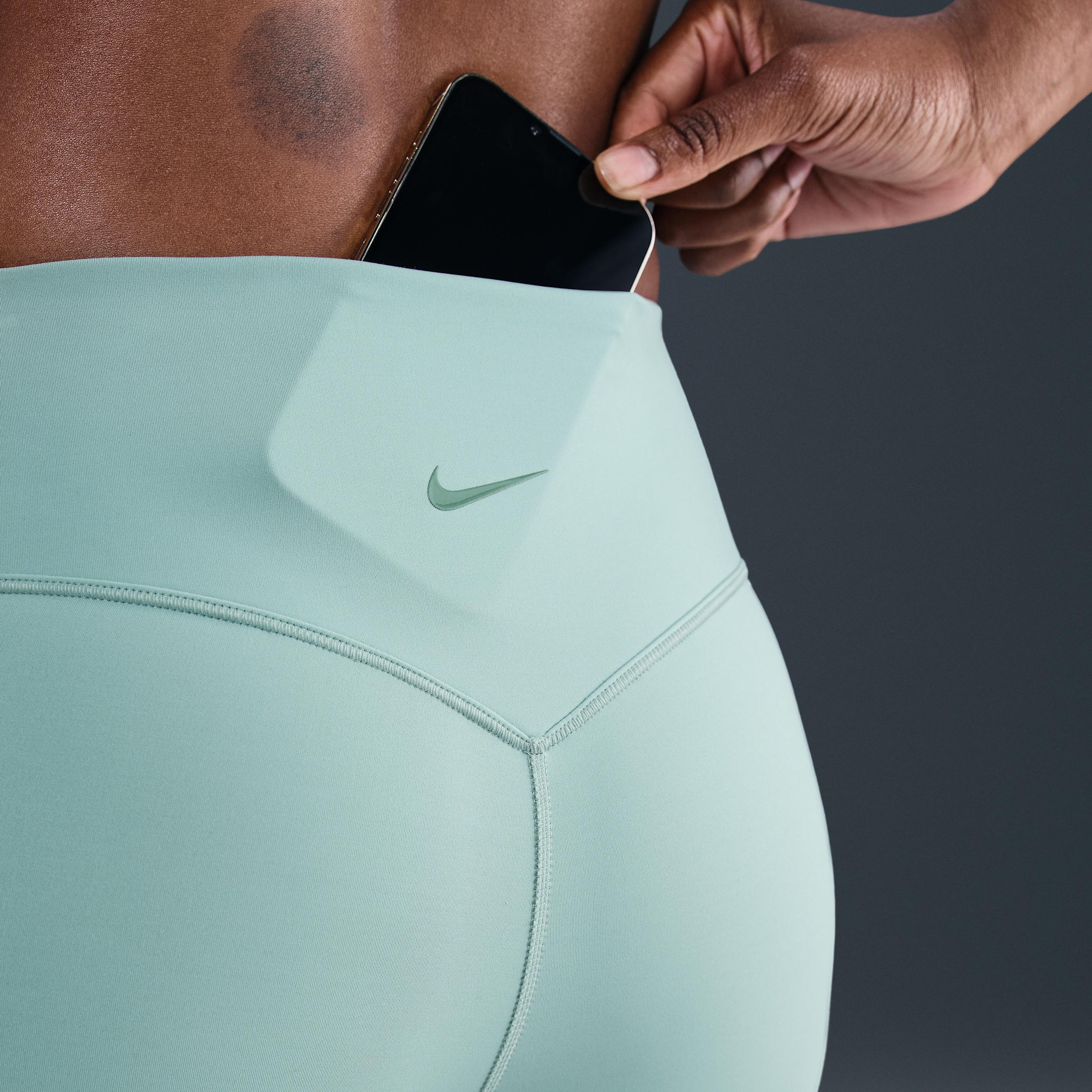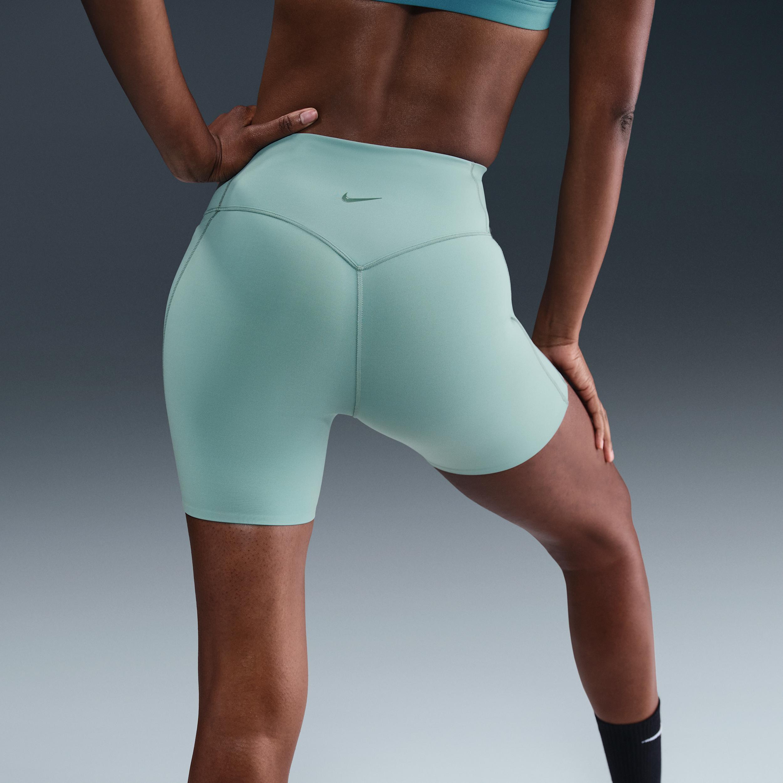 Don't let 'em see you sweat. We elevated the design of our Universa biker shorts to look smooth and help conceal sweat, thanks to a no-seam front and moisture-concealing technology. Their midweight, ultrasmooth fabric offers squat-proof stretch that helps lift and shape. Plus, an updated waistband resists rolling, so you can go all out with confidence. Keep Sweat out of Sight:Nike Stealth Evaporation technology manages moisture to help hide visible signs of sweat on your garment. It combines with Nike Dri-FIT technology that moves sweat away from your skin for quicker evaporation, helping you stay dry and comfortable.,Smoothing Touches:The absence of a front seam helps keep the fabric from riding up. A discreet back pocket and drop-in side pockets that fit most phones help keep the look smooth. [] Product Details:Body/Panels lining:77% polyester/23% spandex. Laser-cut hem. Silicone Swoosh logo on back waist. Machine wash. Imported. Not intended for use as Personal Protective Equipment (PPE). Style: HQ6832; Color: Cannon/Bicoastal/Bicoastal; Size: 2XS; Gender: Female; Age Group: Adult | Nike Universa Women's Medium-Support High-Waisted 5" Biker Shorts with Pockets in Green, Size: 2XS | HQ6832-017