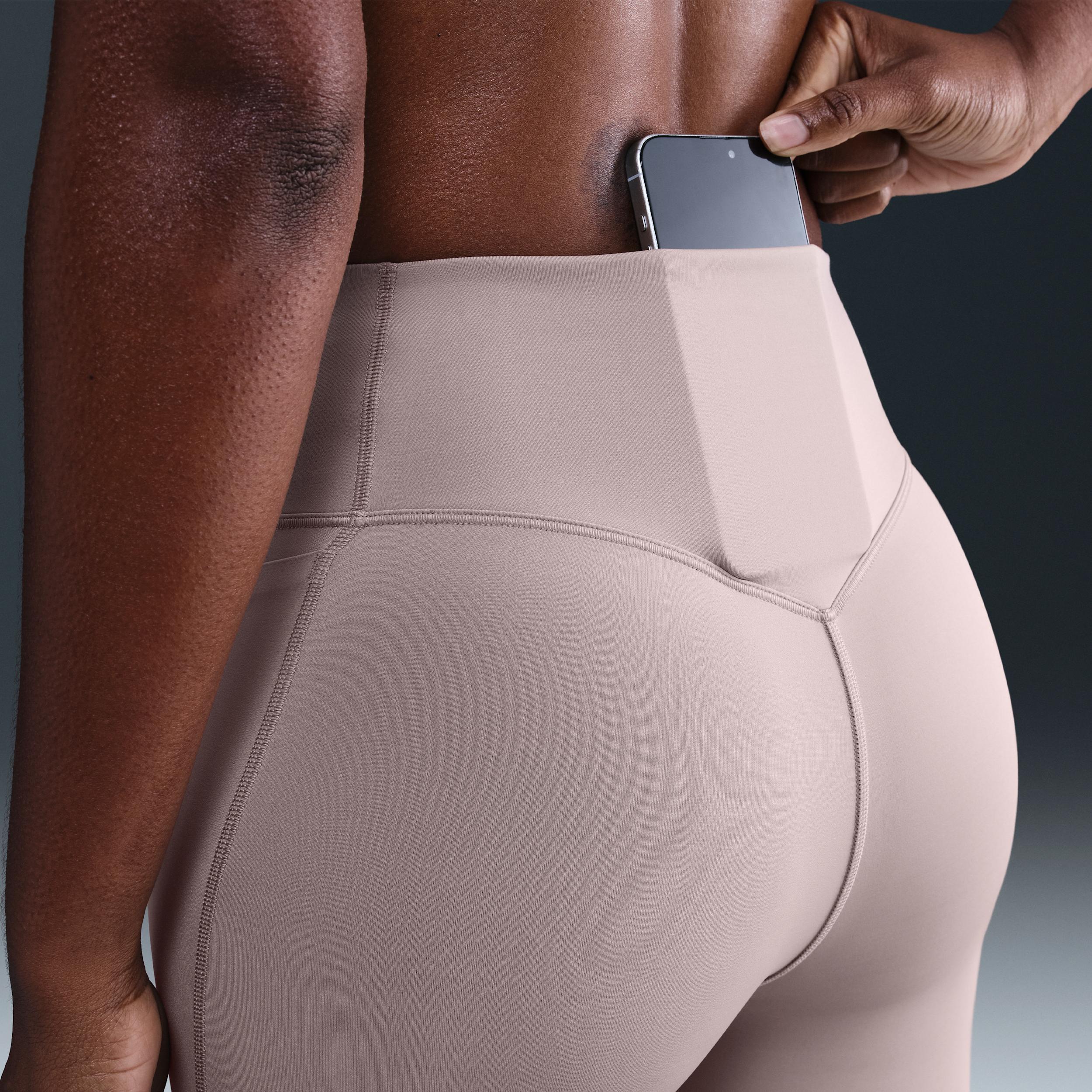 Dont let em see you sweat. We elevated the design of our Universa leggings to look smooth and help conceal sweat, thanks to a no-seam front and moisture-concealing technology. Their midweight, ultrasmooth fabric offers squat-proof stretch that helps lift and shape. Plus, an updated waistband resists rolling, so you can go all out with confidence. Keep Sweat out of Sight:Nike Stealth Evaporation technology manages moisture to help hide visible signs of sweat on your garment. It combines with Nike Dri-FIT technology that moves sweat away from your skin for quicker evaporation, helping you stay dry and comfortable.,Smoothing Touches:The absence of a front seam helps keep the fabric from riding up. A discreet back pocket and drop-in side pockets that fit most phones help keep the look smooth. [] Product Details:77% polyester/23% spandex. Laser-cut hem. Silicone Swoosh logo on left calf. Machine wash. Imported. Not intended for use as Personal Protective Equipment (PPE). Style: HQ6813; Color: Malt/Mink Brown/Moon Particle; Size: L; Gender: Female; Age Group: Adult | Nike Universa Womens High-Waisted 7/8 Leggings with No Front Seam in Brown, Size: Large | HQ6813-271