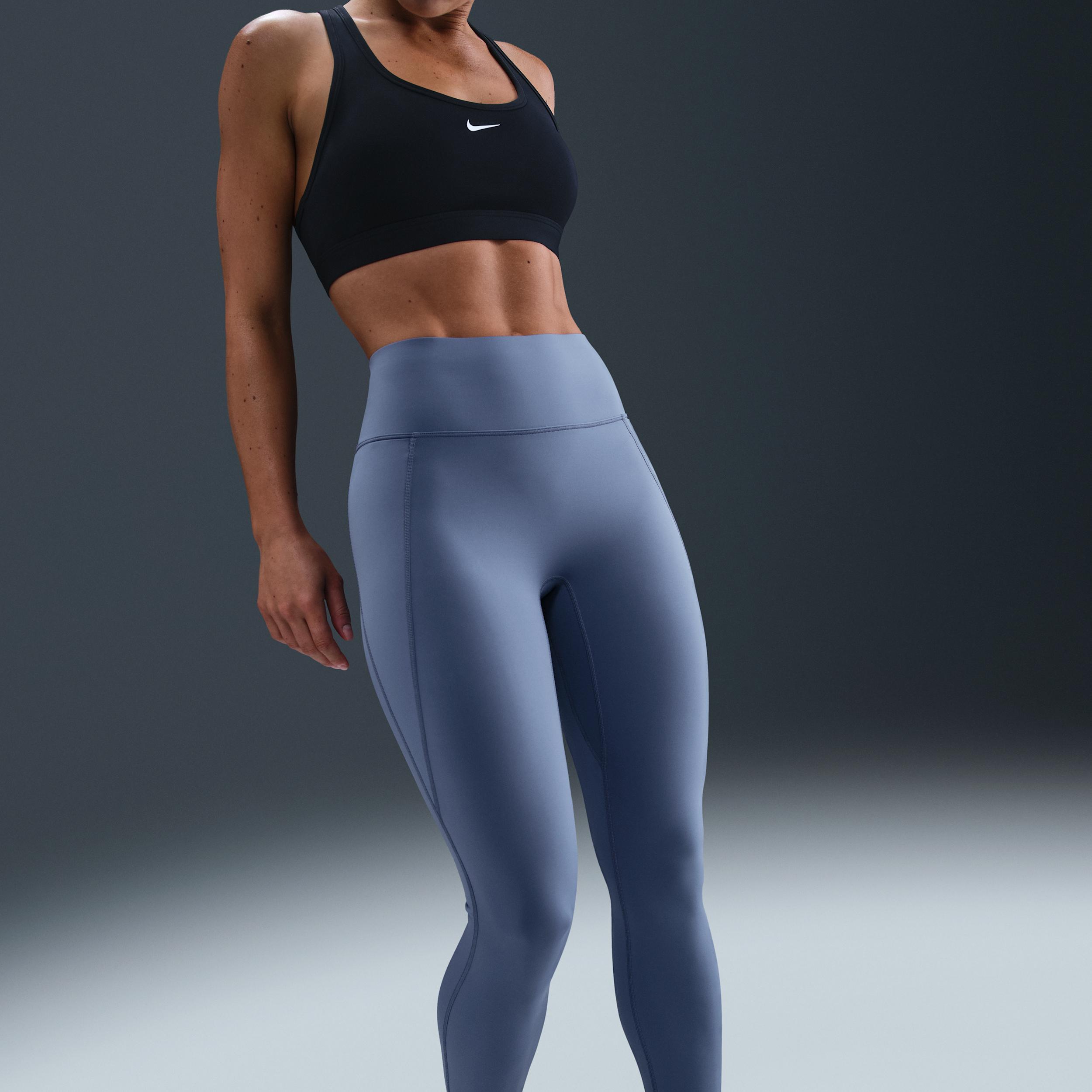 Don't let 'em see you sweat. We elevated the design of our Universa leggings to look smooth and help conceal sweat, thanks to a no-seam front and moisture-concealing technology. Their midweight, ultrasmooth fabric offers squat-proof stretch that helps lift and shape. Plus, an updated waistband resists rolling, so you can go all out with confidence. Keep Sweat out of Sight:Nike Stealth Evaporation technology manages moisture to help hide visible signs of sweat on your garment. It combines with Nike Dri-FIT technology that moves sweat away from your skin for quicker evaporation, helping you stay dry and comfortable.,Smoothing Touches:The absence of a front seam helps keep the fabric from riding up. A discreet back pocket and drop-in side pockets that fit most phones help keep the look smooth. [] Product Details:77% polyester/23% spandex. Laser-cut hem. Silicone Swoosh logo on left calf. Machine wash. Imported. Not intended for use as Personal Protective Equipment (PPE). Style: HQ6813; Color: World Indigo/Sanded Purple/Celestine Blue; Size: M; Gender: Female; Age Group: Adult | Nike Universa Women's High-Waisted 7/8 Leggings with No Front Seam in Blue, Size: Medium | HQ6813-499