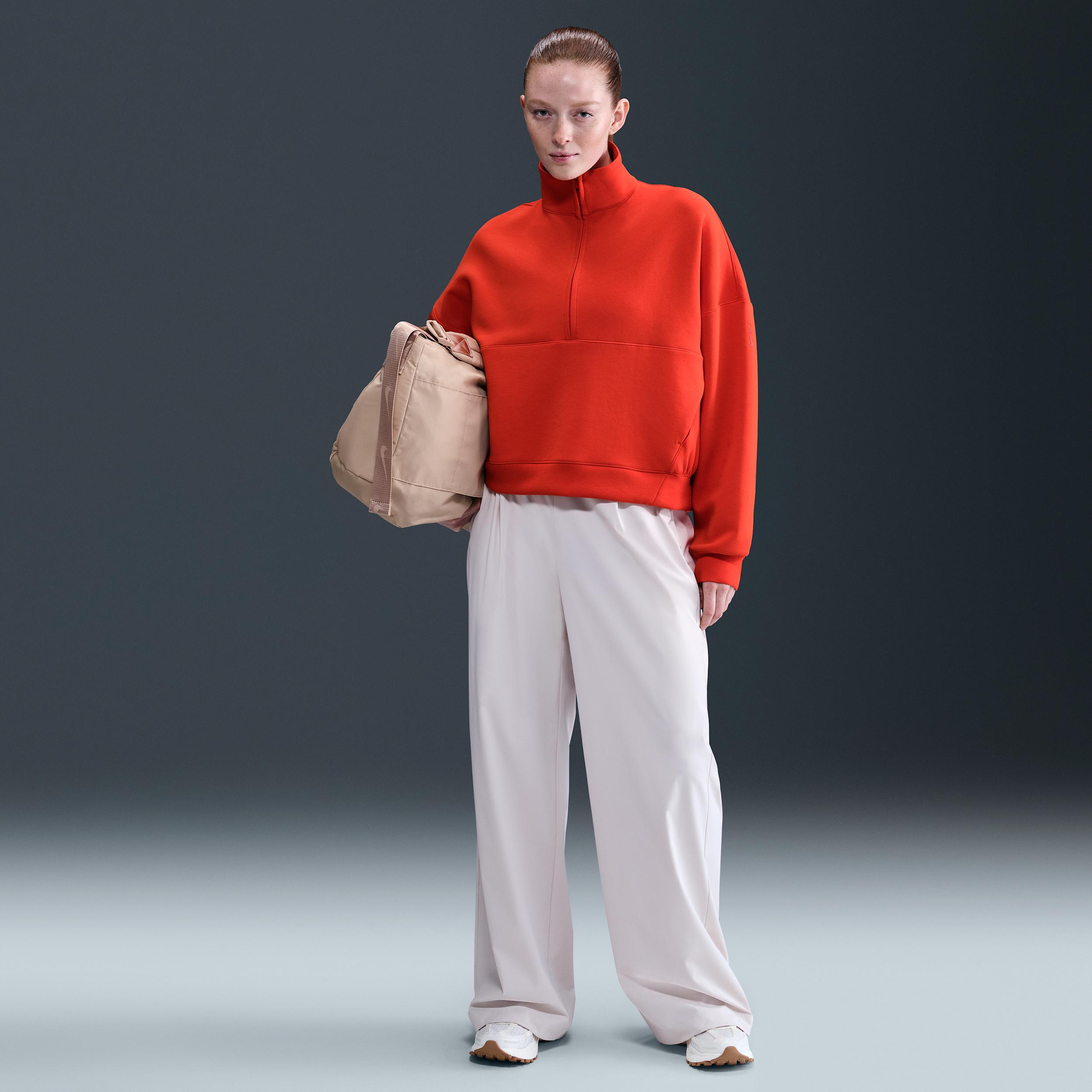 Extraordinarily soft and smooth, our ImpossiblySoft fabric feels made for all-day motion. It's a double-knit material that adds structure to this top while wicking sweatâfor comfort that doesn't quit. Benefits:Nike Dri-FIT technology moves sweat away from your skin for quicker evaporation, helping you stay dry and comfortable. Open front pocket holds your essentials. [] Product Details:1/2-length zipper with thin molded pull. Signature locker loop at back of neck. Matte silicone branding on left sleeve. Body:51% polyester/25% modal/15% cotton/9% spandex. Pocket lining:100% cotton. Machine wash. Imported. Style: HQ8188; Color: Picante Red/Mystic Red; Size: 2XL; Gender: Female; Age Group: Adult | Nike 24.7 ImpossiblySoft Women's Dri-FIT Oversized 1/2-Zip Top in Red, Size: 2XL | HQ8188-633