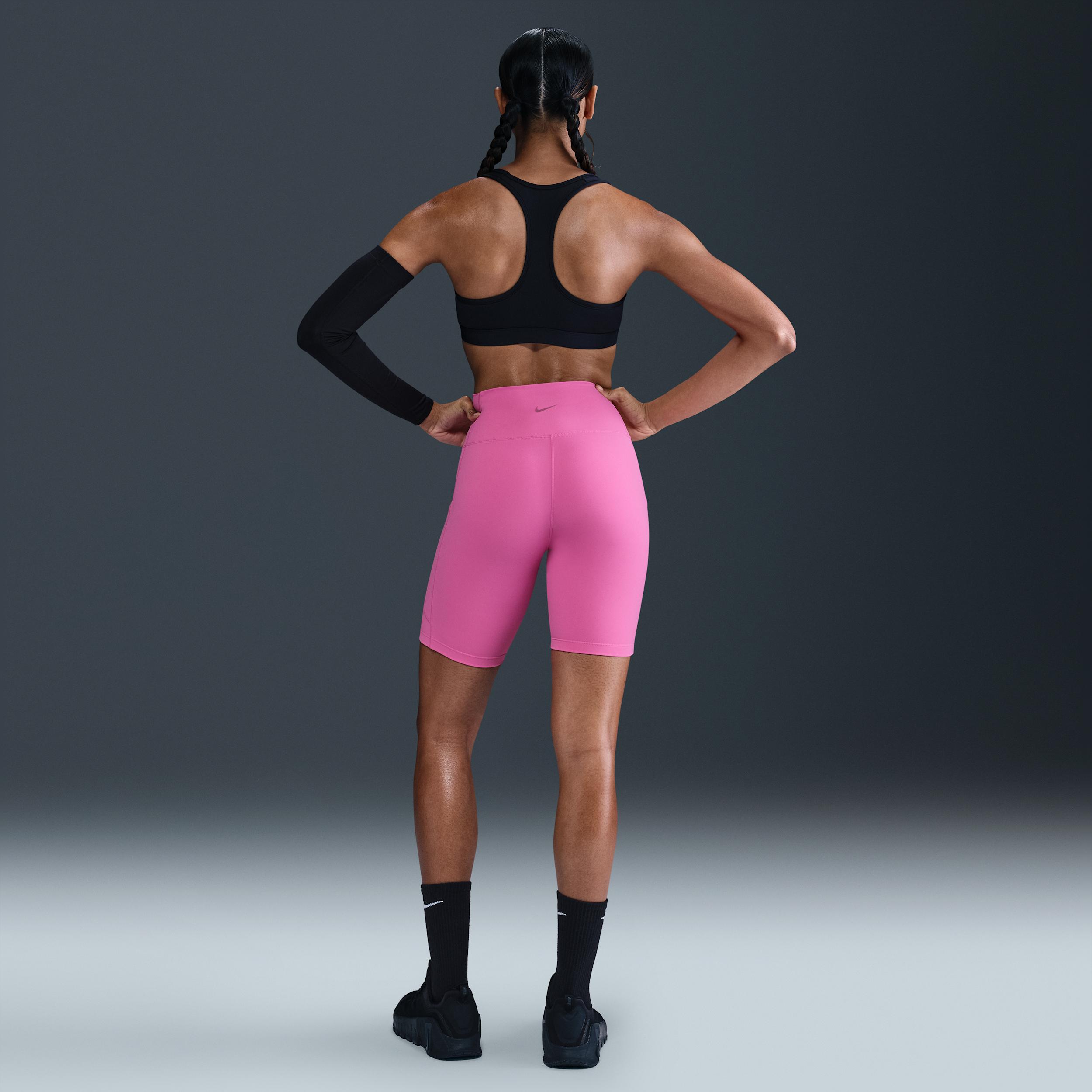 Up for a workout or down to chill, these biker shorts are the Ones that are ready for whatever you are. Their midweight, peachy-soft fabric stretches with your every move and dries quickly. Plus, a high waist is designed to meet your favorite cropped tops for a head-to-toe look that you can feel confident and comfortable in all day long. Confident Coverage:Non-sheer fabric and a high waist help keep your butt covered no matter how deep you bend and stretch. Fewer seams make for a smooth, flattering fit. Ready for it All:A drop-in pocket in the back of the waistband is large enough to hold your smartphone. External thigh pockets let you keep more essentials close. Stay Dry:Nike Dri-FIT technology moves sweat away from your skin for quicker evaporation, helping you stay dry and comfortable. Something for Every One:No One works for everything, and that's why we're offering these leggings and shorts in multiple lengths for every activity and every mood. Plus, they pair perfectly with any of our Nike One tops and bras, available in several colors to complete your look. [] Product Details:Body:80% polyester/20% spandex. Gusset lining:100% polyester. Machine wash. Imported. Not intended for use as Personal Protective Equipment (PPE). Style: FZ6758; Color: Playful Pink/Black; Size: L; Gender: Female; Age Group: Adult | Nike One Women's High-Waisted 8" Biker Shorts with Pockets in Pink, Size: Large | FZ6758-675
