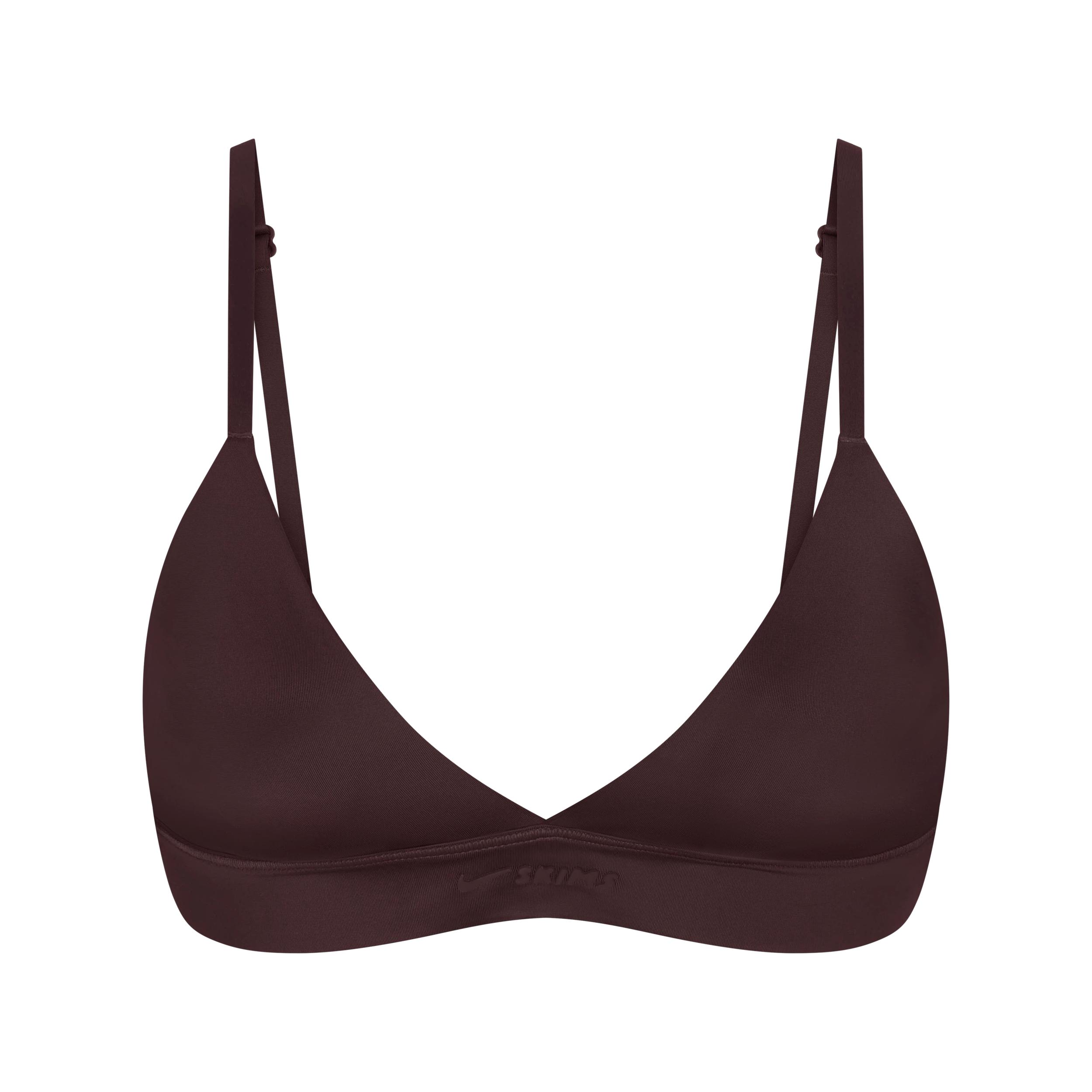 Designed to feel luxuriously light, our quick-drying Shine fabric gives this triangle bra a sleek look with subtle shine. Offering light support, it features adjustable straps and lightly molded, built-in pads for coverage and support. Benefits:Our sleek Shine fabric is lightweight and breathable with a smoothing fit and subtle sheen. Soft, lightly molded, built-in pads give you extra comfort and coverage. Adjustable straps help you personalize your fit. [] Product Details:Pullover style. Elastic underband. Silicone matte logo at center front. 78% nylon/22% spandex. Machine wash. Imported. Style: BRSPT7842W; Color: NSKM OBSIDIAN; Size: XS; Gender: Female; Age Group: Adult | Nike SKIMS Shine Women's Triangle Bra in Black, Size: XS | BRSPT7842W-OBD