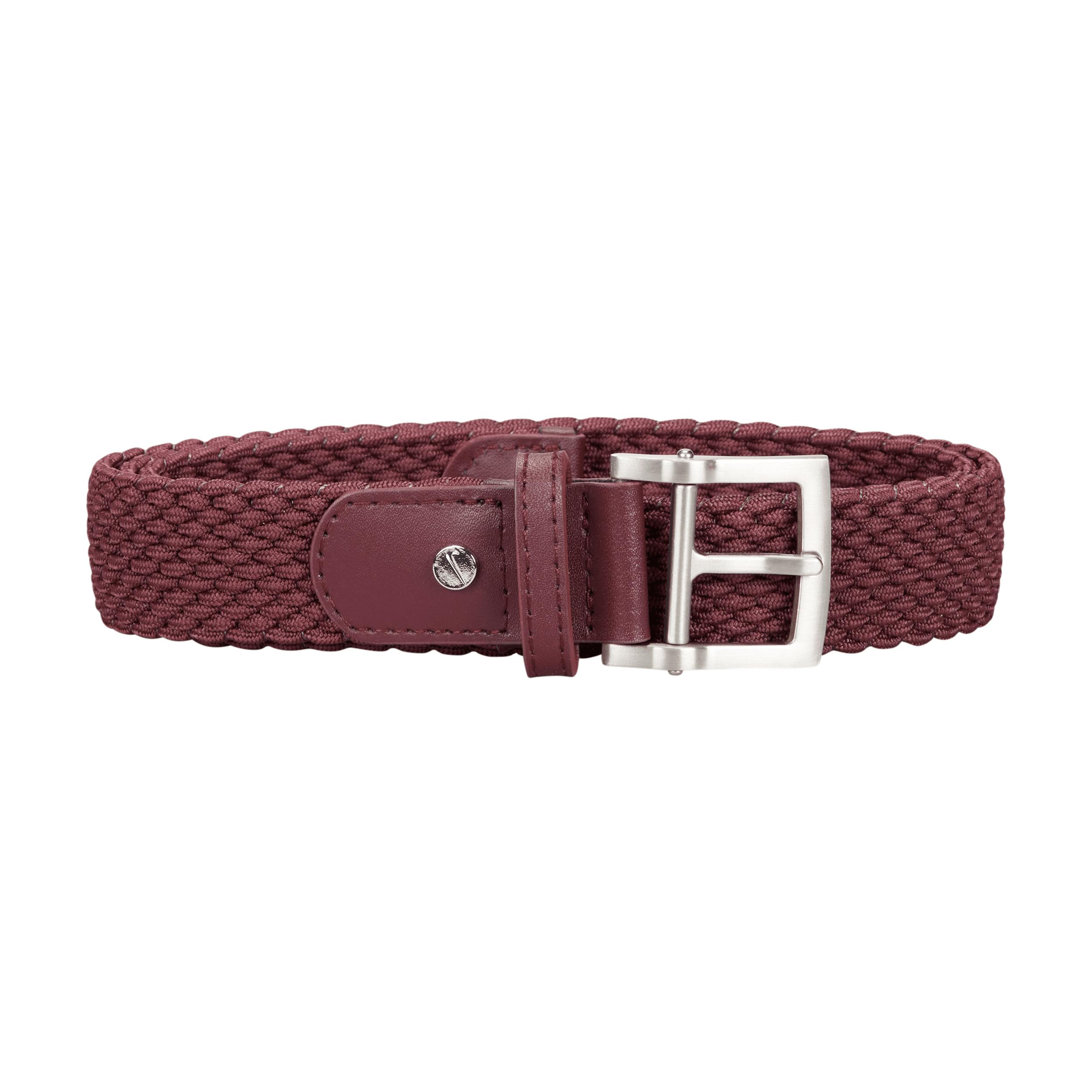 COMFORT FOR THE COURSE. The Nike Stretch Woven Belt is made with durable materials in a flexible design for lasting comfort, round after round. Benefits:Stretch fabric and G-Flex inset at buckle let you move freely. Woven construction and leather details provide durability. No-hole strap offers a customizable fit. Product Details:Large metal buckle. Materials: 55% polypropylene/30% rubber/10% leather/5% polyester. Width: 30 mm. Imported. Style: 131150; Color: Red; Size: S; Gender: Female; Age Group: Adult | Nike Stretch Woven Women's Golf Belt in Red, Size: Small | 131150-644