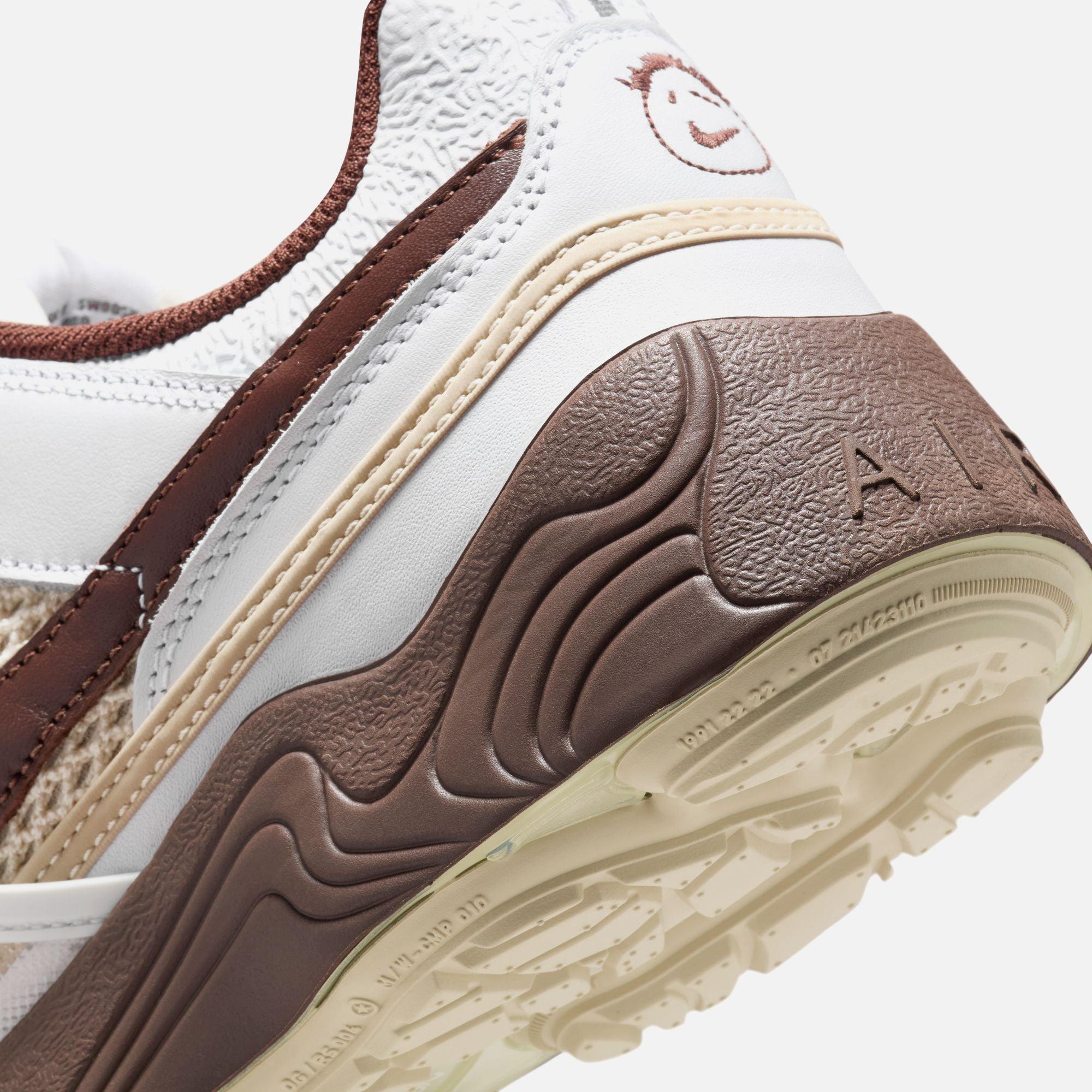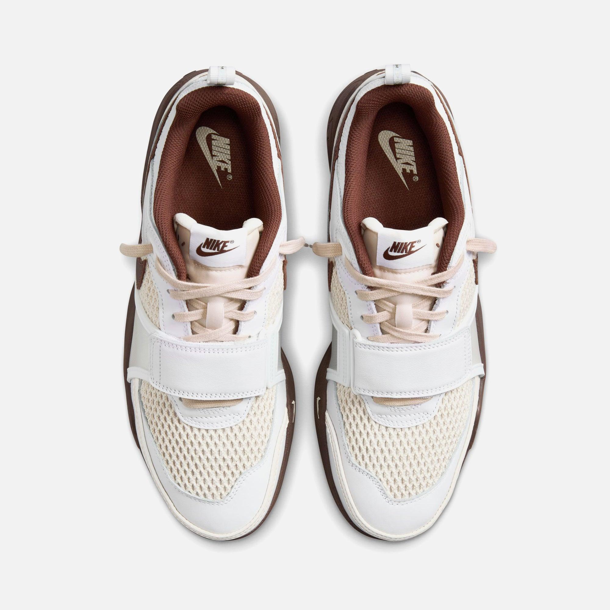 Travis Scott Jumpman Jack Zoom Field Jaxx silhouette Mesh upper Leather overlays Nike patch on tongue TPU eyelets Swoosh on lateral sides Cactus branding on sides Velcro closure on front Cactus Jack smiley face logo on heel Heel pull Debossed A I R logo on rear Flat cotton laces Wavy lines reminiscent on midsole Waffle rubber outsole Style: nkhq3073-100 Color: White / Light Chocolate Material: Mesh / Leather