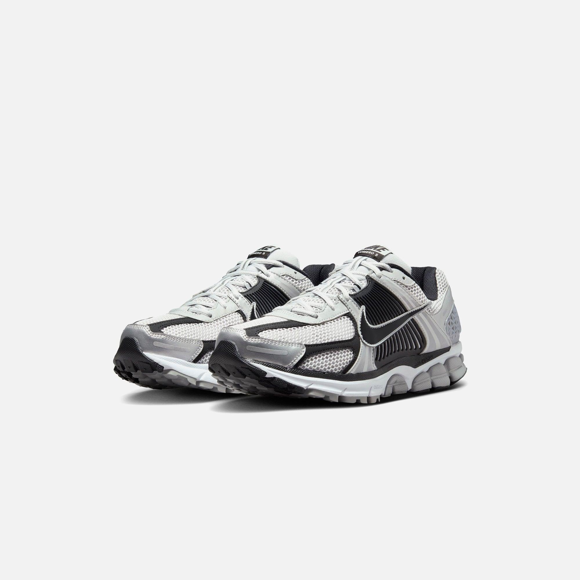 Zoom Vomero 5 silhouette Mesh upper Synthetic leather overlay Padded collar Embroidered Nike logo patch on tongue Iconic Swoosh on side panel Semi-translucent cage on lateral side Nike Swoosh on toe TPU heel counter Heel pull Flat cotton laces Foam midsole Rubber outsole Style: nkfj4151-004 Color: Metallic Silver / Black / Pure Platinum Material: Mesh / Leather