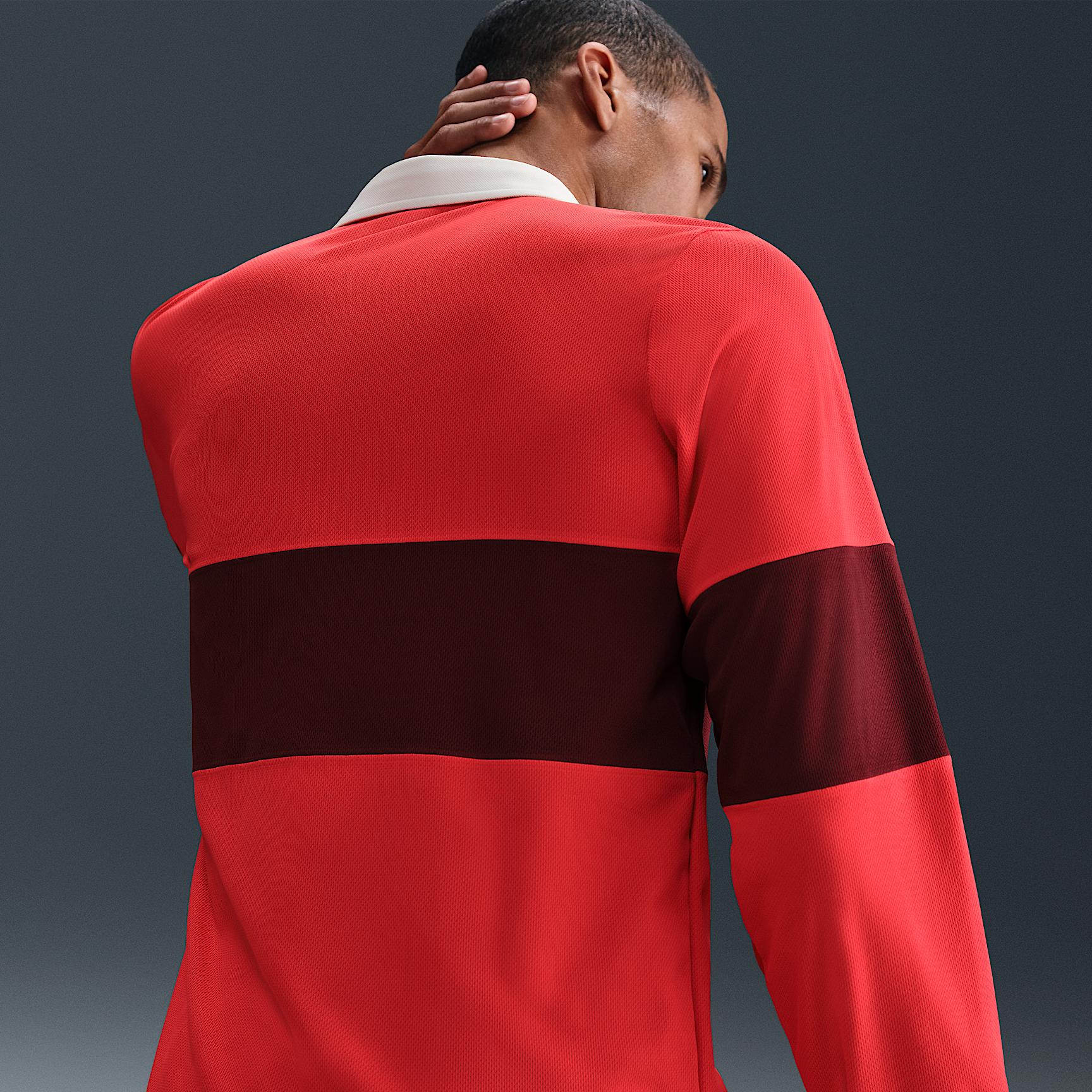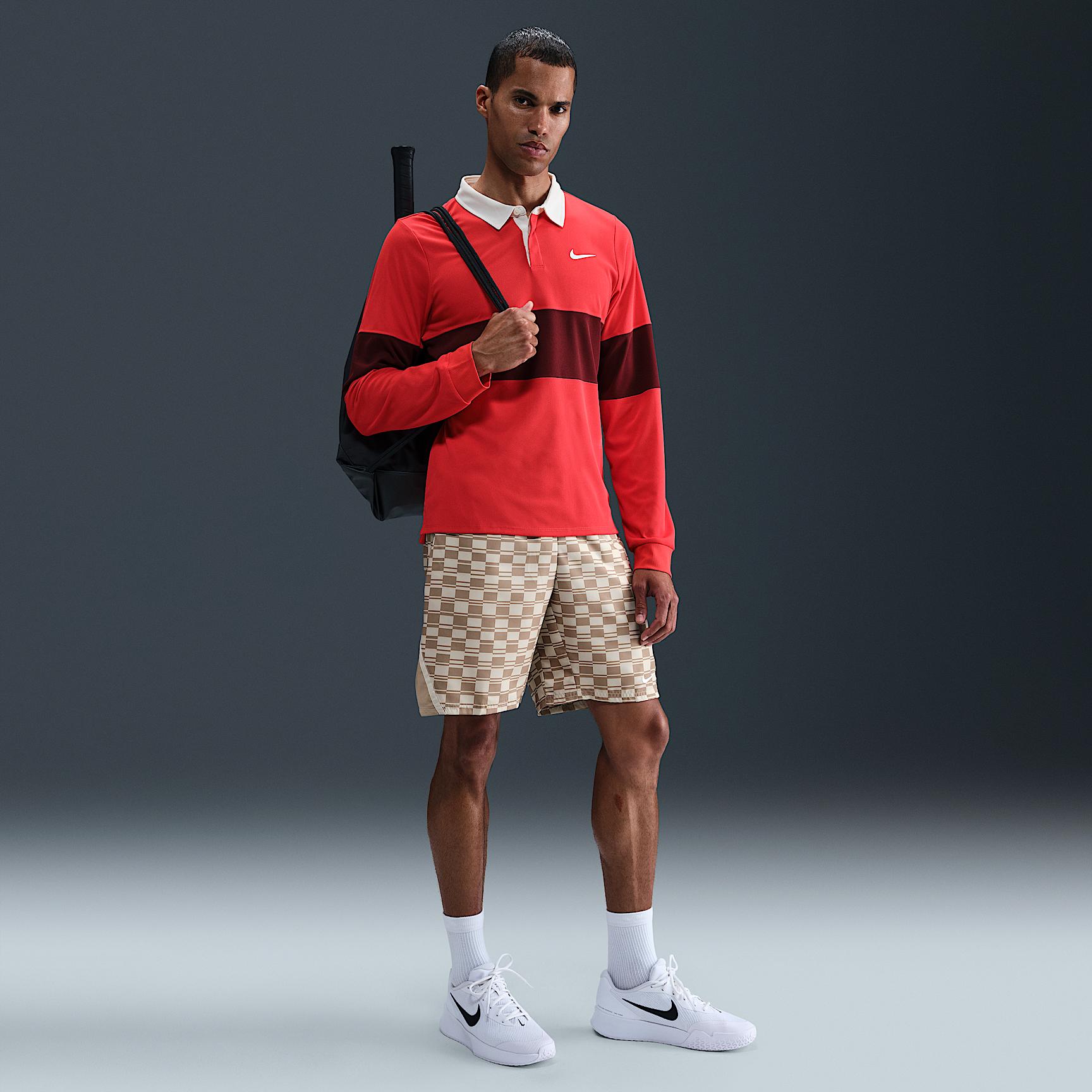 This rugby-inspired polo is built for peak on-court performance. Its four-way stretch fabric and sweat-wicking Dri-FIT technology team up to help keep you coolâeven when the play heats up. Benefits:Nike Dri-FIT technology moves sweat away from your skin for quicker evaporation, helping you stay dry and comfortable. Stretchy knit fabric is lightweight, breathable and limits cling to your body. Extended back hem provides extra coverage. Product Details:Ribbed cuffs. 100% polyester. Machine wash. Imported. Style: IB8141; Color: Light Crimson/Dark Team Red/White; Size: M; Gender: Male; Age Group: Adult | NikeCourt Slam Men's Dri-FIT ADV Long-Sleeve Tennis Polo in Red, Size: Medium | IB8141-696