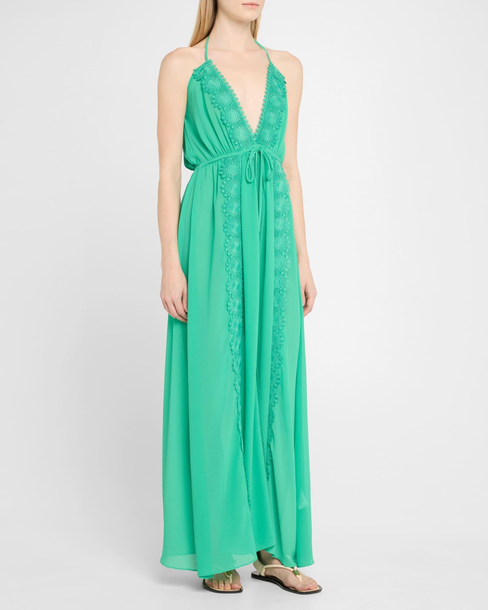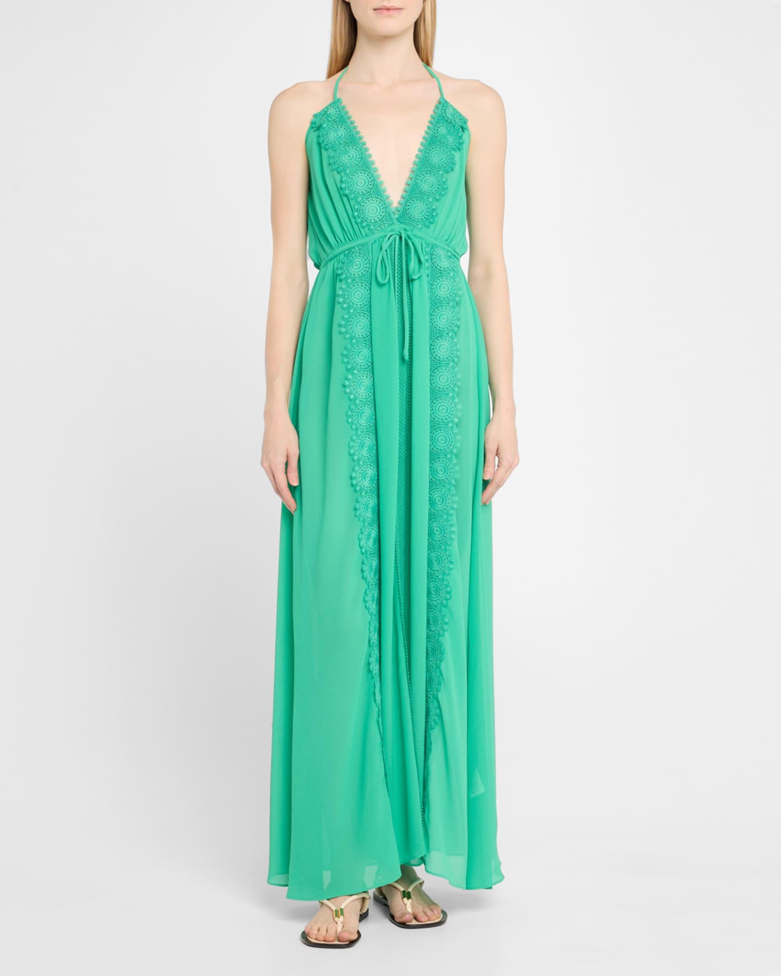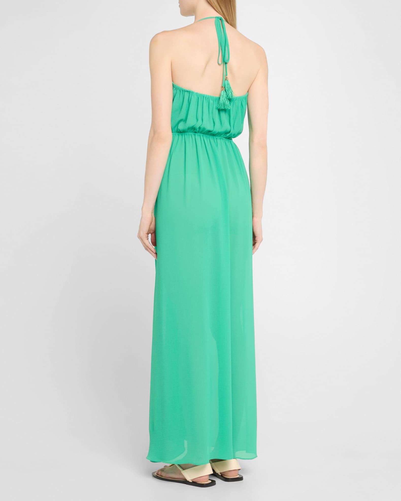 Ramy Brook "Nikole" semi-sheer dress finished with intricate embroidery and tassel tie ends Approx. 63"L from shoulder to hem Halter neckline; self-ties behind the neck Sleeveless Drawstring waistband Full length Slipover style Polyester Hand wash or dry clean Imported