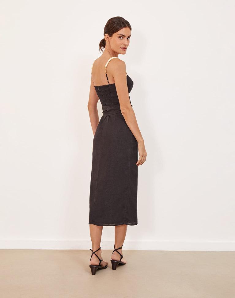 Midi dress featuring a structured bust, parallel and adjustable straps adorned with resin and elastic cord details, and a wrapped skirt with a matching fabric strap. Pair with sandals and a straw hat for a day out, or add heels and jewelry for an elevated look. Features: Front slit Back zipper closure Smocked elastic back Fully lined Elastic cord details Resin details Adjustable parallel straps 24k gold-plated accents Style# 315-826-001