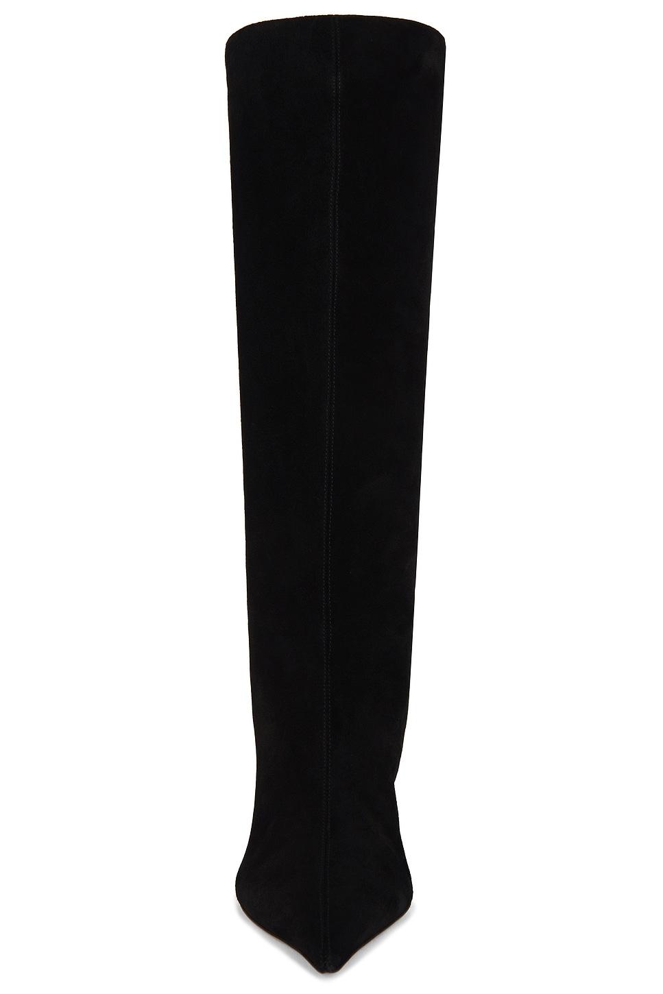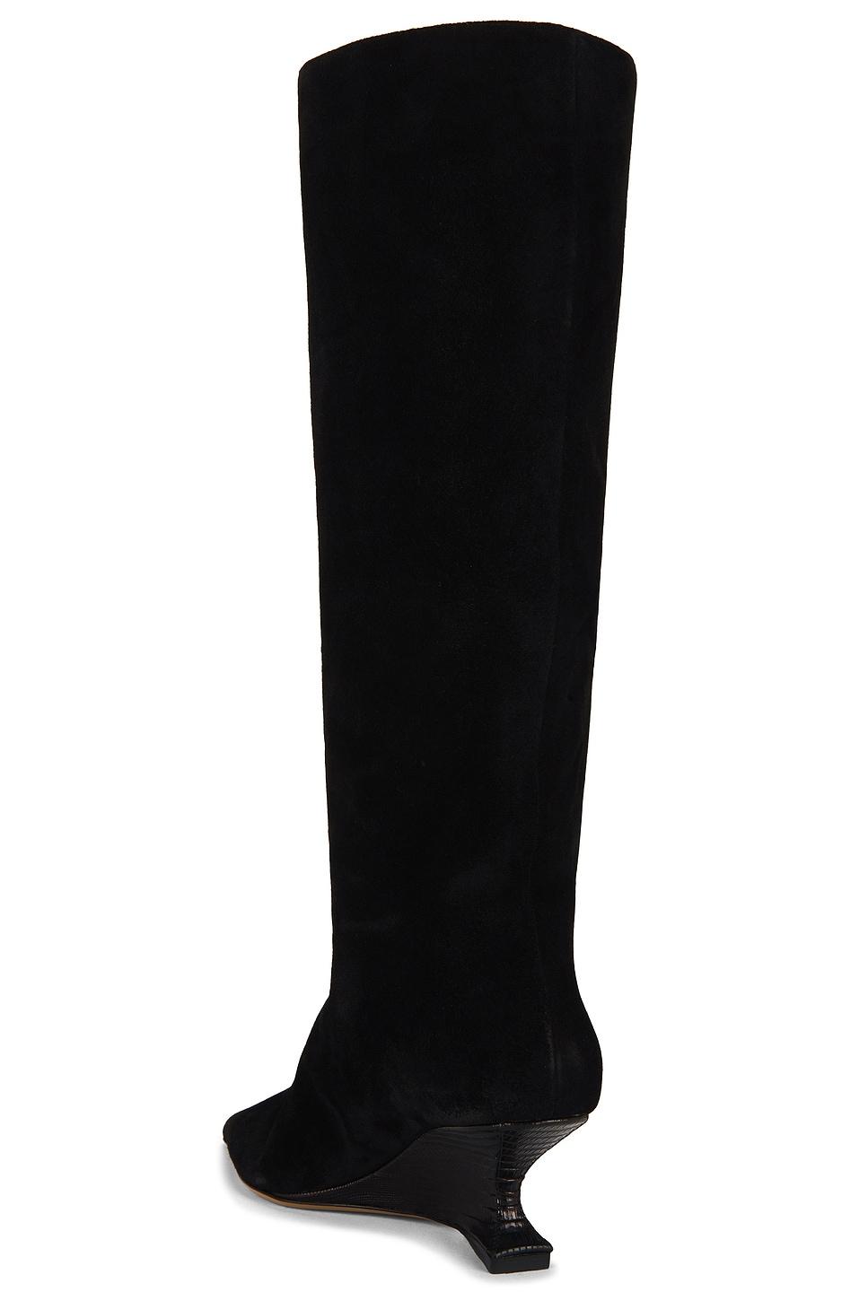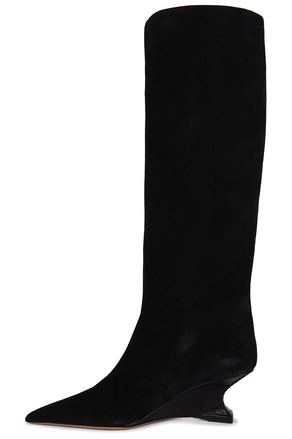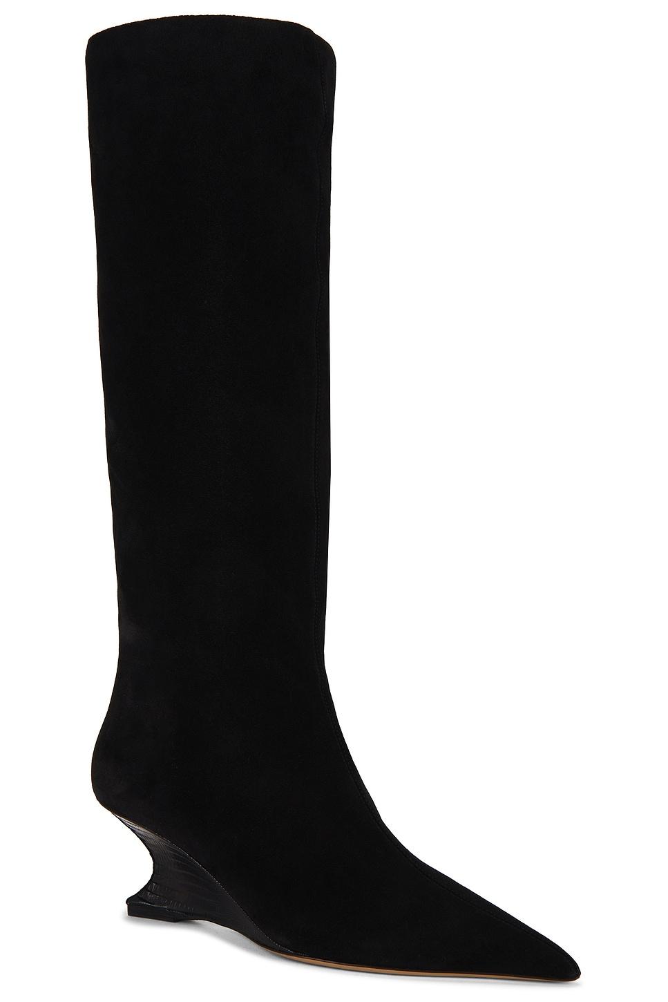 Suede upper with leather sole. Pull-on styling. Pointed toe. Wedge heel. Approx 65mm/ 2.5 inch wedgeApprox 381mm/ 15 inch shaftOpening measures approx 15" in circumference. Made in Italy. Revolve Style No. PRTX-WZ83. Manufacturer Style No. PX1702.