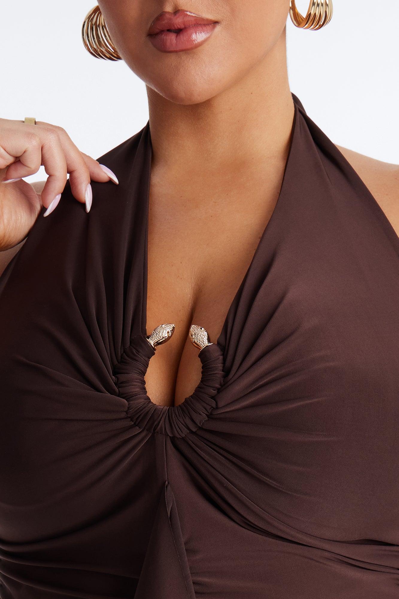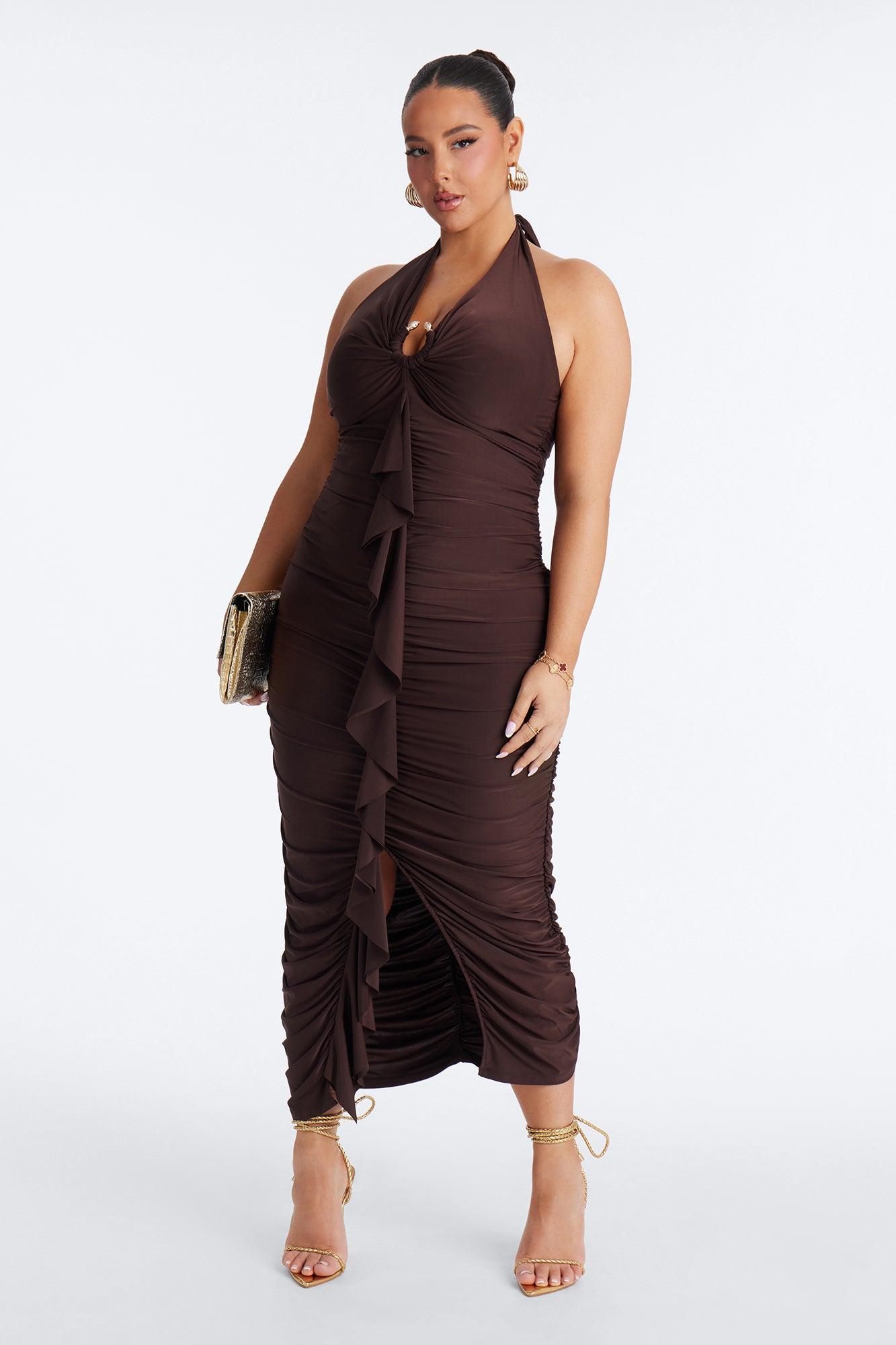 Available In Chocolate And Hot Pink. Midi Dress Deep V-Neckline Tie Halter Hardware Ruched Ruffle Detail Slit Backless Stretch Length Measured Flat = 47" Self: 95% Polyester 5% Spandex Imported California Proposition 65WARNING: Cancer and Reproductive Harm - www.P65Warnings.ca.gov.
