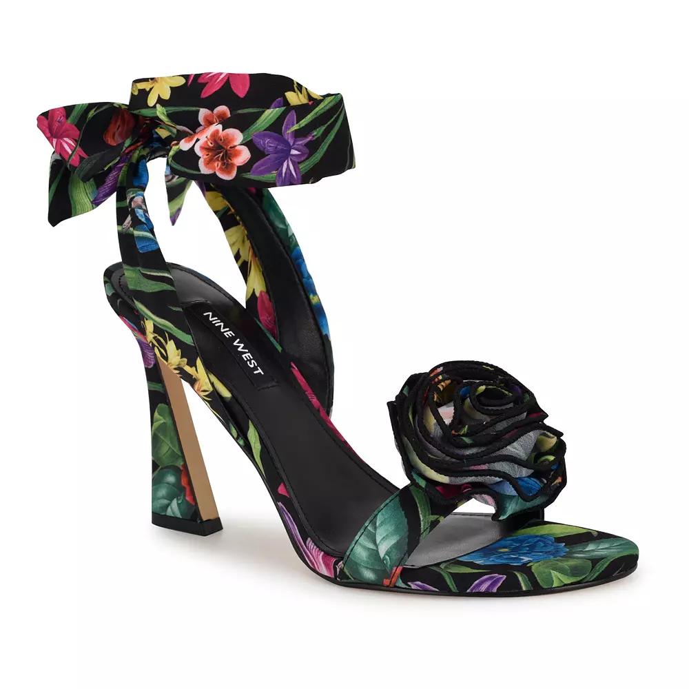 Elevate your style with these Nine West Krave Womens Dress Sandals. Click this FOOTWEAR GUIDE to find the perfect fit and more! Elevate your style with these Nine West Krave Womens Dress Sandals. Click this FOOTWEAR GUIDE to find the perfect fit and more! FEATURES Rose design upper Tapered heel Tie closure for a custom-like fitDETAILS Textile, satin upper Synthetic lining and outsole Open toe Tie closure 3.74-in. heel Spot clean Imported Size: 9.5. Color: Black Floral Team. Gender: female. Age Group: adult.