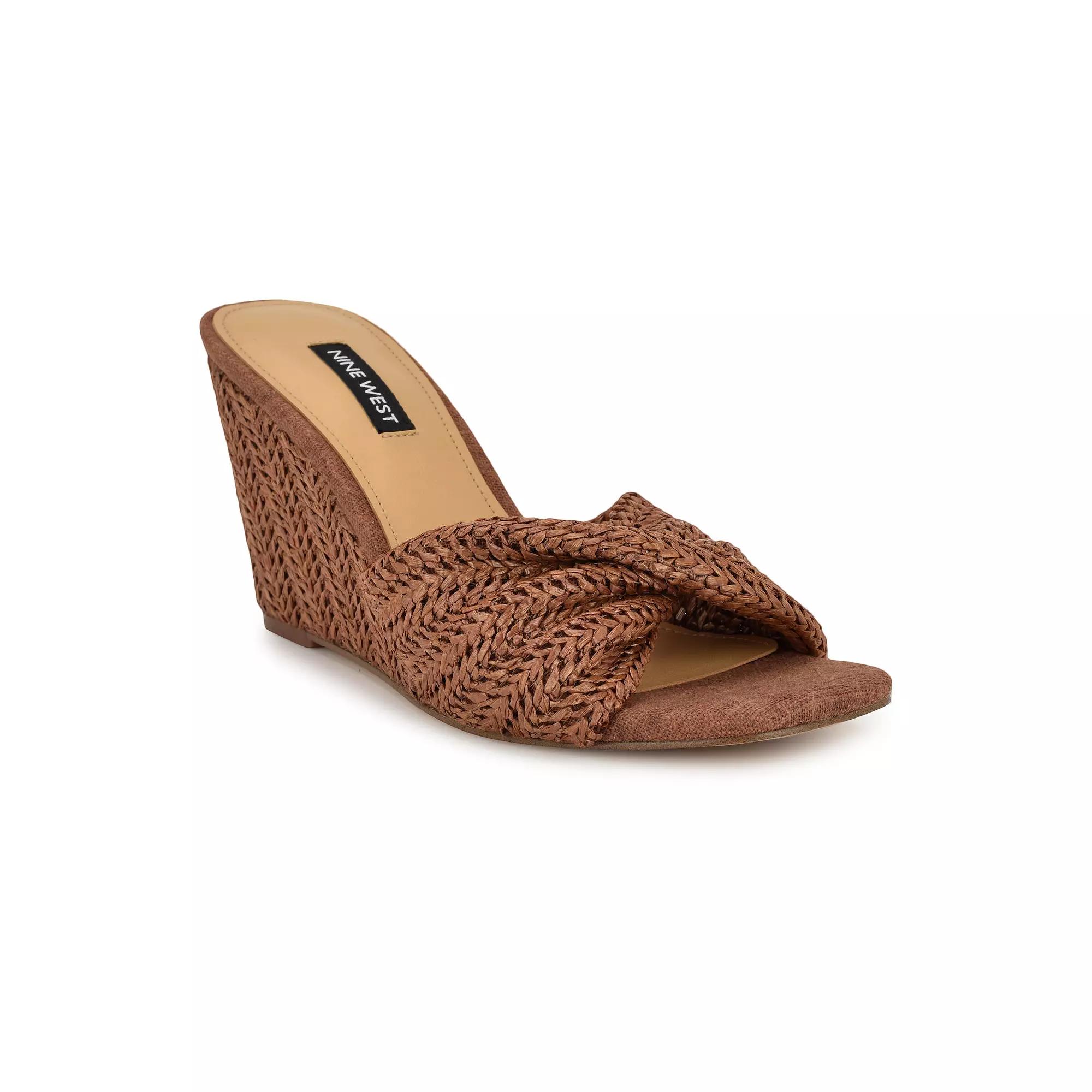 Update your summer wardrobe with these Nine West Nikhil women's wedge dress sandals. Click this FOOTWEAR GUIDE to find the perfect fit and more! Update your summer wardrobe with these Nine West Nikhil women's wedge dress sandals. Click this FOOTWEAR GUIDE to find the perfect fit and more! FEATURES Twisted band design Slip-on for easy on and offDETAILS Textile upper Polyurethane lining, midsole and outsole Open toe Slip-on 3.31-in. heel Spot clean Imported Size: 6. Color: Medium Brown. Gender: female. Age Group: adult.
