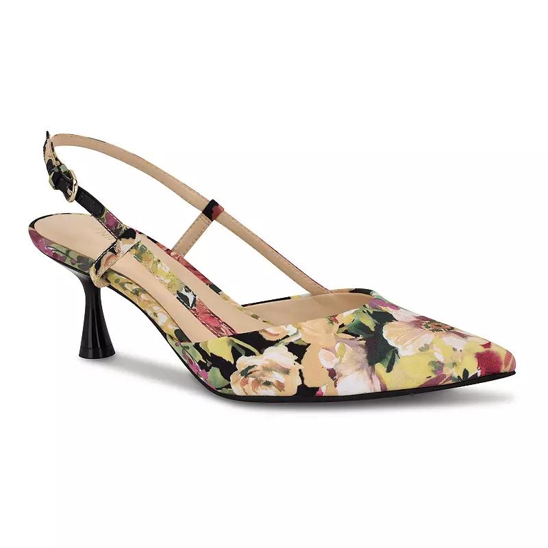 Step into style with these Nine West Rowen womens slingback dress pumps.Click this FOOTWEAR GUIDE to find the perfect fit and more! Step into style with these Nine West Rowen womens slingback dress pumps. Click this FOOTWEAR GUIDE to find the perfect fit and more! FEATURES Slingback strap Kitten heelDETAILS Faux leather, textile upper Manmade lining and outsole Pointed toe Buckle closure 2.17-in. heel Spot clean Imported Size: 7.5. Color: Black Fall Floral Mult. Gender: female. Age Group: adult.