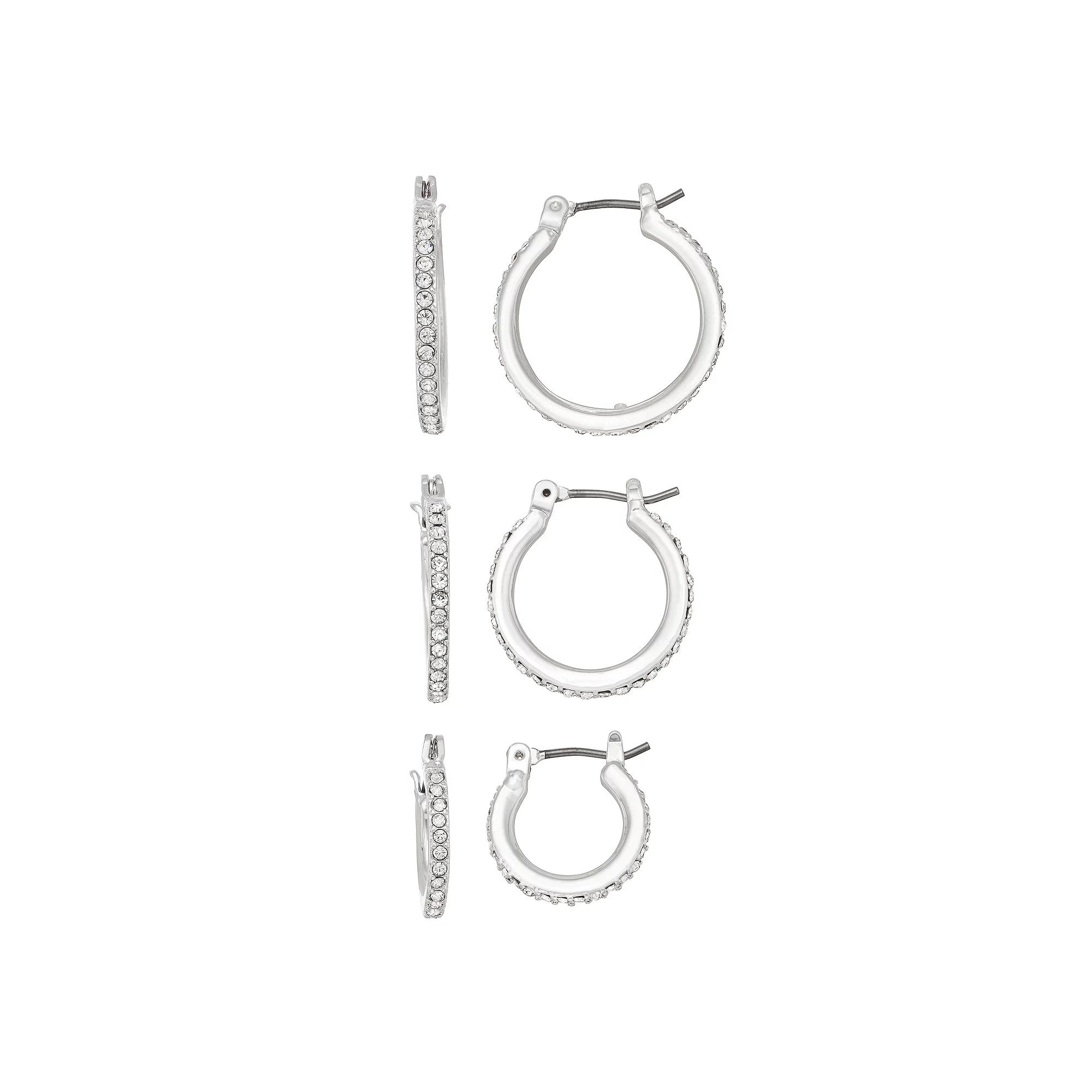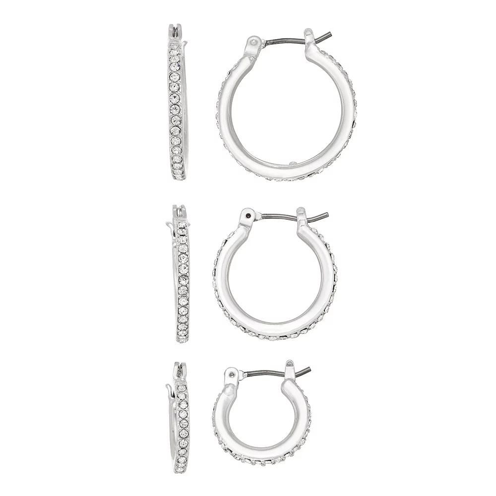Shimmer with style wearing earrings from this Nine West Silver Tone Crystal Hoop Earring Set. Click on this JEWELRY & WATCHES GUIDE to learn about fit, styles, materials and more! Shimmer with style wearing earrings from this Nine West Silver Tone Crystal Hoop Earring Set. Click on this JEWELRY & WATCHES GUIDE to learn about fit, styles, materials and more! FEATURES Includes: 3 pairs of earrings Diameter: 12 mm, 16 mm, 18 mm Backings: post Nickel safe Metal: alloy Material: glass Plating: silver tone Finish: polished Imported Not appropriate for children 14 years old and younger. Size: One Size. Gender: female. Age Group: adult.