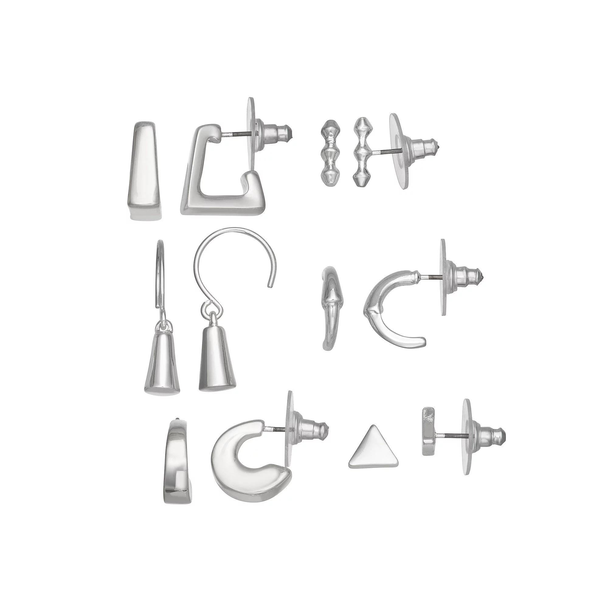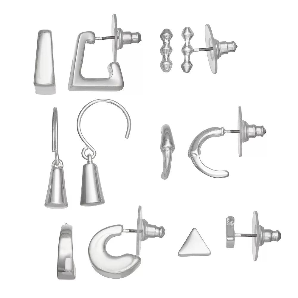 Refresh your jewelry collection with this Nine West silver-tone geometric 6-pair earring set. Featuring a mix of sleek shapes and polished finishes, these earrings offer endless styling possibilities for any outfit. Click on this JEWELRY & WATCHES GUIDE to learn about fit, styles, materials and more! Refresh your jewelry collection with this Nine West silver-tone geometric 6-pair earring set. Featuring a mix of sleek shapes and polished finishes, these earrings offer endless styling possibilities for any outfit. Click on this JEWELRY & WATCHES GUIDE to learn about fit, styles, materials and more! FEATURES Includes: 6 pairs of earrings Lengths: 6.7 mm / 10 mm / 12.6 mm / 13.4 mm / 13.8 mm / 21 mm Backings: post Nickel safe Metal: alloy Plating: silver tone Finish: polished Size: One Size. Gender: female. Age Group: adult.