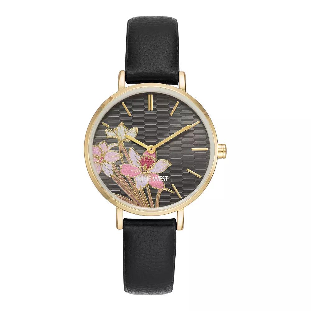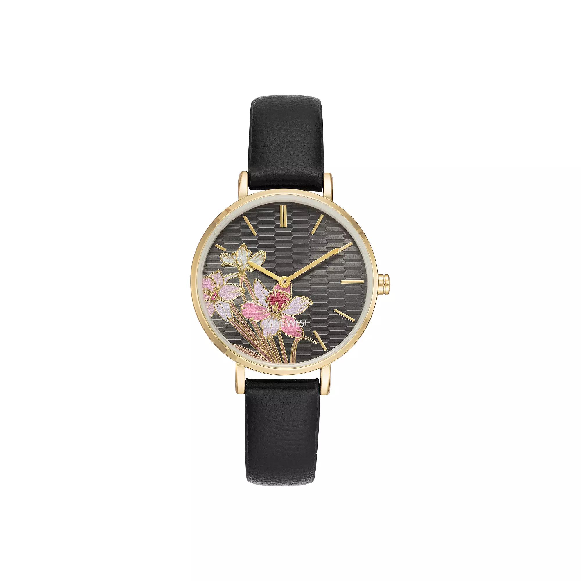 Accessorize in style with this Nine West Womens Flower Dial Black Strap Watch. Click on this JEWELRY & WATCHES GUIDE to learn about fit, styles, materials and more! Accessorize in style with this Nine West Womens Flower Dial Black Strap Watch. Click on this JEWELRY & WATCHES GUIDE to learn about fit, styles, materials and more! DISPLAY Face cover material: mineral crystalCASE Material: metal alloy Caseback material: stainless steel Diameter: 36 mmBAND Band type: strap Material: faux leather Clasp: buckle Lug width: 14 mm Band length: 150 mm - 190 mmDETAILS Movement: quartz Power: battery Water resistance: splash-proof Packaging: gift boxed Warranty: manufacturers lifetime limited For warranty information please click here Imported Size: One Size. Gender: female. Age Group: adult.
