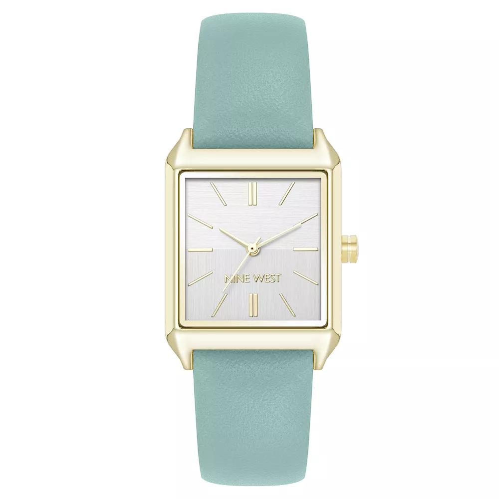 Refresh your style with the Nine West Womens Gold Tone Square Case Watch with a mint strap. The cool mint strap and warm gold-tone case combine for a fresh and trendy aesthetic. Click on this JEWELRY & WATCHES GUIDE to learn about fit, styles, materials and more!Refresh your style with the Nine West Womens Gold Tone Square Case Watch with a mint strap. The cool mint strap and warm gold-tone case combine for a fresh and trendy aesthetic. Click on this JEWELRY & WATCHES GUIDE to learn about fit, styles, materials and more!FEATURES 24 mm x 29 mm polished rectangular alloy case with a lacquer finish offers a sleek and modern look Silver-white two-zone brushed dial with gilt stick markers adds elegance and readability Polished stainless steel buckle with laser-engraved Nine West logo provides a secure closure Gilt stick hands with pointed ends and sweep movement enhance readability and sophisticationDISPLAY Face cover material: mineral crystalCASE Material: metal alloy Caseback material: stainless steel Diameter: 24 mmBAND Band type: strap Material: vegan leather Clasp: buckle Lug width: 16 mm Band length: 140 mm - 175 mmDETAILS Movement: quartz Power: battery Water resistance: splash-proof Packaging: boxed Imported Manufacturers lifetime limited warranty: For warranty information please click here Size: One Size. Color: Multi. Gender: female. Age Group: adult.