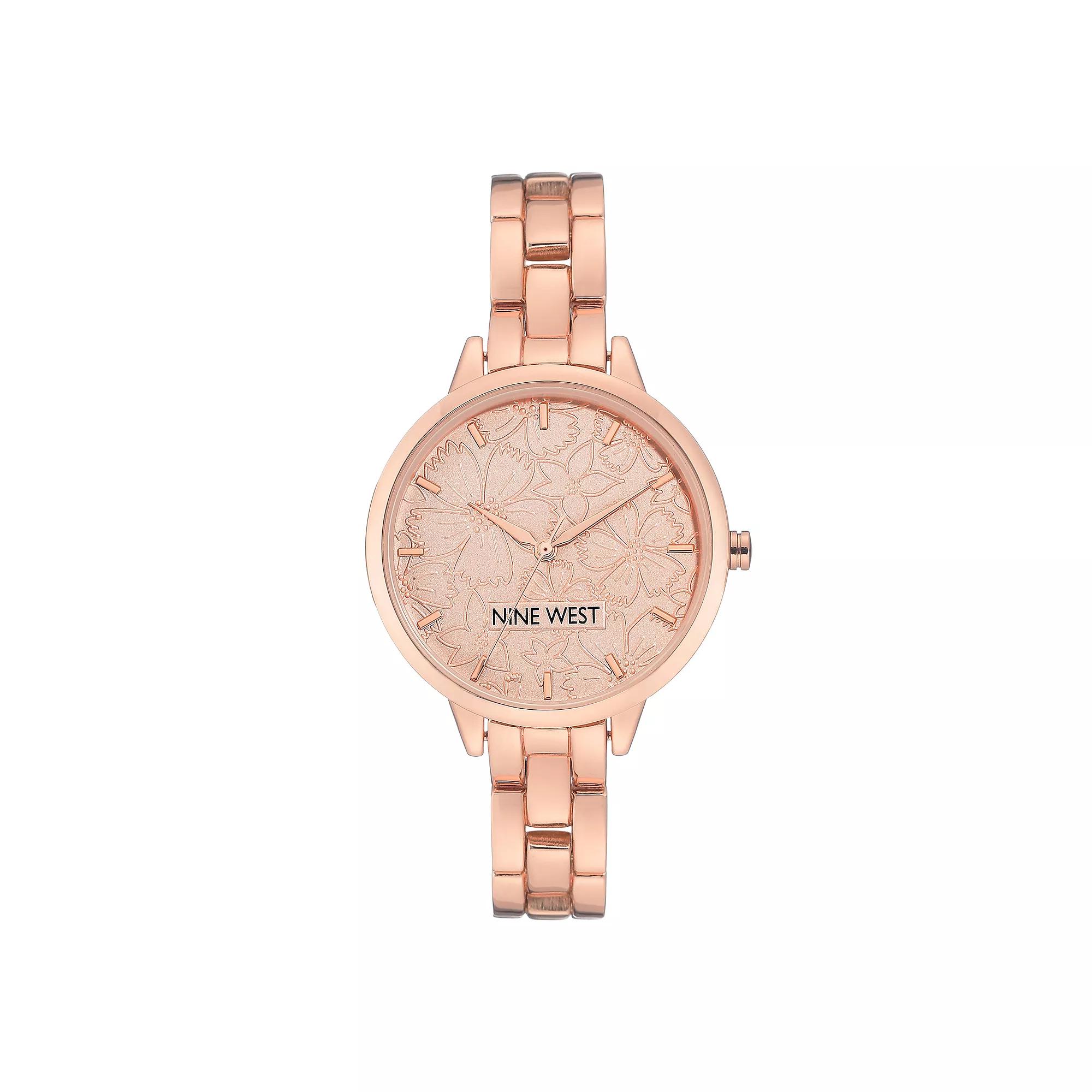 Featuring an etched floral dial and a polished adjustable link bracelet, this women's Nine West watch adds a chic finishing touch to your look. Featuring an etched floral dial and a polished adjustable link bracelet, this women's Nine West watch adds a chic finishing touch to your look. DISPLAY Face cover material: mineral crystalCASE Material: metal Caseback material: stainless steel Diameter: 36 mmBAND Band type: metal link bracelet Clasp: jewelry Circumference: 185 mm - 190 mm Width: 12 mmDETAILS Movement: quartz Power: battery Packaging: gift boxed Warranty: manufacturer's lifetime limited For warranty information please click here Size: Medium. Color: Pink. Gender: female. Age Group: adult.