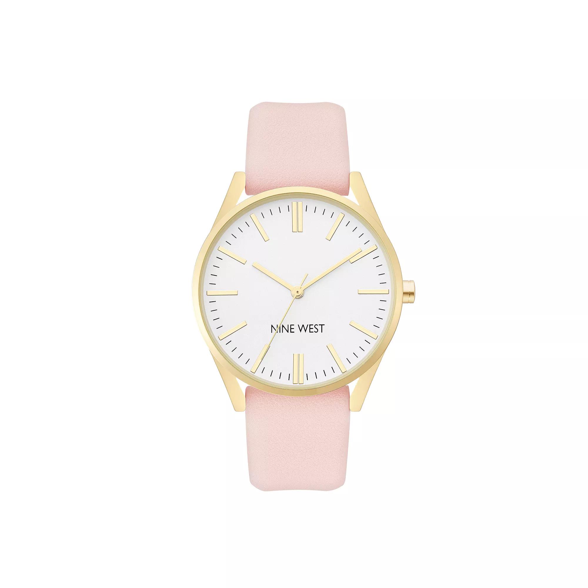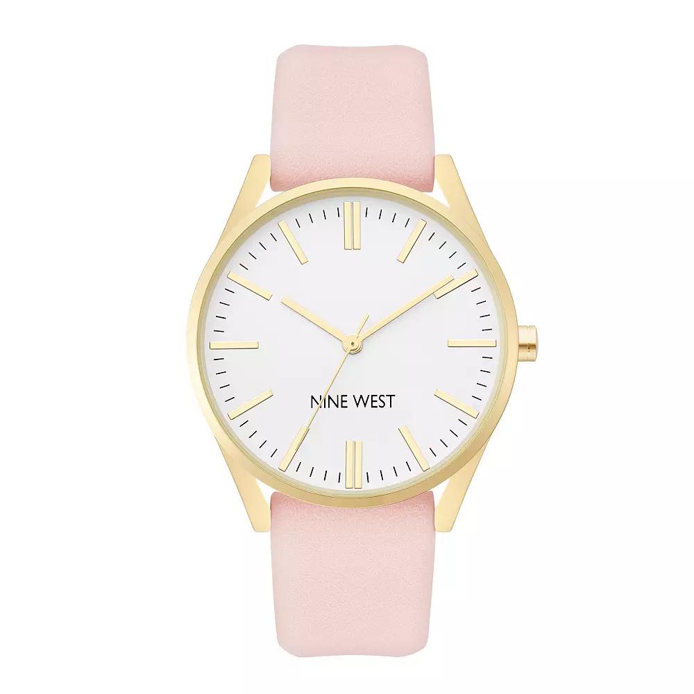 Featuring a white dial and gold-tone case secured with a faux leather band, this Nine West watch offers a classic look that will never go out of style. Featuring a white dial and gold-tone case secured with a faux leather band, this Nine West watch offers a classic look that will never go out of style. DISPLAY Matte dial Face cover material: mineral crystalCASE Material: gold tone metal Caseback material: stainless steel Diameter: 36 mmBAND Band type: faux leather strap Clasp: buckle Circumference: 185 mm - 190 mm Width: 17 mmDETAILS Movement: quartz Power: battery Packaging: gift boxed Warranty: manufacturers lifetime limited For warranty information please click here Size: Medium. Color: Pink. Gender: female. Age Group: adult.