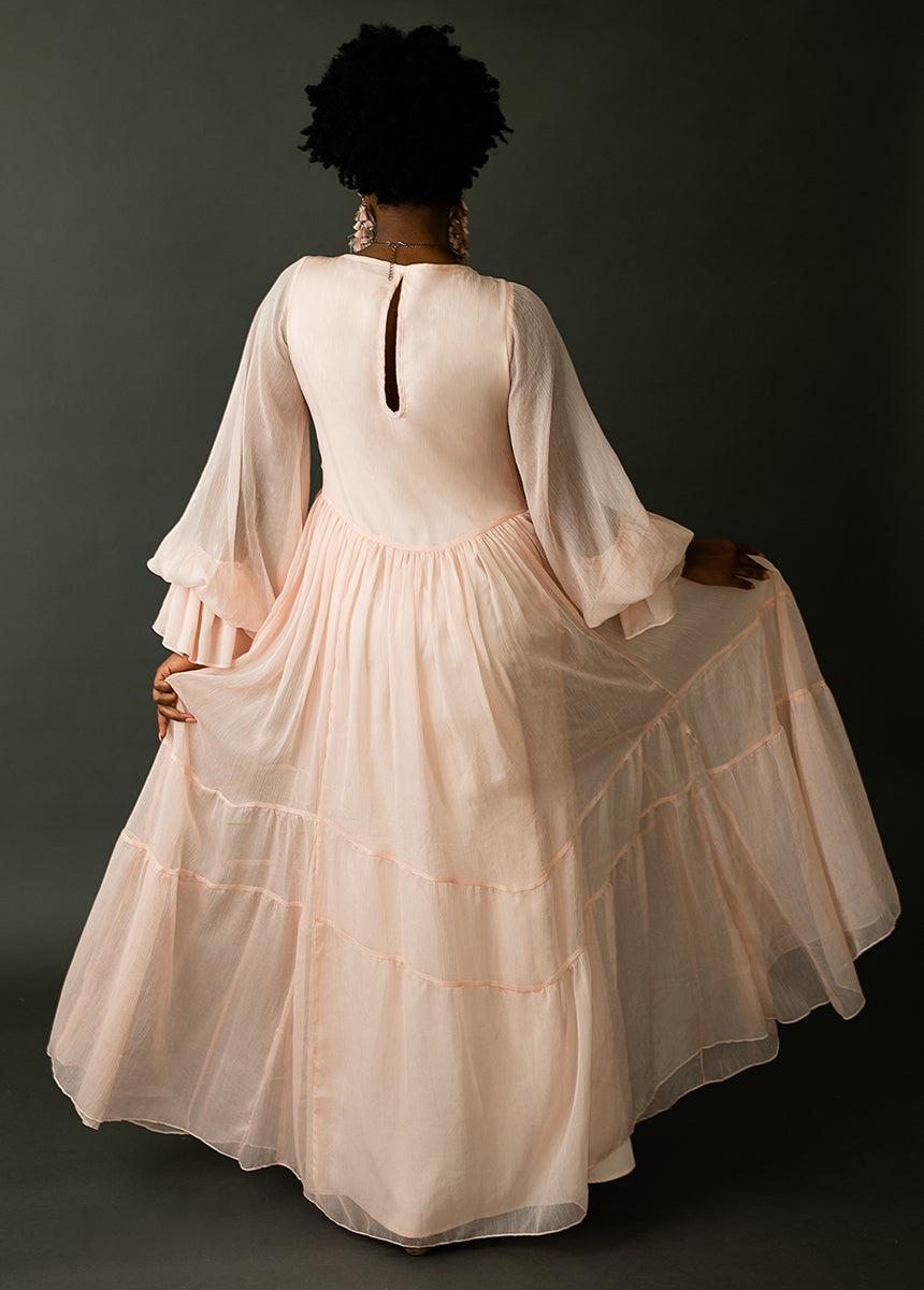 A feminine dress with delicate details gives the perfect boho flare that you can wear anywhere. Gathering Bishop sleeves with ruffle cuff Elastic sleeve cuff Curved waistband Keyhole at back Princess seam gores Body is fully lined, sleeves un-lined Functional button down front Self : 100% polyester // lining : 94% polyester, 6% spandex Hand wash, line dry Model is 5'6" wearing a size S