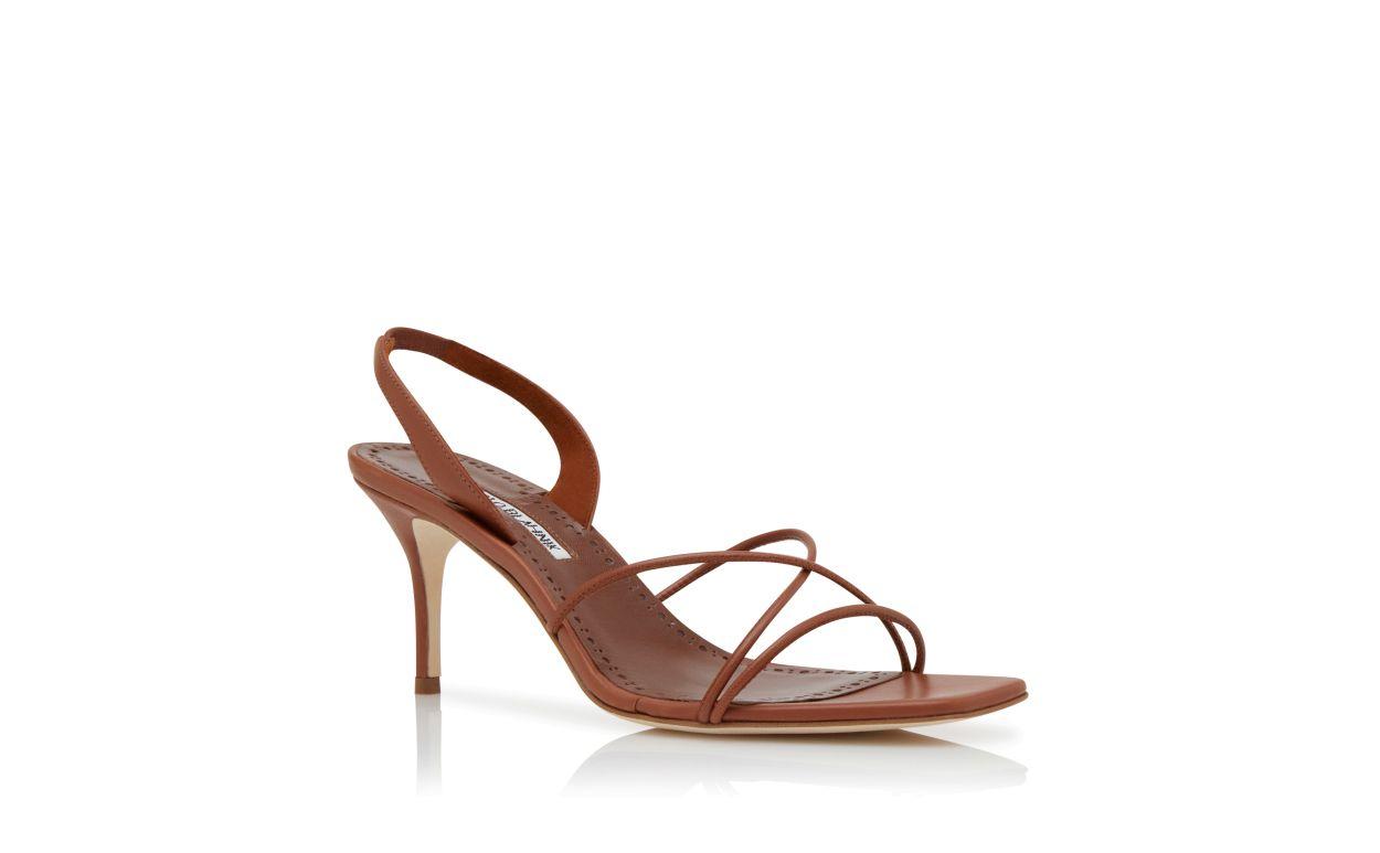 Brown nappa leather open toe slingback sandals featuring thin front strap detailing and stiletto mid heel.