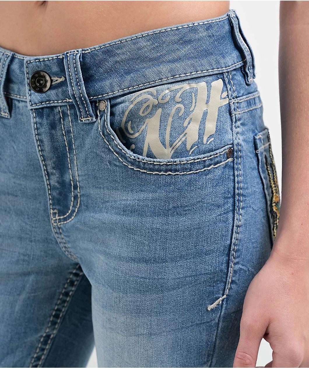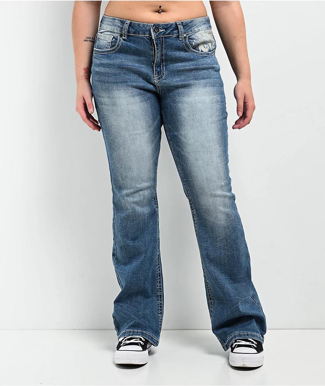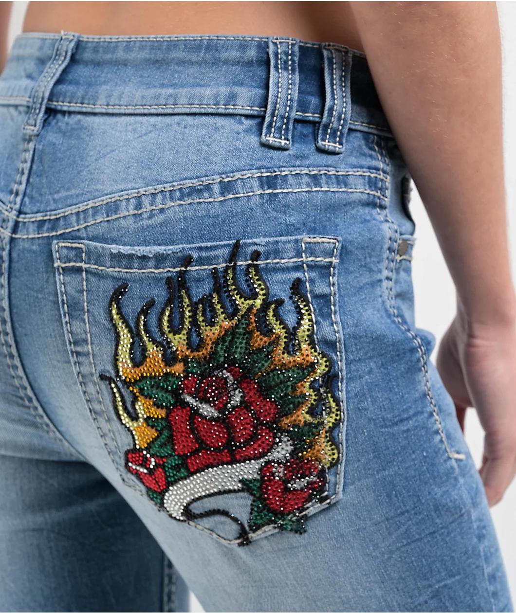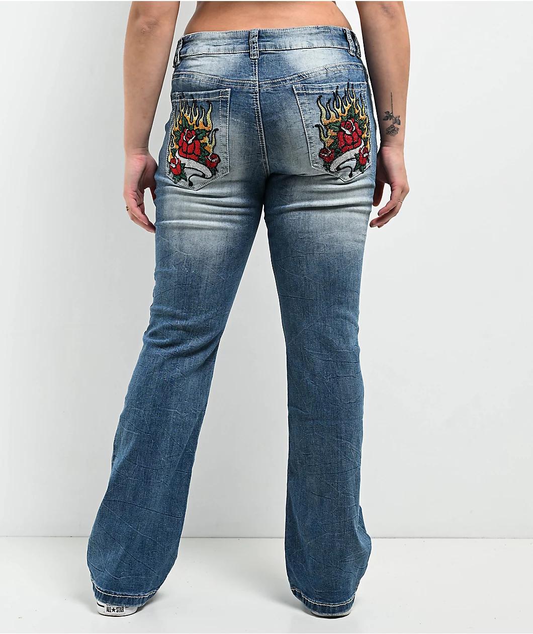 Add a classic Y2K undertone to your outfit with the Alyssia Rose rhinestone jeans from Ninth Hall in a blue-washed colorway. Providing a mid-rise boot cut fit, these pants have white contrast stitched detailing cultivating a fierce look. Whether you
