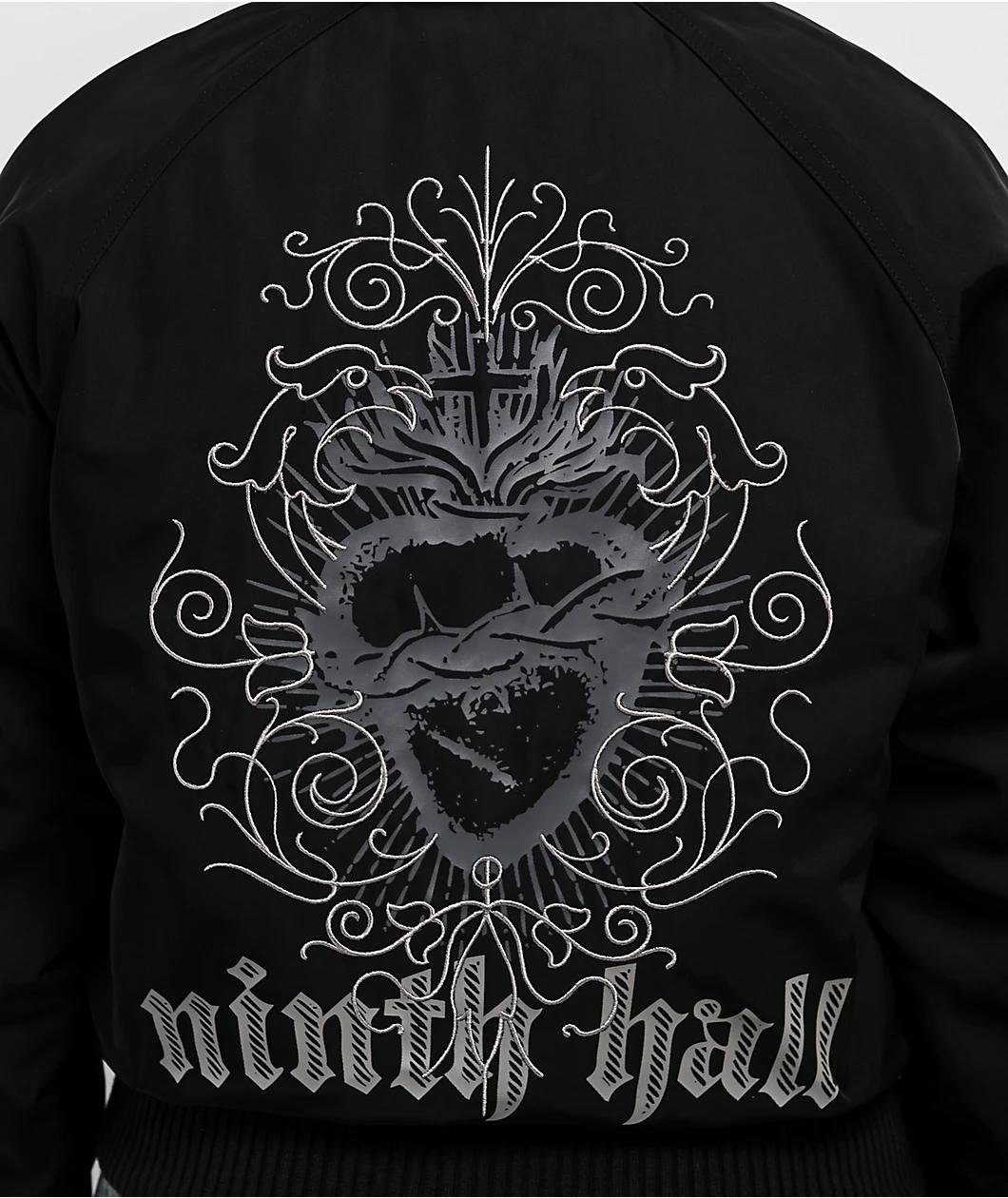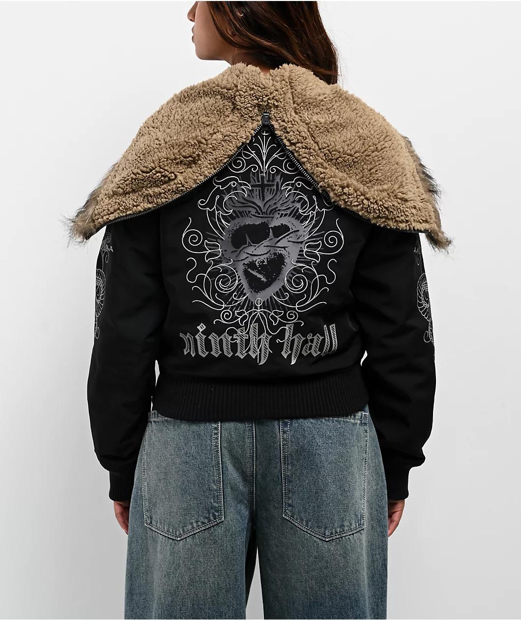 The Ayla hooded bomber jacket arrives from Ninth Hall in a black colorway. The hood boasts a warm faux fur trim, while screen printed and embroidered graphics throughout give the warm jacket an alternative Y2K vibe. The hood zips open and snaps toget