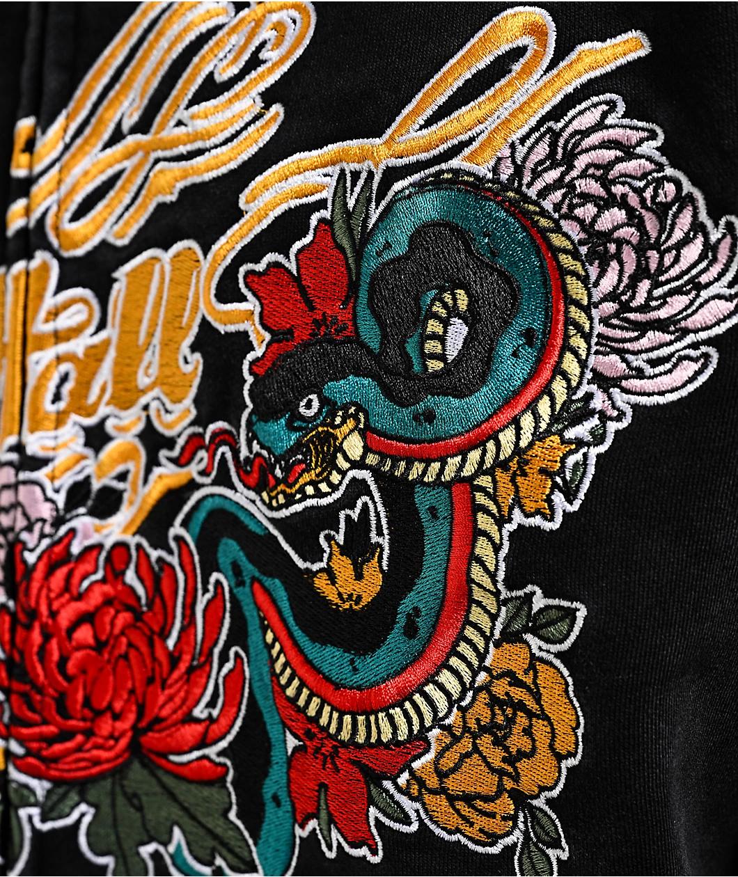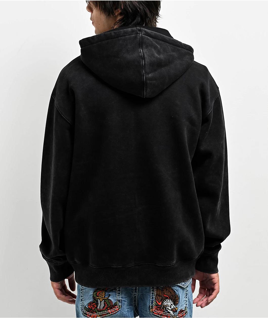 With a mineral wash treatment for a distressed look, the Big Moves zip hoodie from Ninth Hall is perfect for a casual outfit. The black sweatshirt features an embroidered graphic on the chest of a teal snake winding through a field of flowers with go