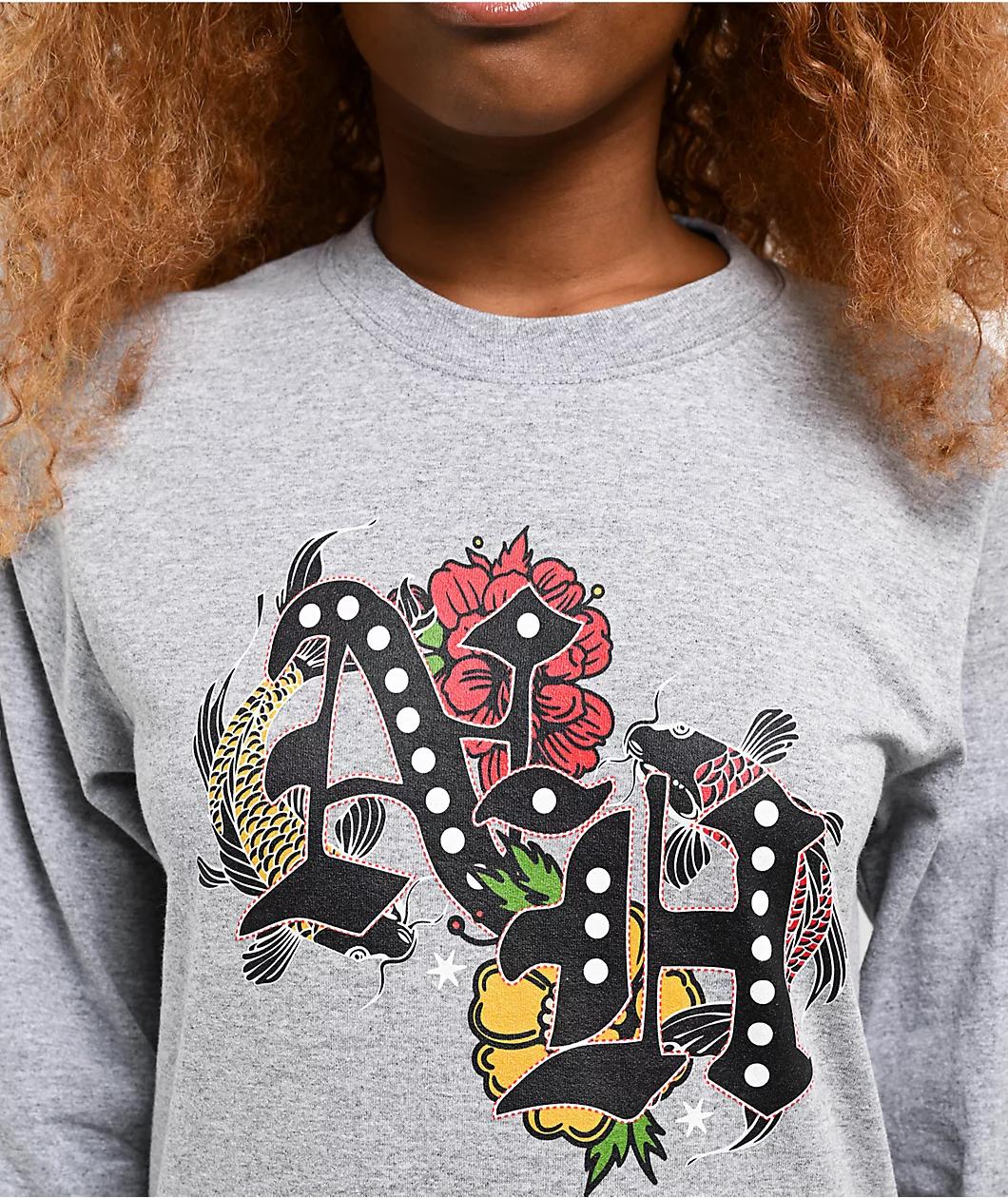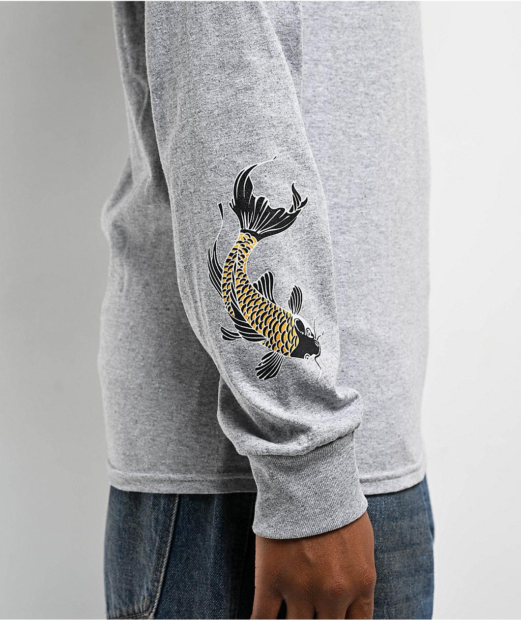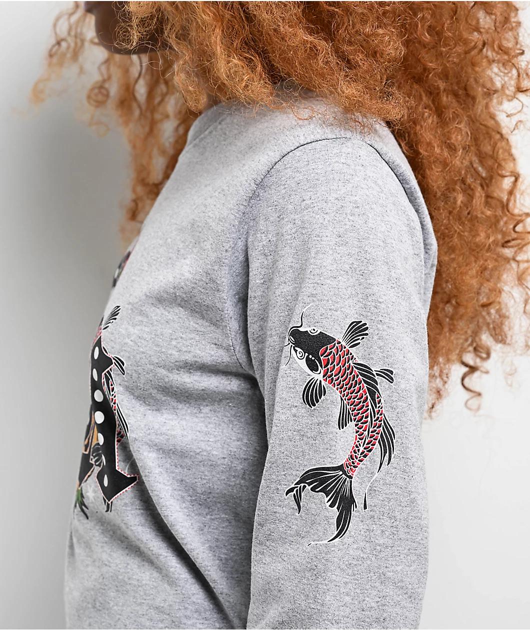The folks at Ninth Hall present the Crazy Town heather grey long sleeve t-shirt. Delivering a streetwear vibe, the front of the tee shows "NH" in an Old English font decorated with koi fish and flowers while the sleeves display cohesive imagery, for