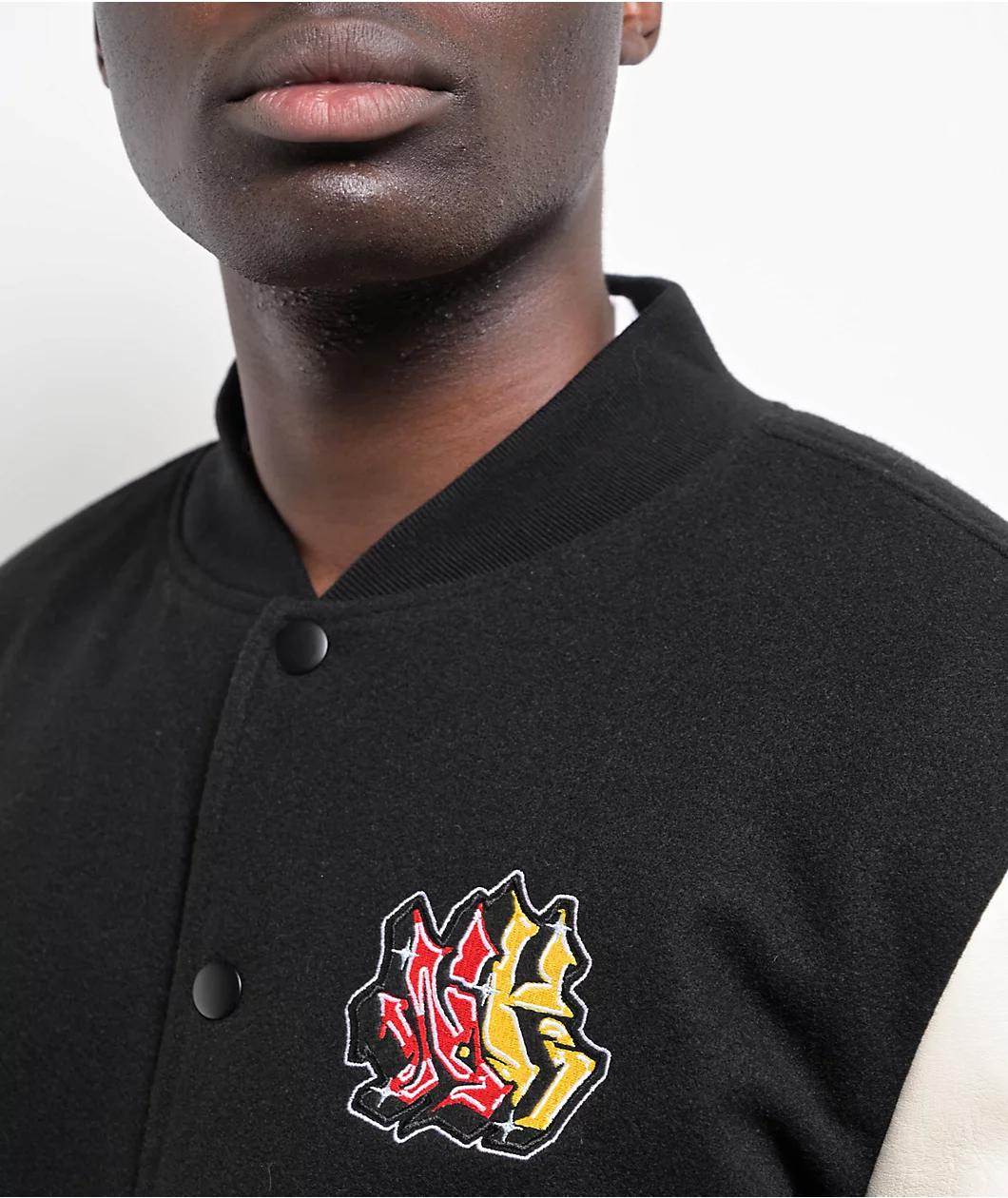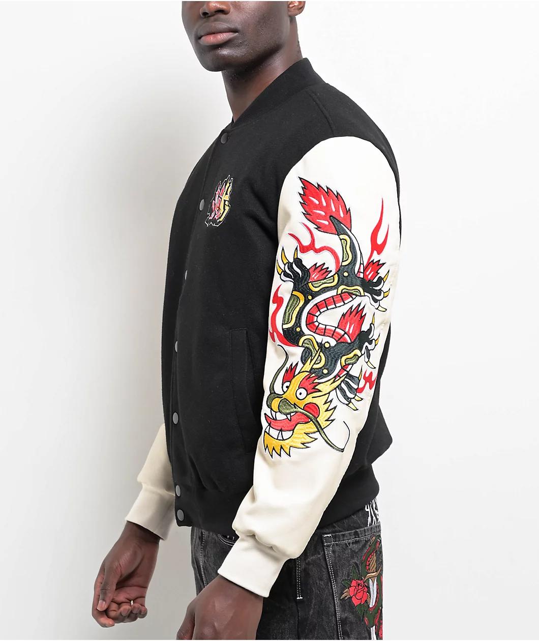 Designed by Ninth Hall with an athletic inspiration, the Dragon varsity jacket arrives in a black and cream two-tone colorway with a full button closure and luxurious embroidery throughout. Showcasing Japanese-influenced artwork, the collegiate coat