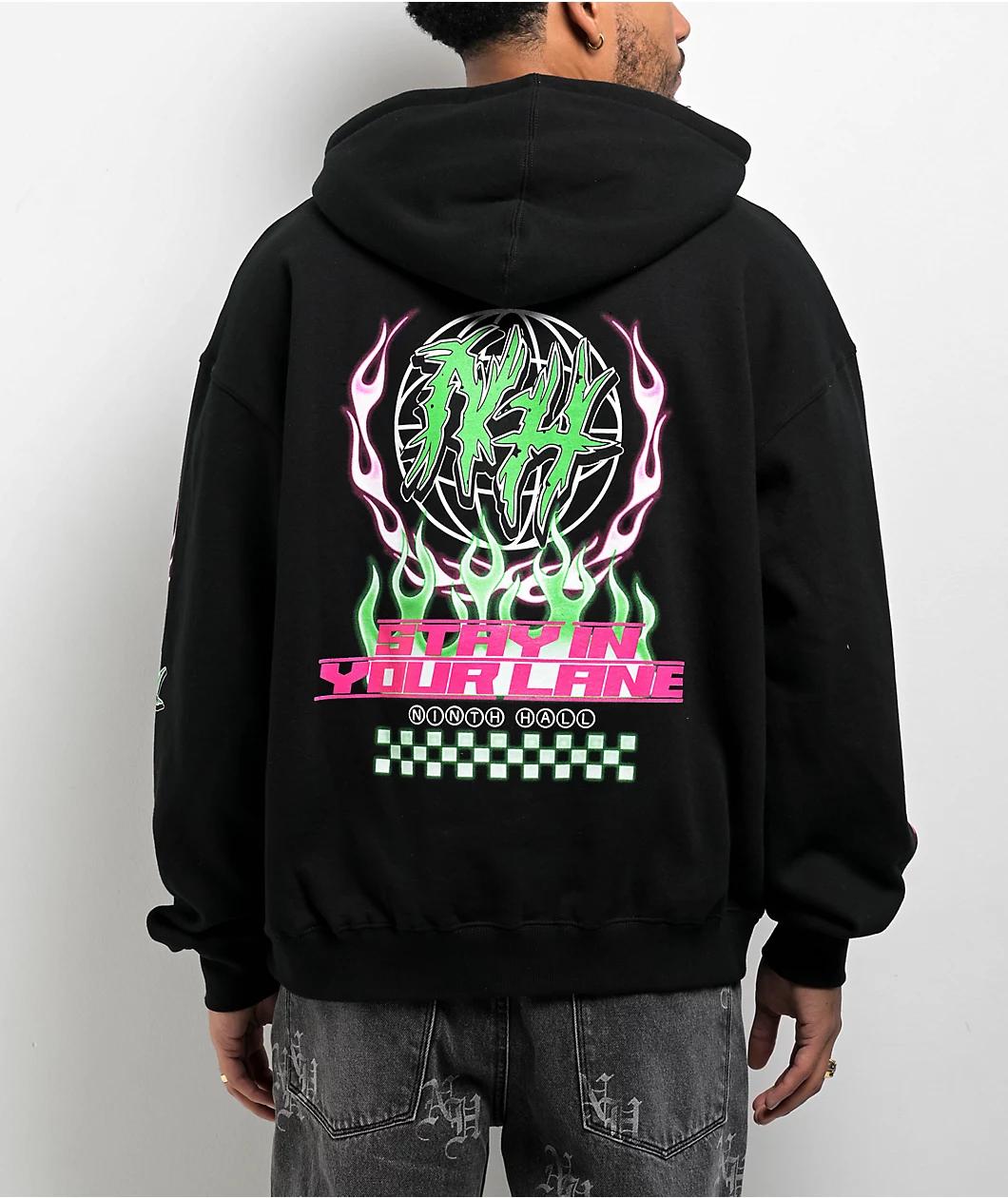 Ninth Hall offers the Drifters hoodie in a black cotton blend with loud, vibrant graphics screen-printed on the front, back, and sleeves. Inspired by raceways and motorsports imagery, the front of the comfy sweatshirt utilizes a cyber silgilism backg