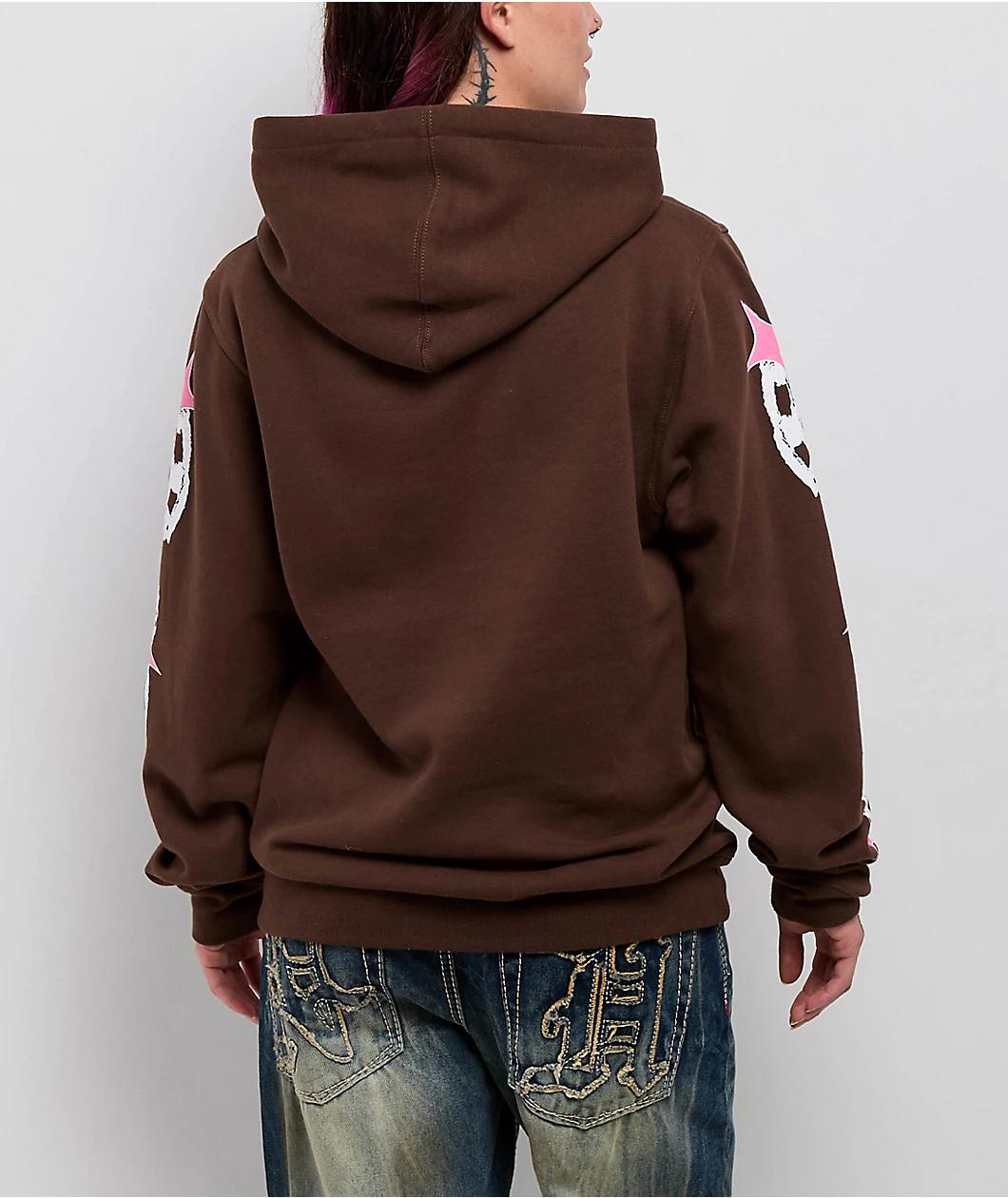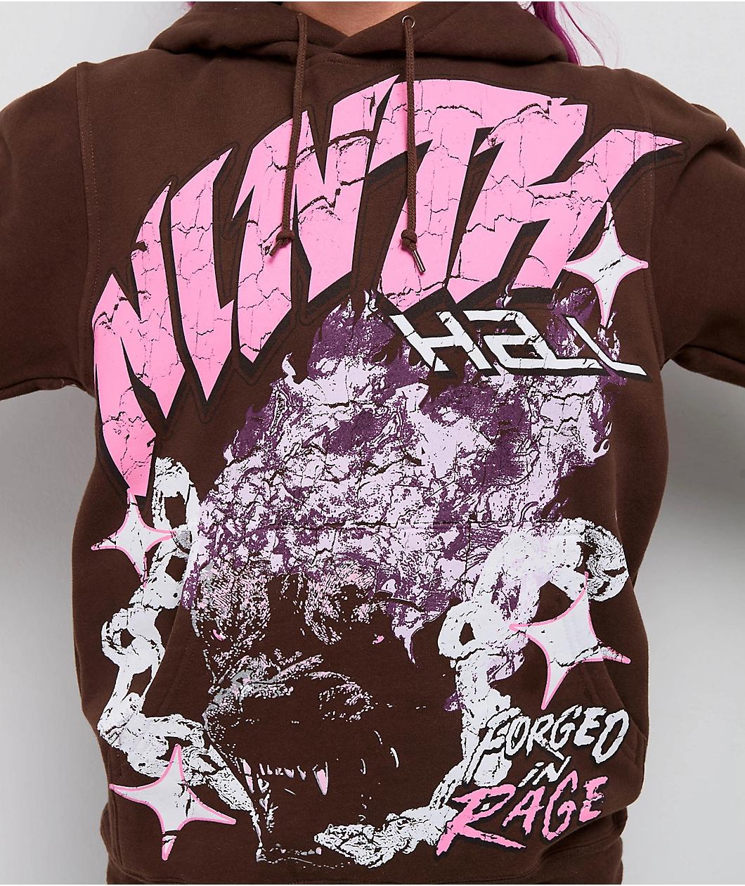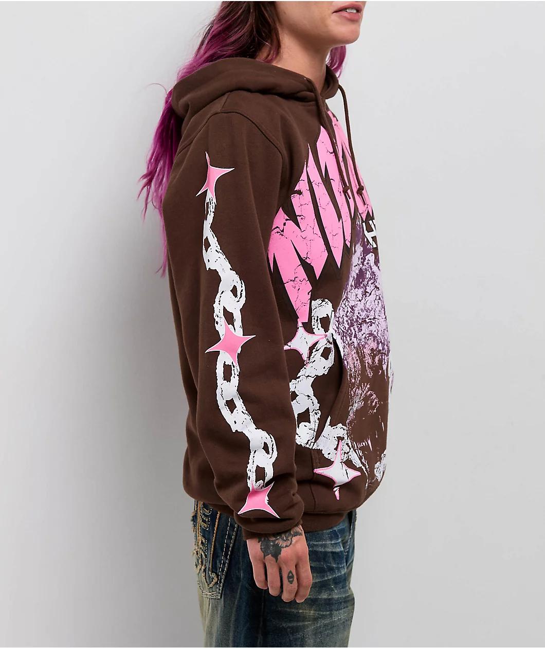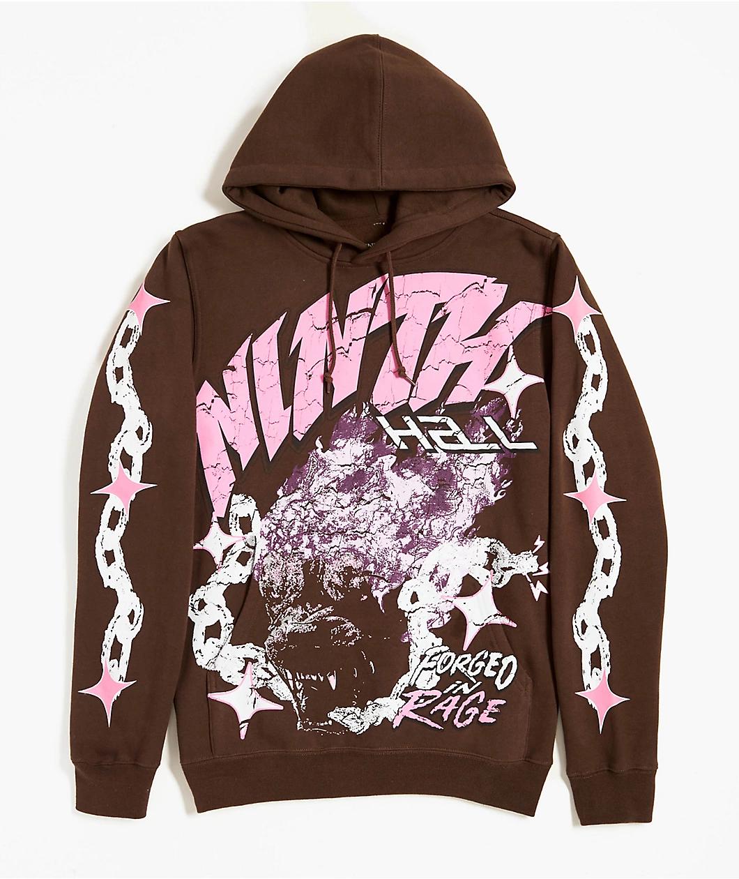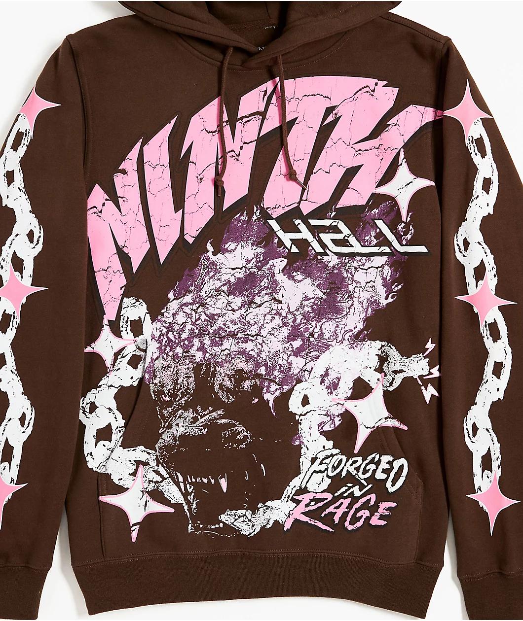 Add bold alternative style to any outfit with the Forged In Rage brown hoodie from Ninth Hall. Pink branding adorns the front alongside white and purple flaming chain graphics. Additional chains decorate both sleeves of the soft pullover for an eye-c