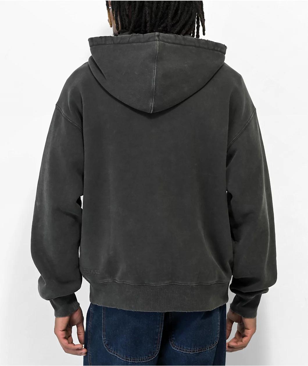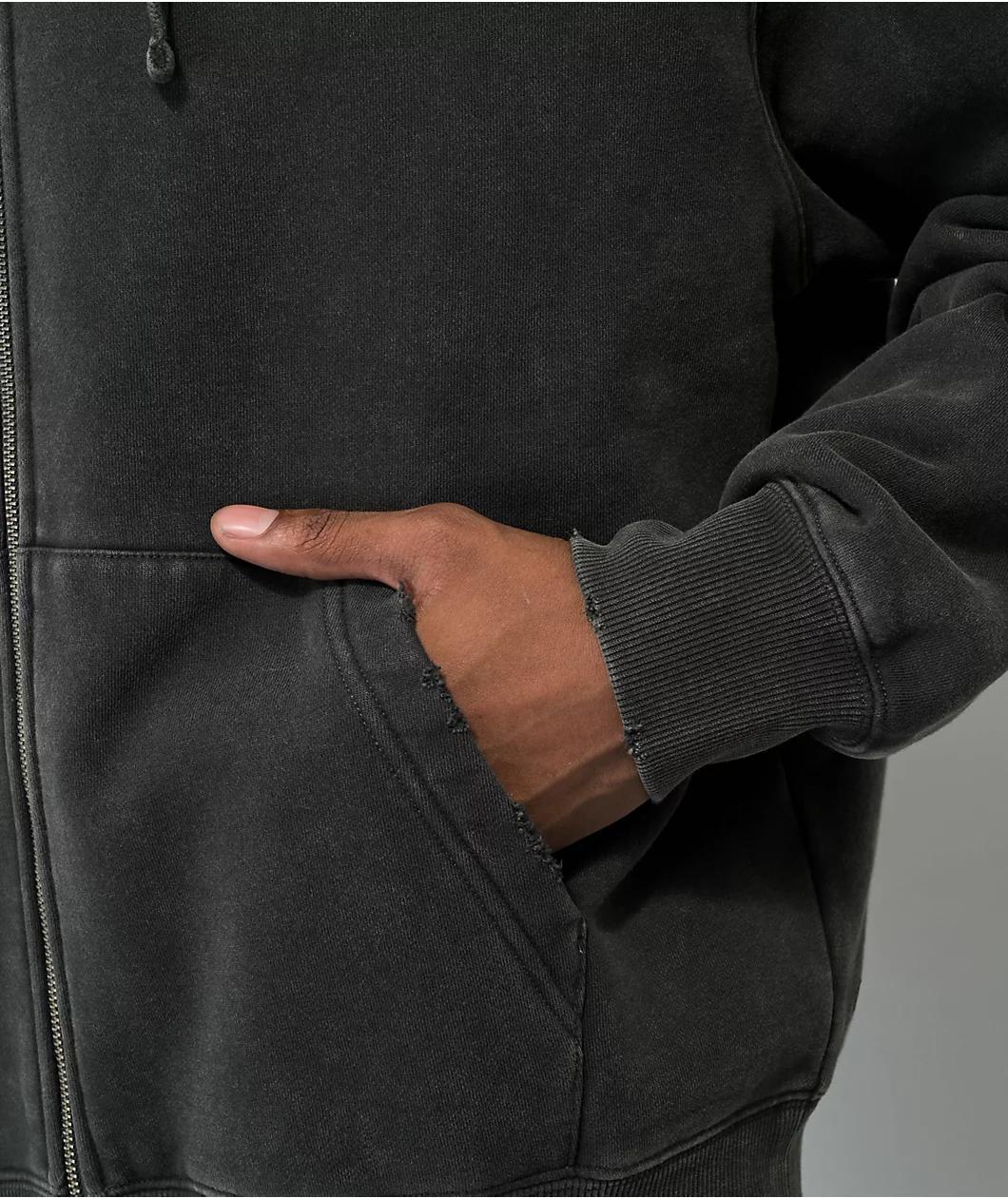 Treated with an ash vintage wash, this Ninth Hall Fundamentals zip hoodie features subtle distressed accents along the collar and cuffs. The full zip design features a minimalist logo graphic on the left chest, while a drawstring hood, hand pockets, and a