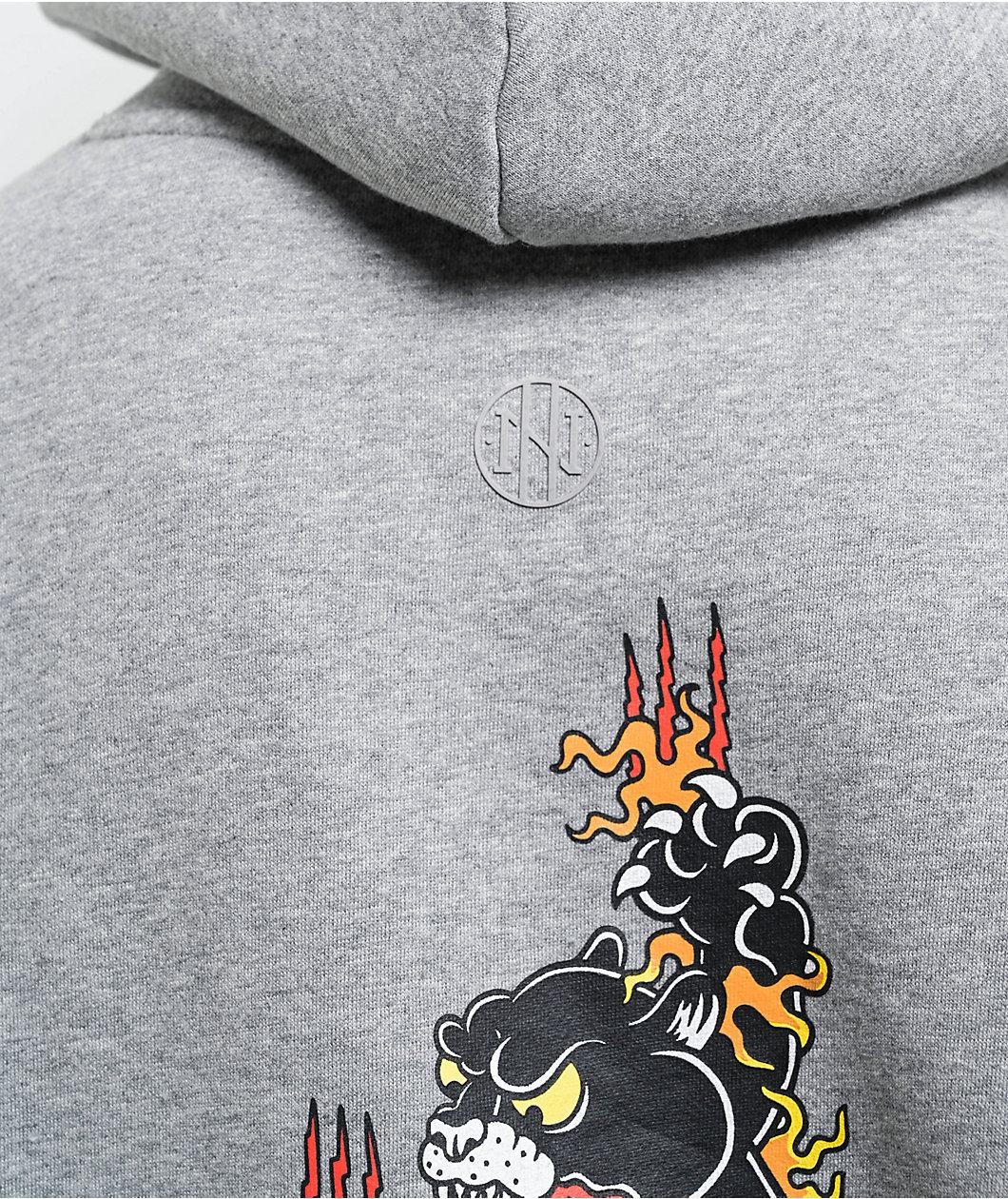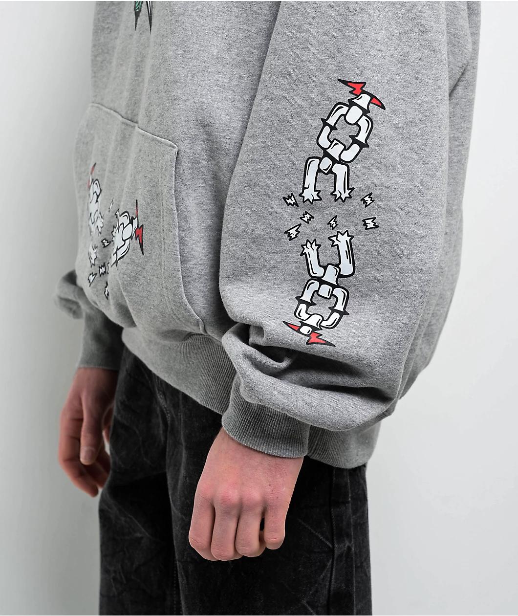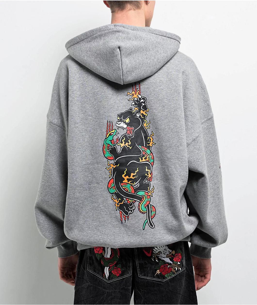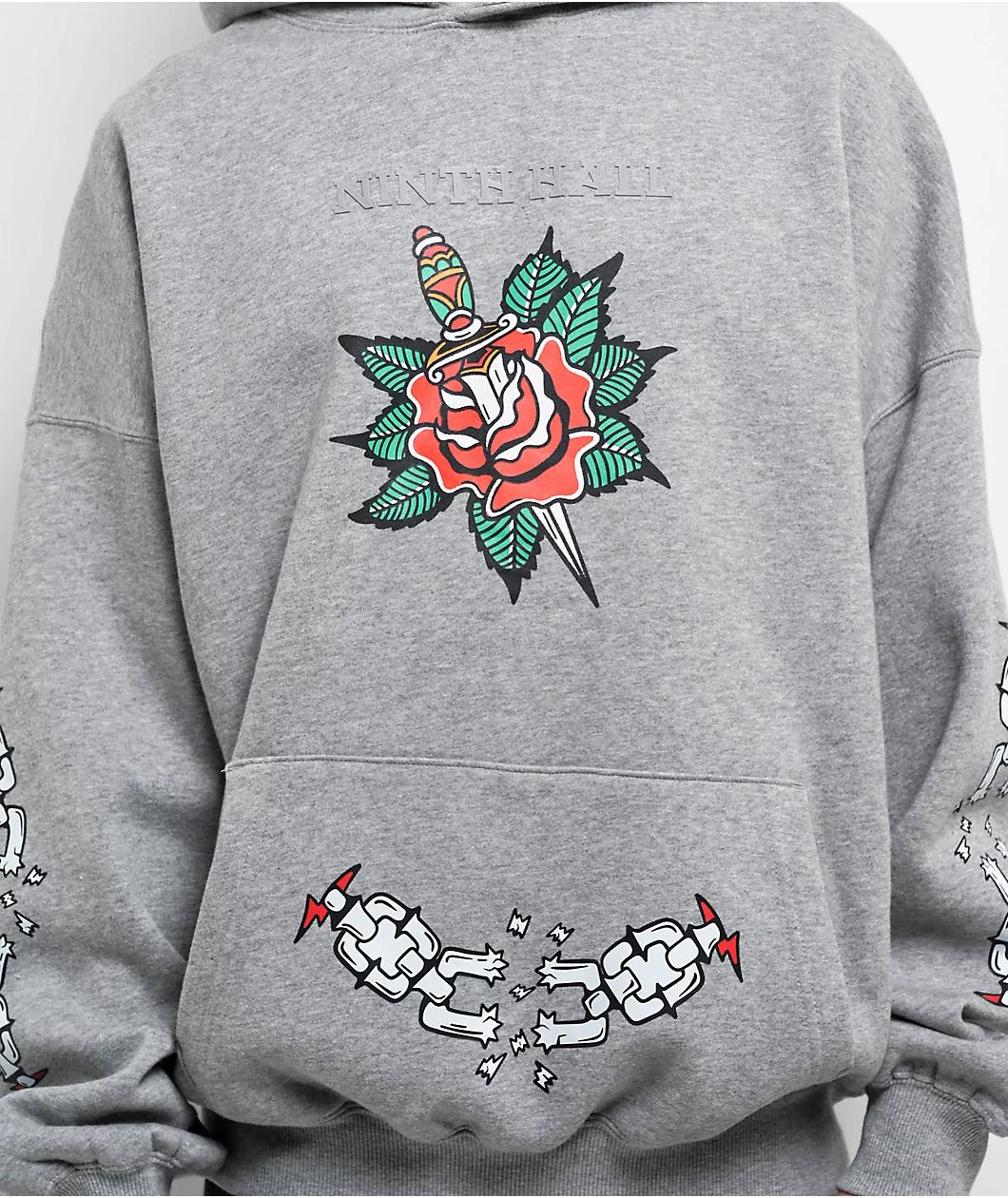 Add a classic alternative vibe to any outfit with the Tattoo Flash hoodie from Ninth Hall Fundamentals. The grey pullover features vintage Tattoo-style artwork throughout the front, sleeves, and back of roses, panthers, and broken chains for timeless