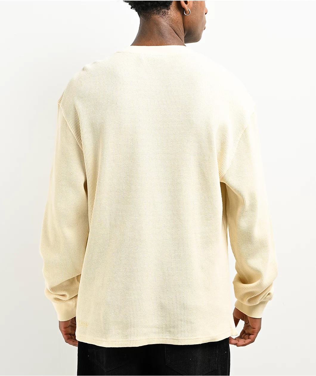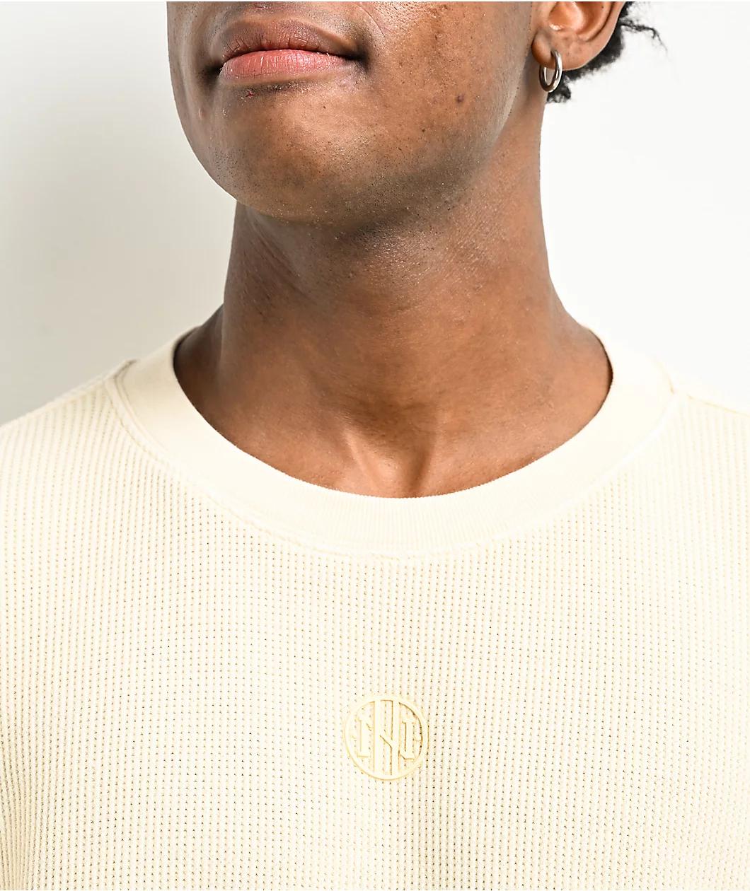 Built with a waffle-knit construction using a "Birch" beige colorway, Ninth Hall presents the thermal long sleeve t-shirt from the Fundamentals collection. Made from a soft cotton blend, the cream-colored shirt employs high-density, screen-printed br