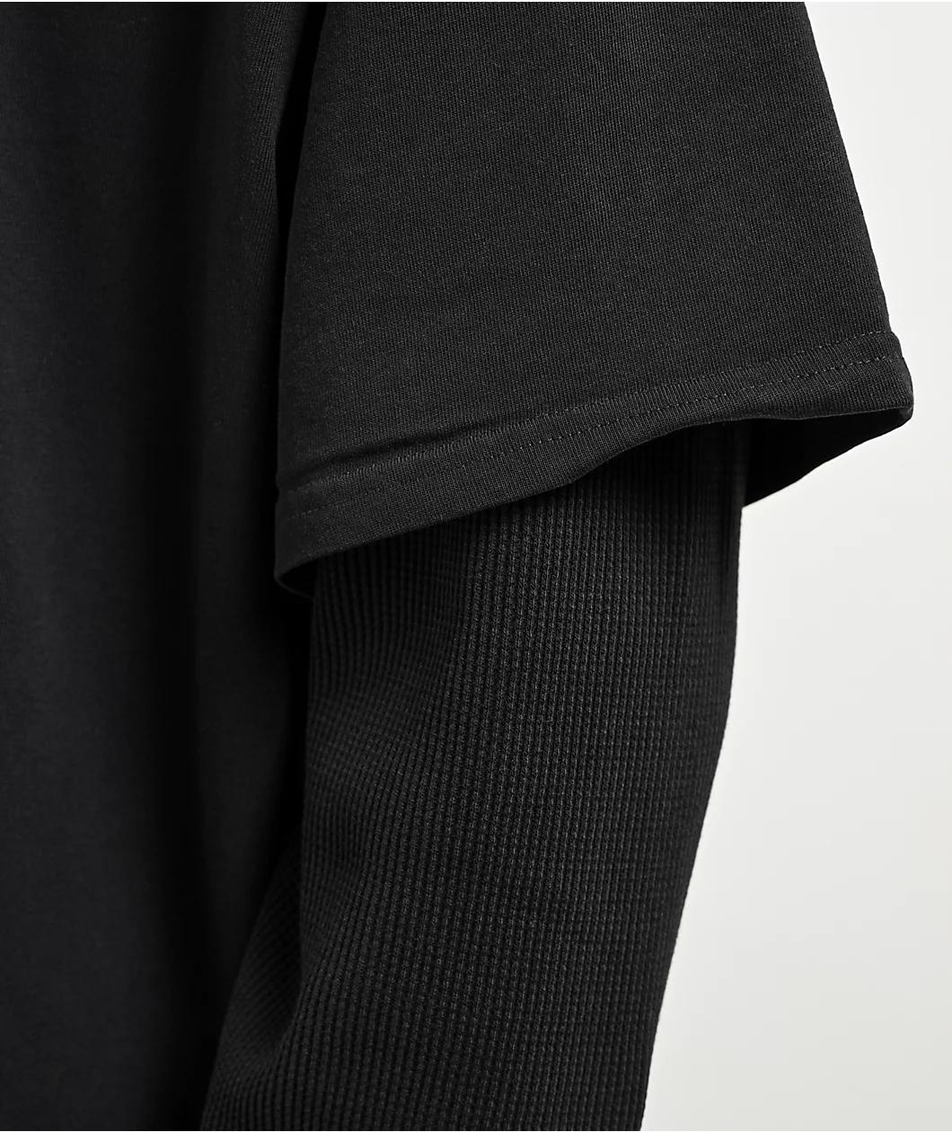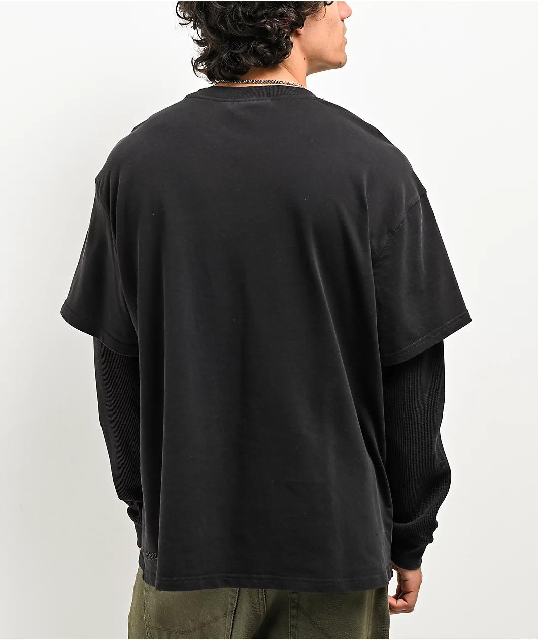 Treated with a black vintage wash for a faded effect, this long sleeve 2fer from the Ninth Hall Fundamentals collection is a versatile wardrobe addition. Layering an oversized tee with thermal long sleeves, this 90s inspired piece features a subtle t